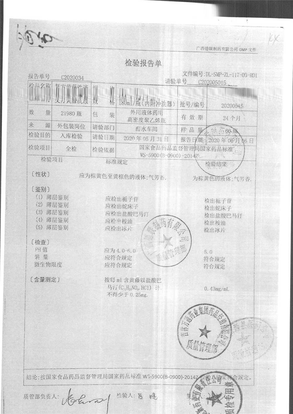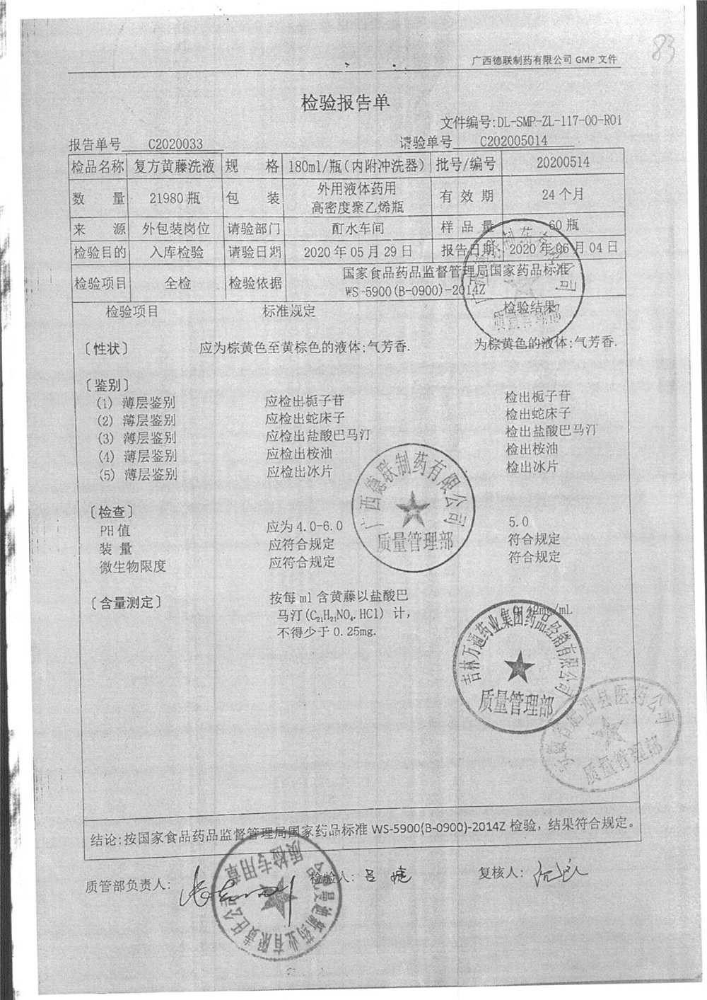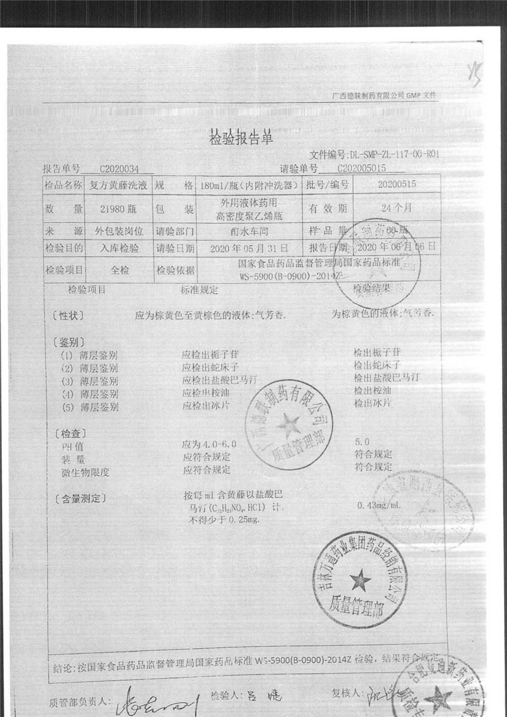 | 复方黄藤洗液 | 180ml | 20200515 | 查看详情 |
