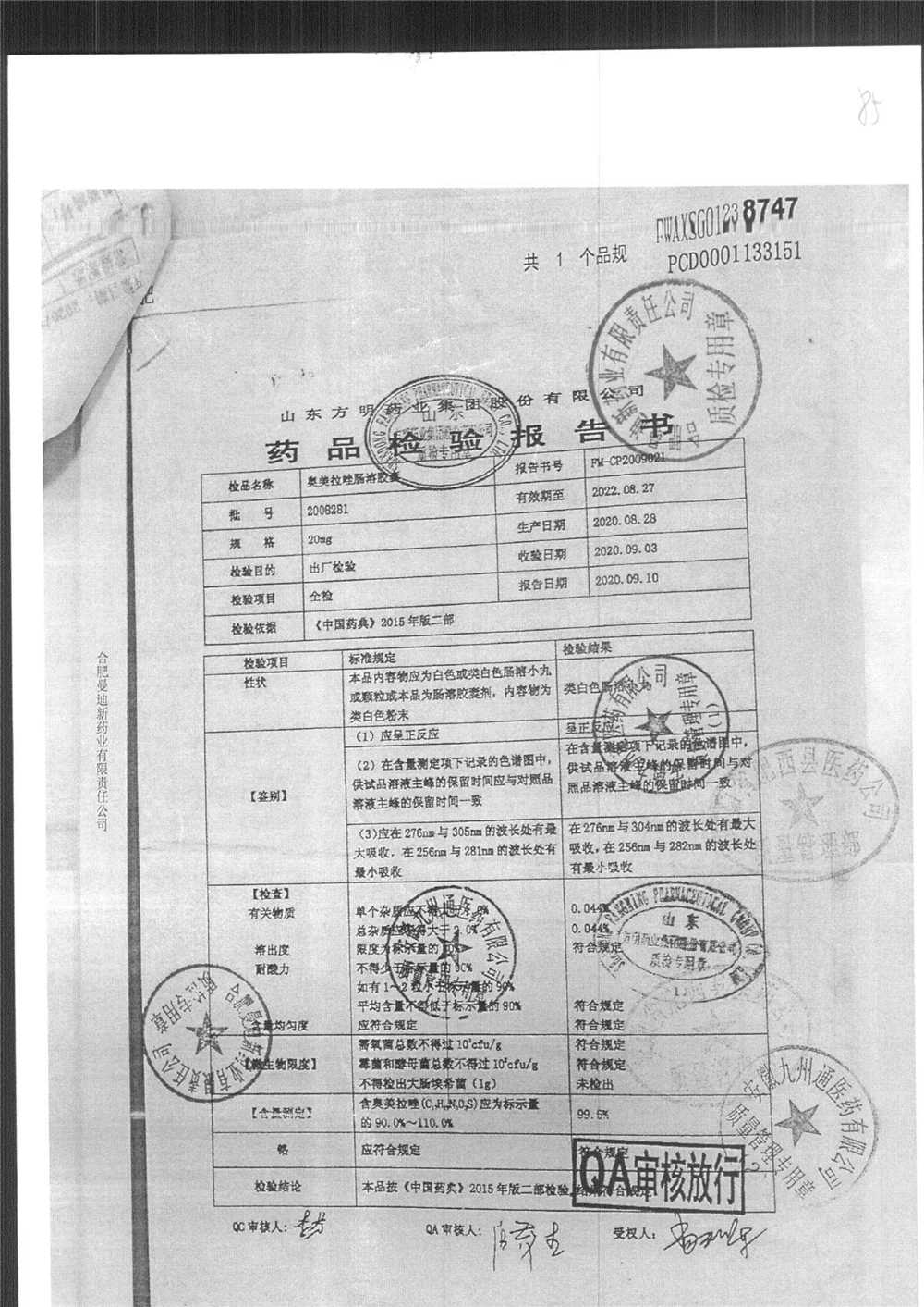 | 奥美拉唑肠溶胶囊 | 20mg*14s | 2008281 | 查看详情 |