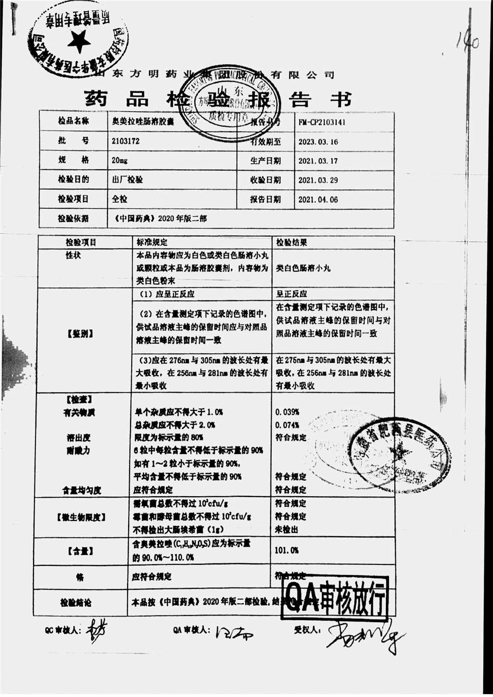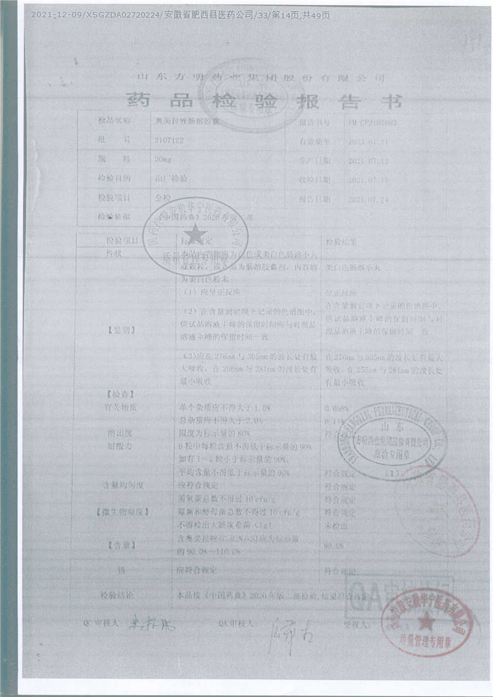 | 奥美拉唑肠溶胶囊 | 20mg*14s | 2103172 | 查看详情 |