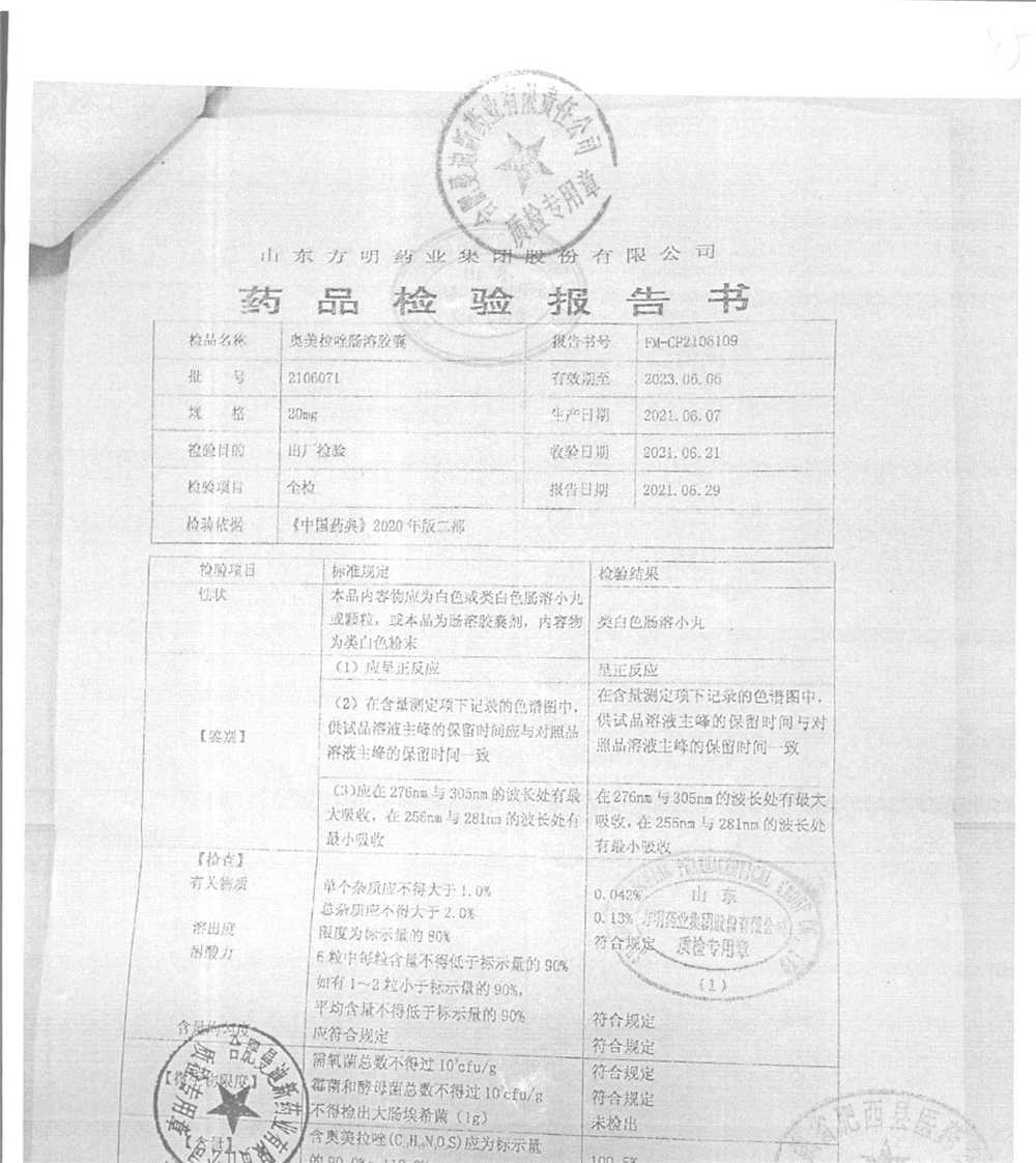 | 奥美拉唑肠溶胶囊 | 20mg*14s | 2106071 | 查看详情 |