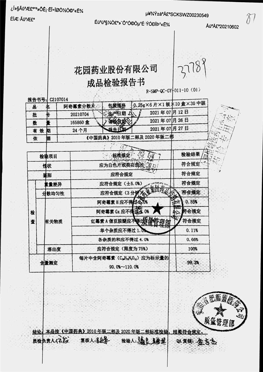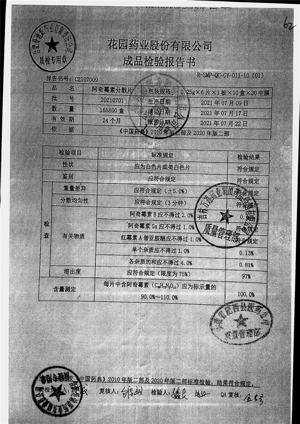 | 阿奇霉素分散片 | 0.25g*6片*1板 | 20210704 | 查看详情 |