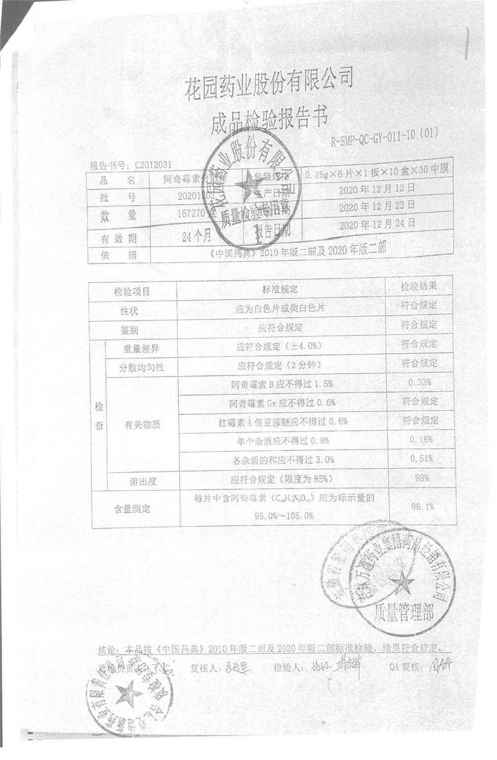 | 阿奇霉素分散片 | 0.25g*6片*1板 | 20201202 | 查看详情 |