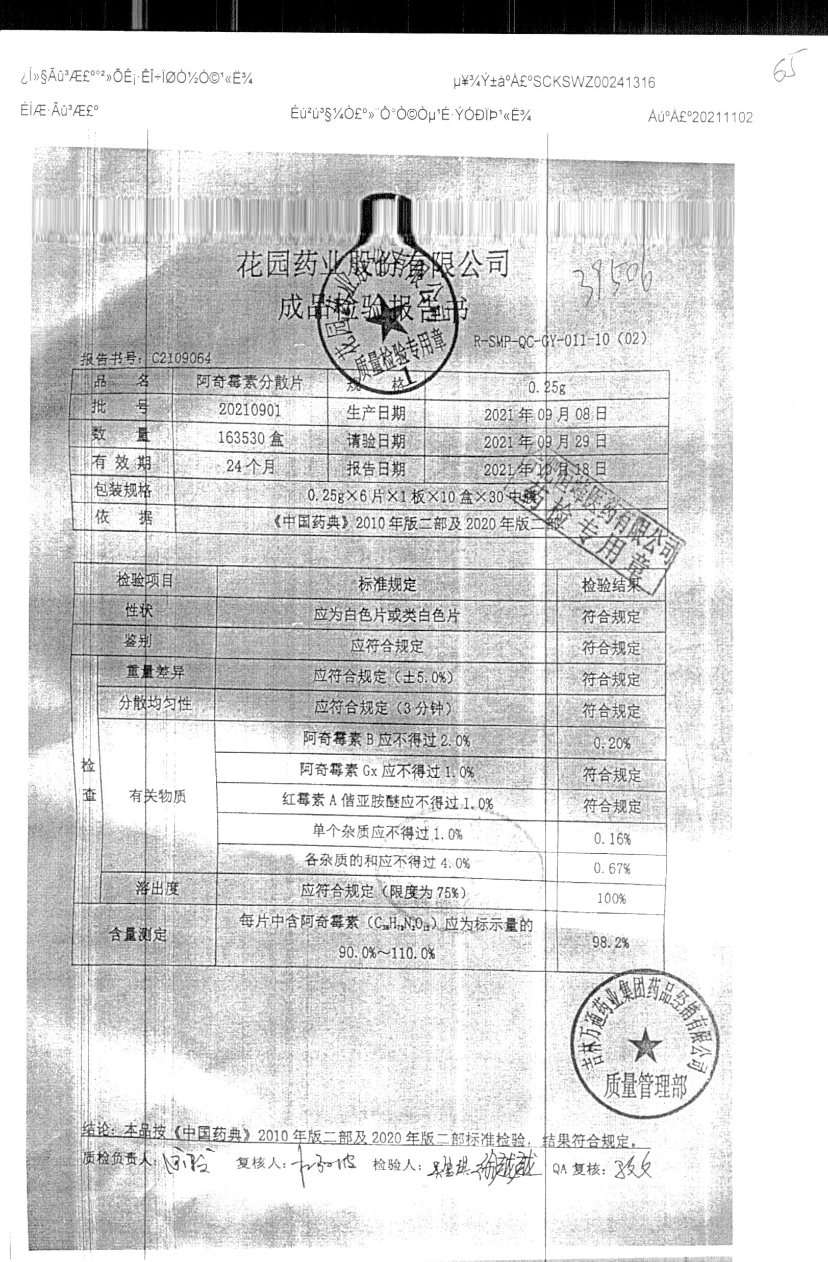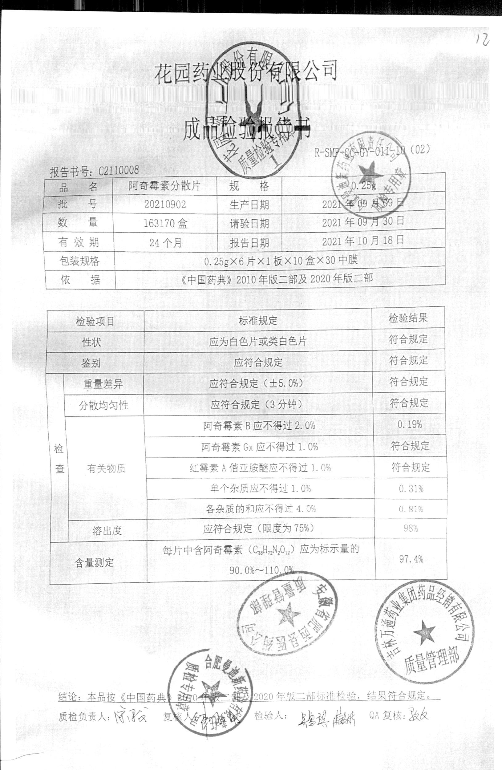 | 阿奇霉素分散片 | 0.25g*6片*1板 | 20210902 | 查看详情 |