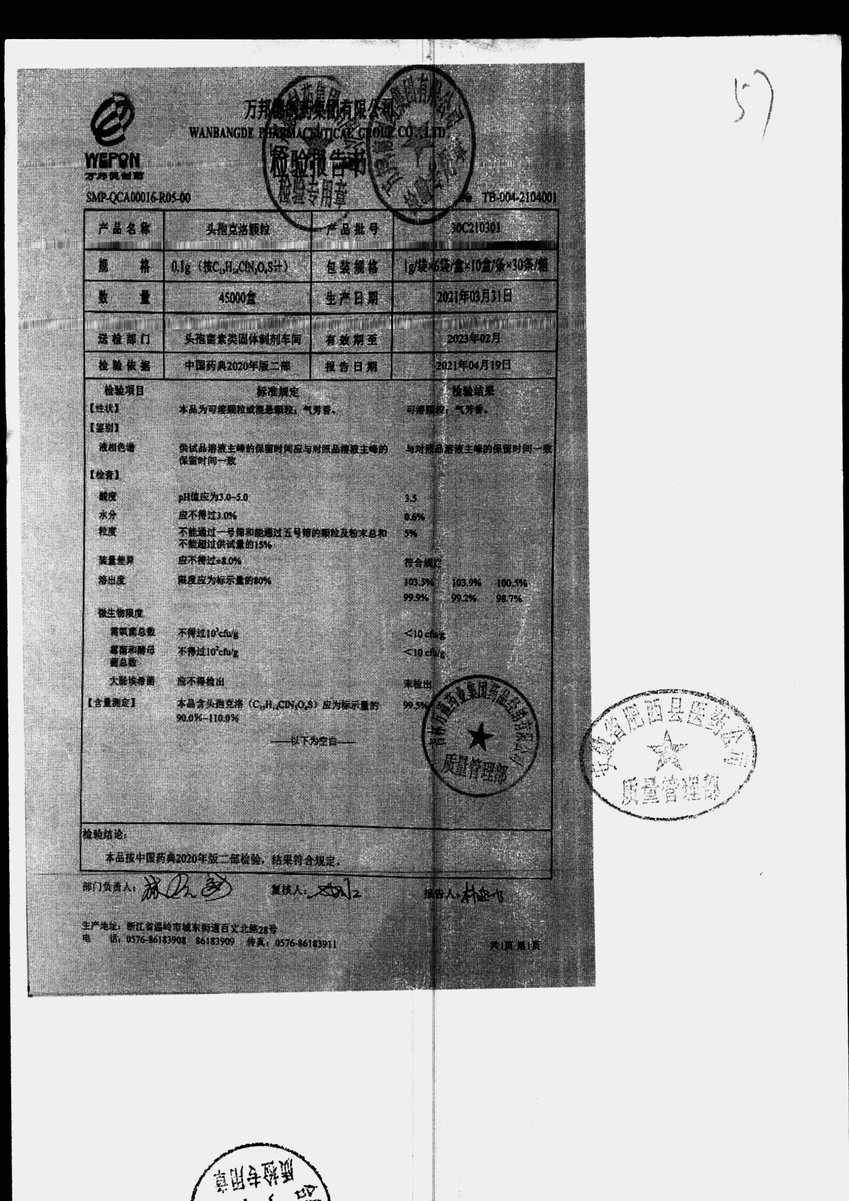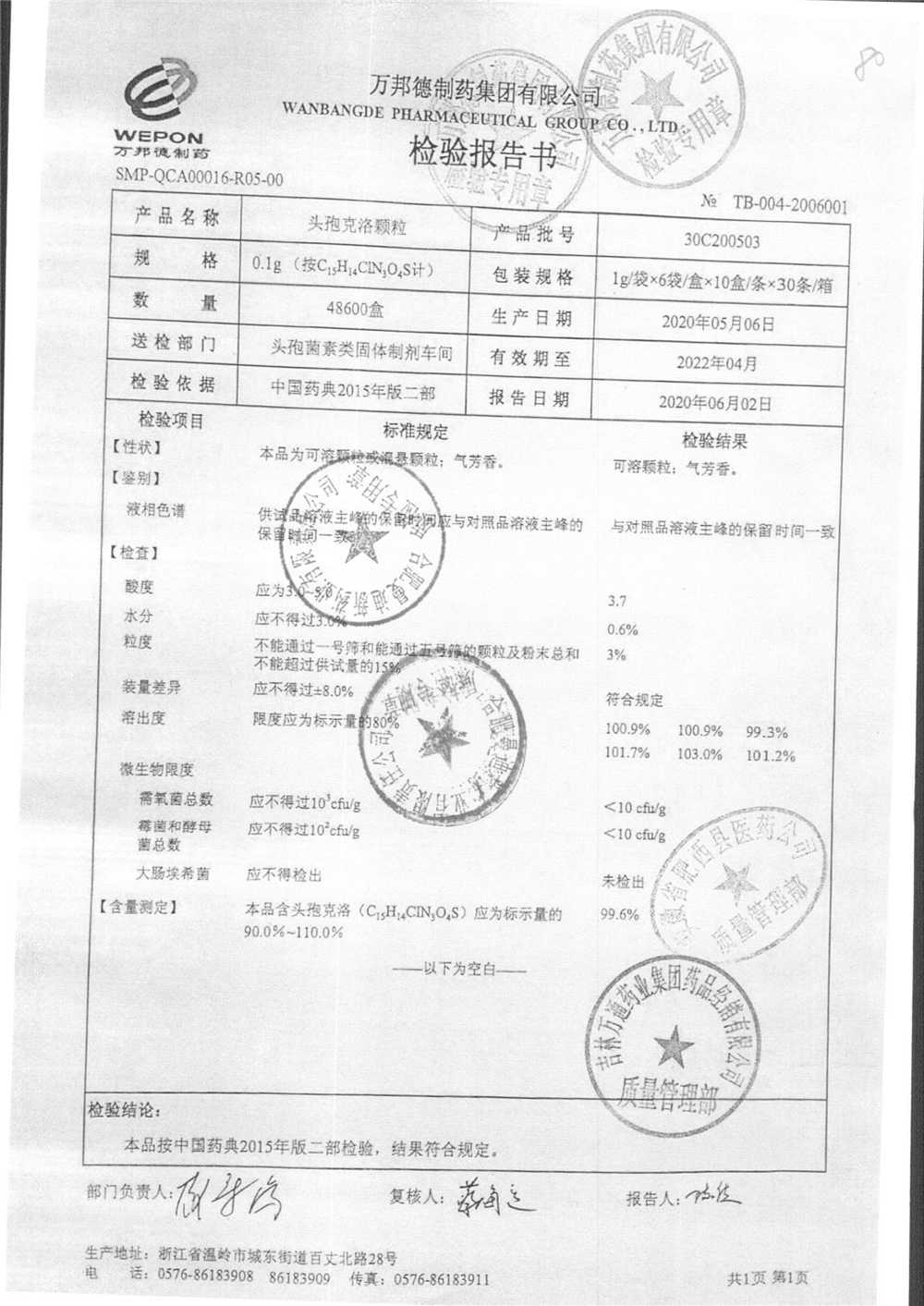 | 头孢克洛颗粒 | 0.1g*6袋 | 30C200503 | 查看详情 |