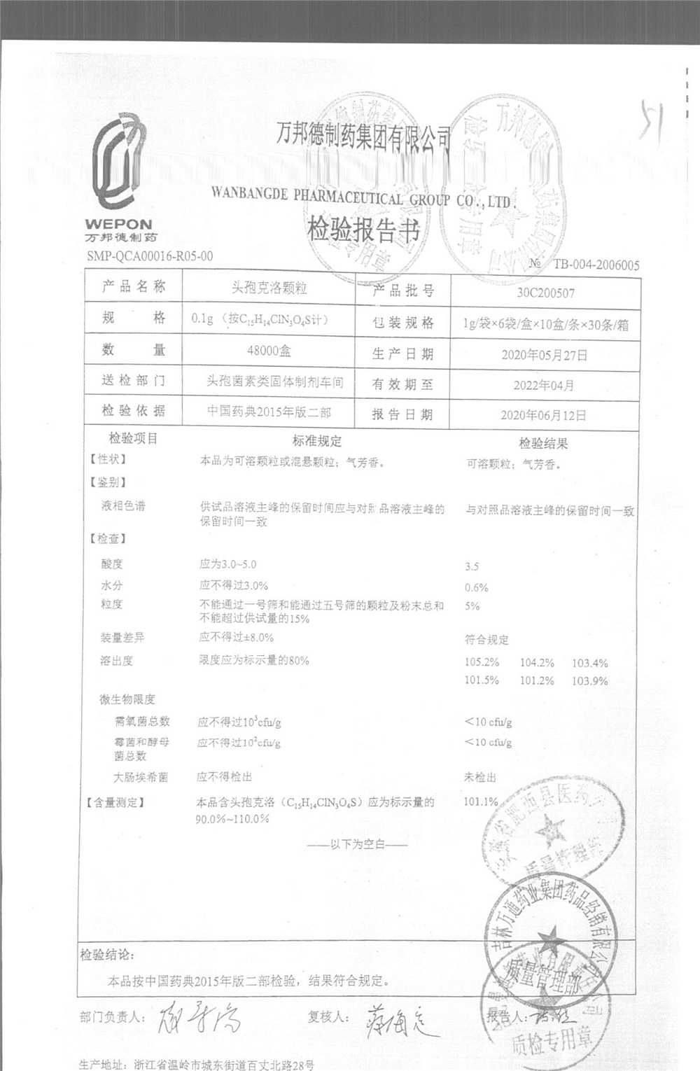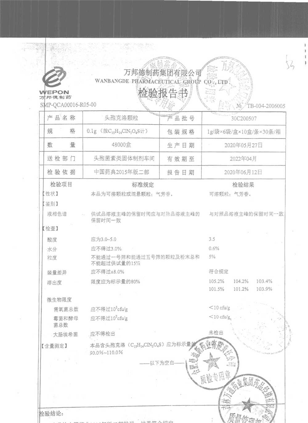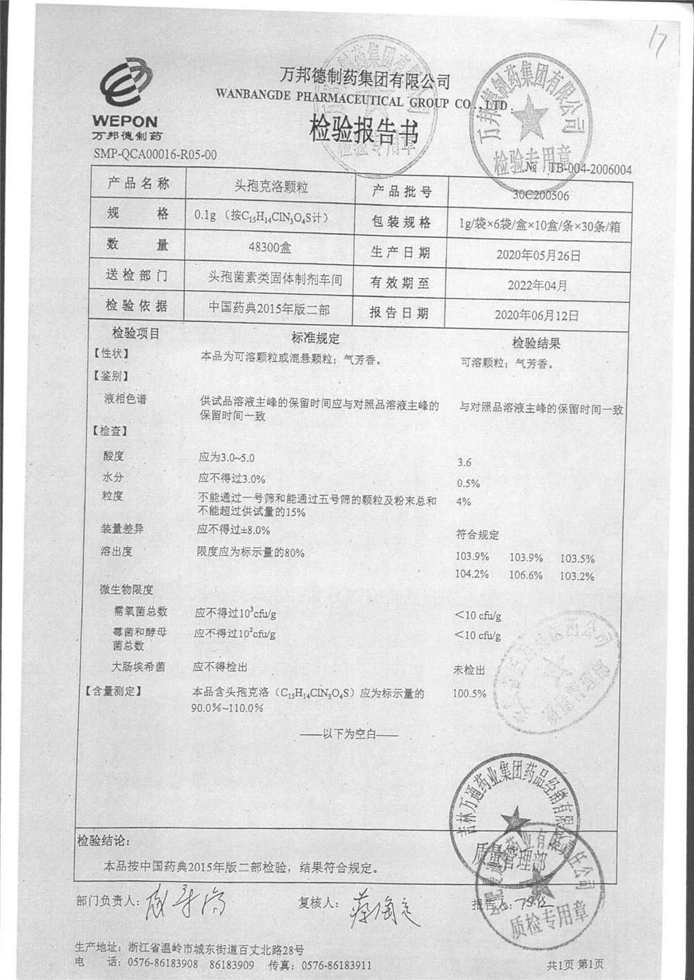 | 头孢克洛颗粒 | 0.1g*6袋 | 30C200506 | 查看详情 |