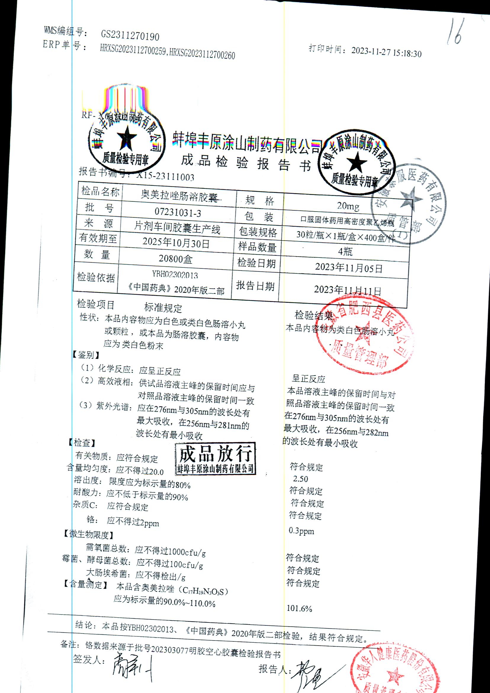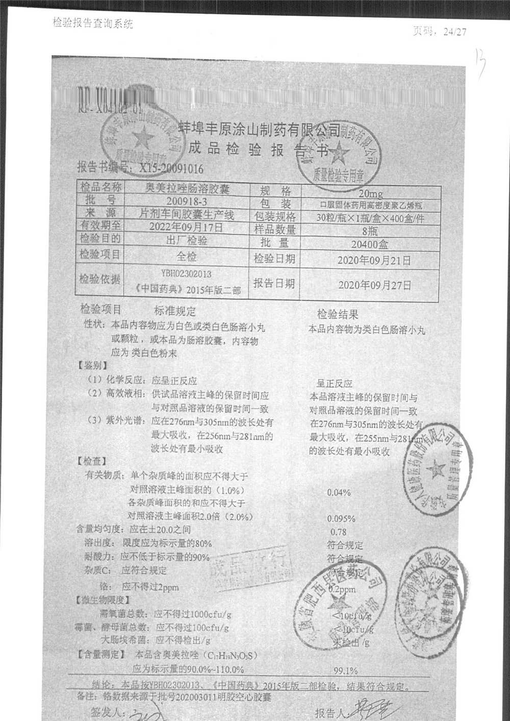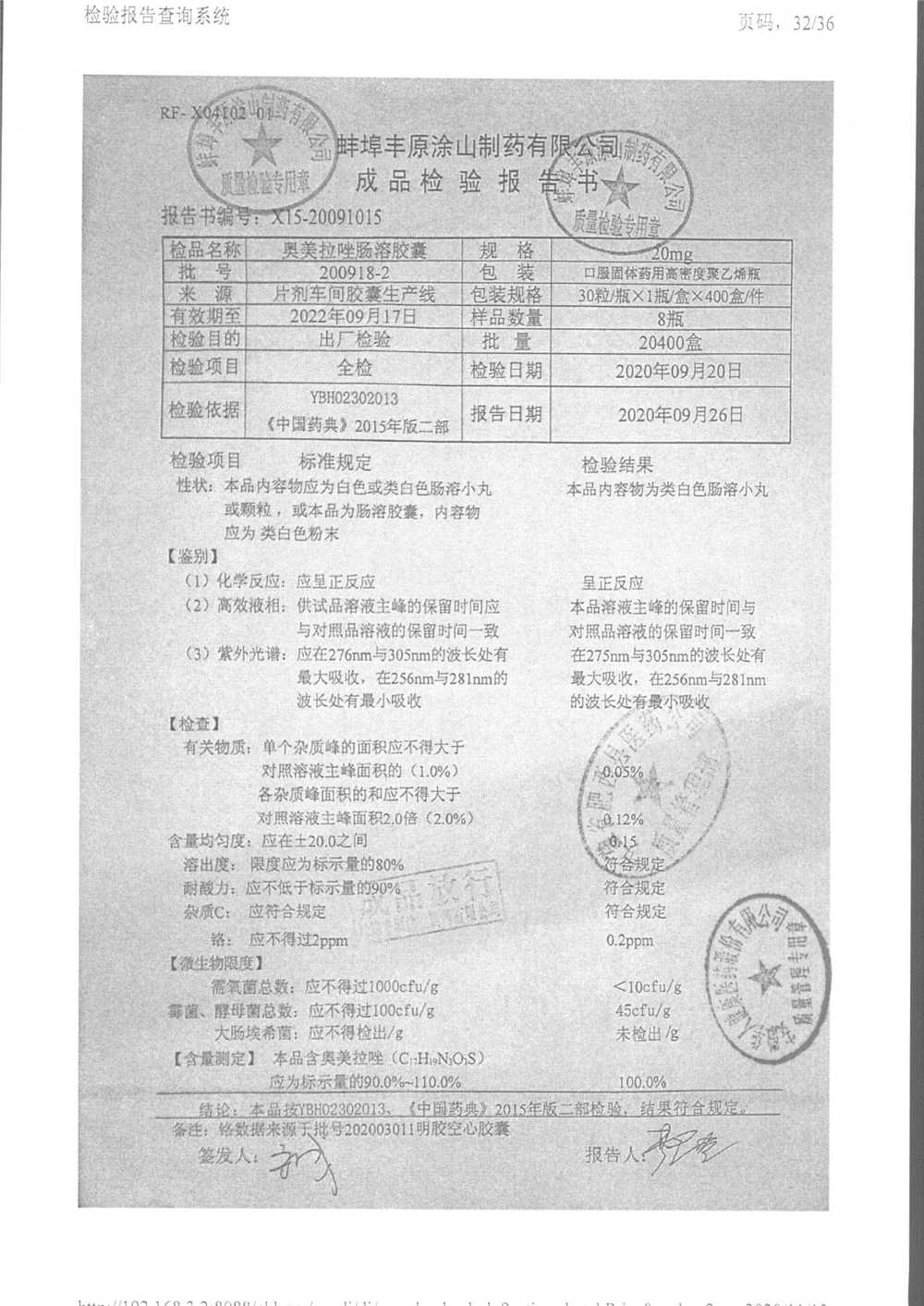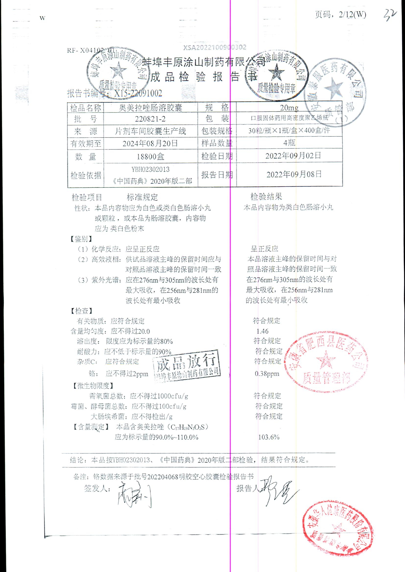 | 奥美拉唑肠溶胶囊 | 20mg*30s | 200918-3 | 查看详情 |