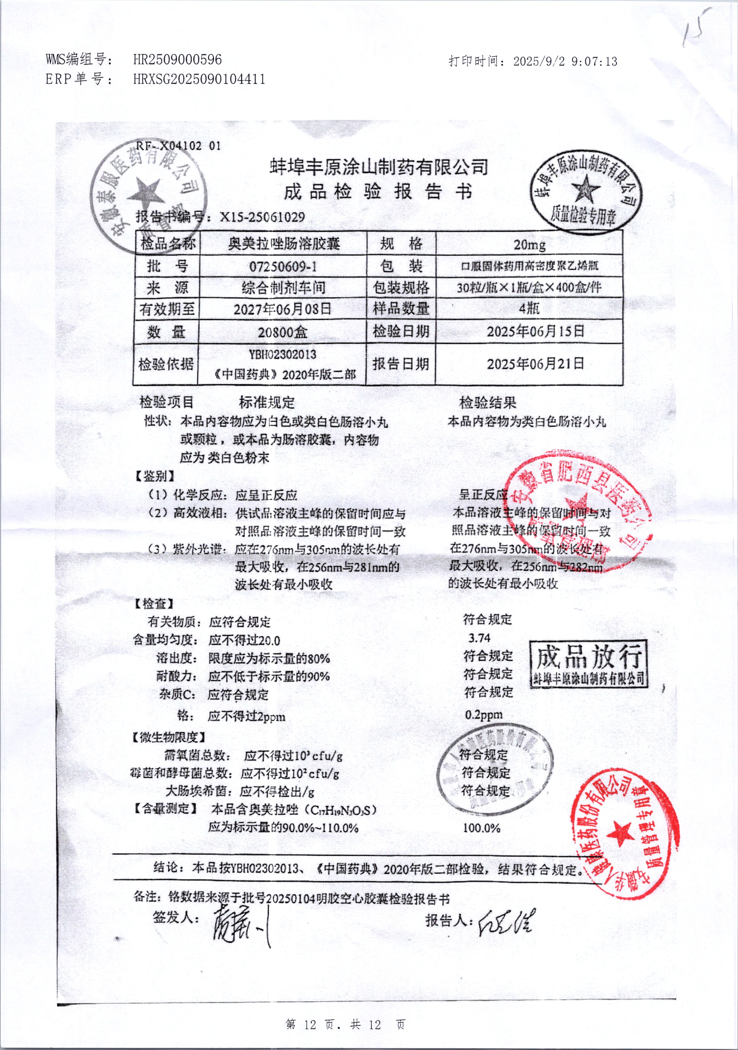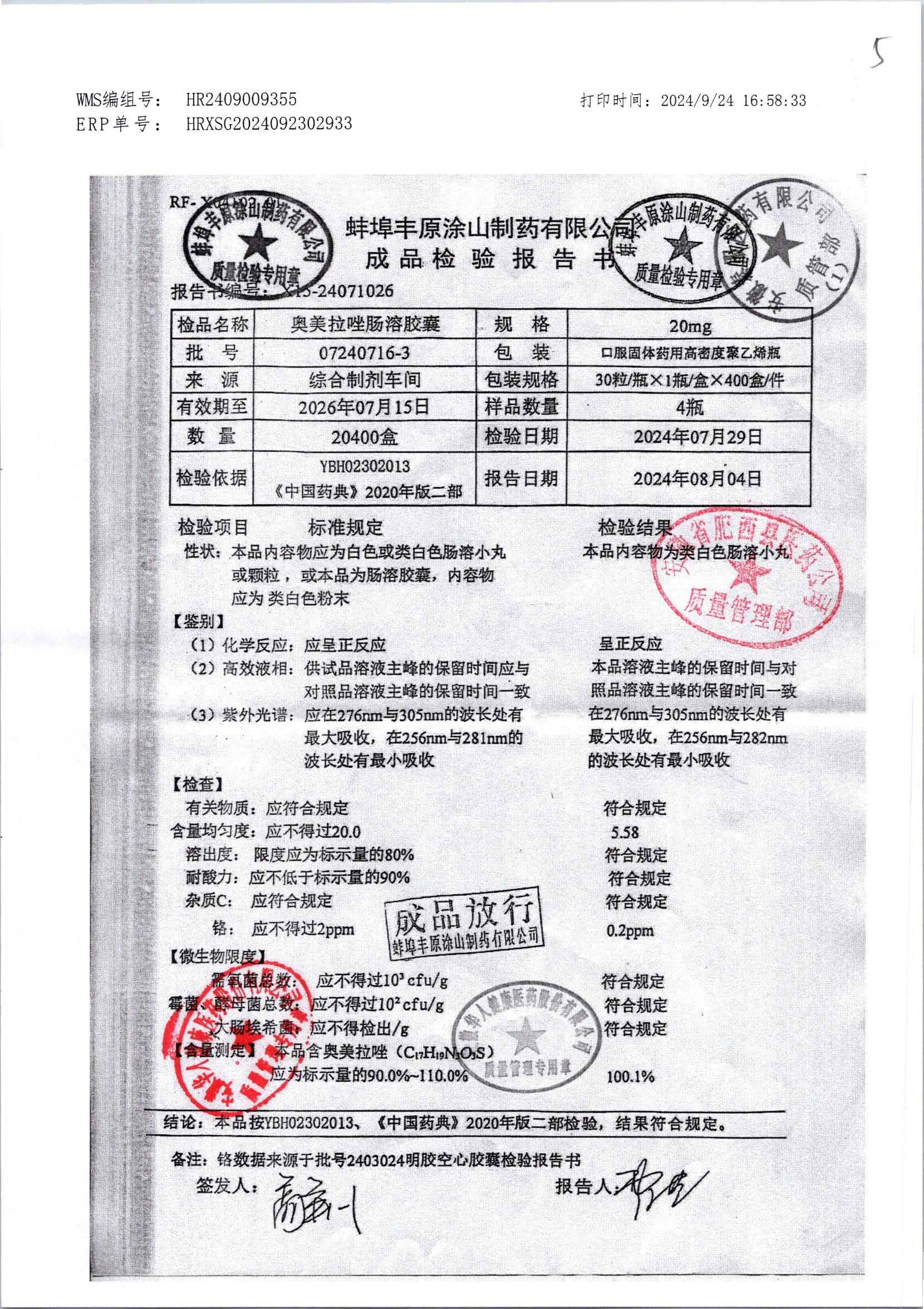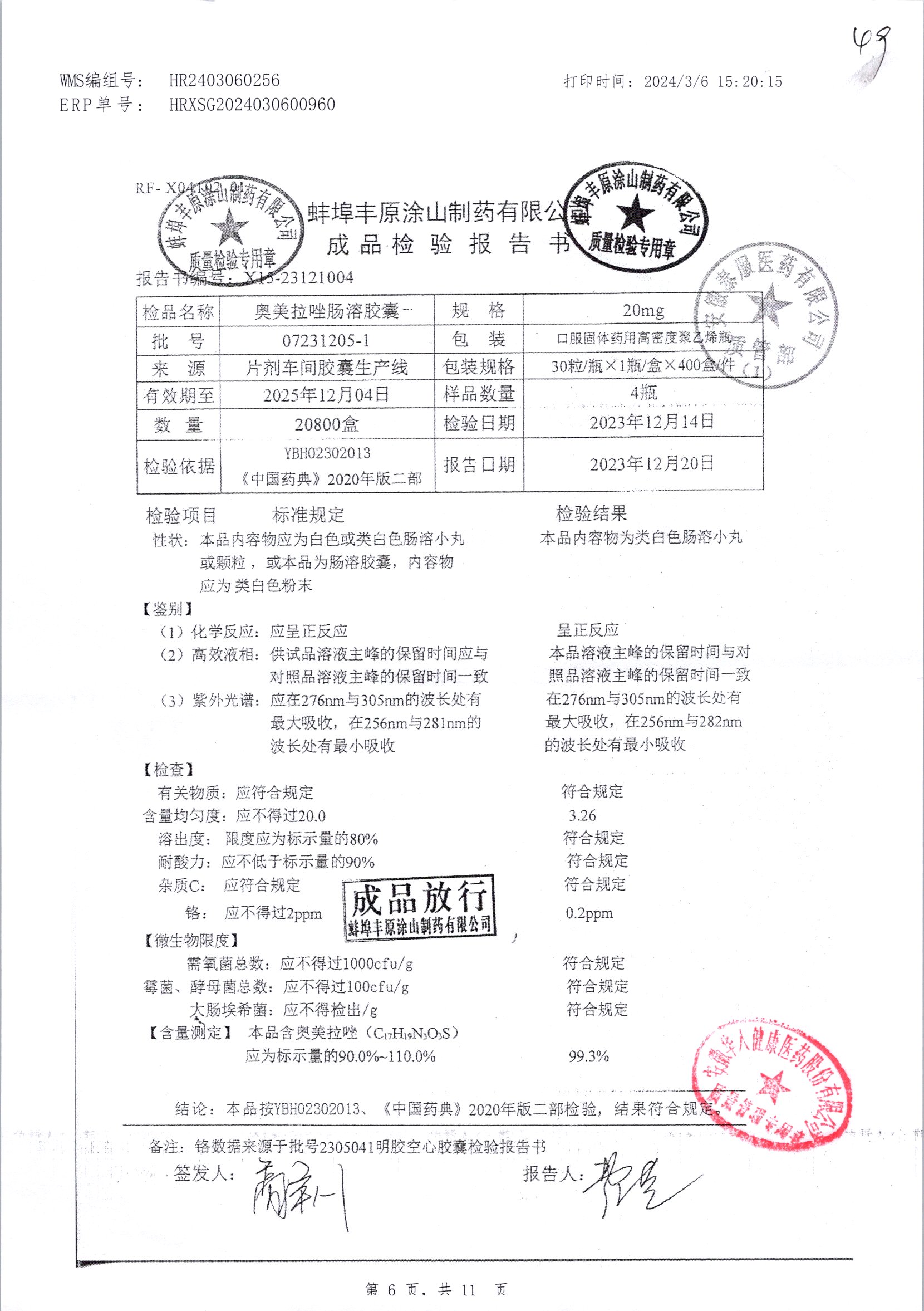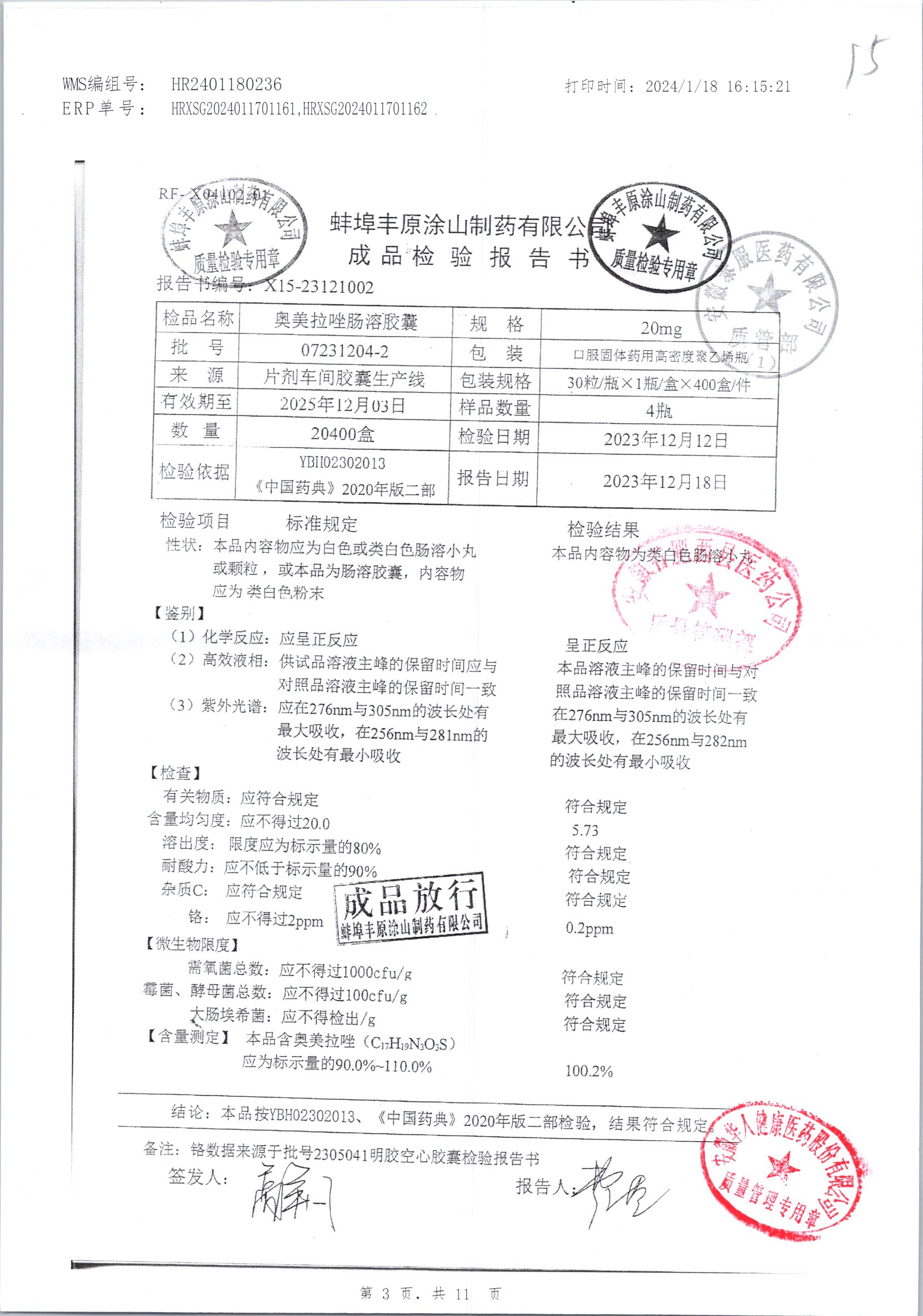 | 奥美拉唑肠溶胶囊 | 20mg*30s | 200918-3 | 查看详情 |