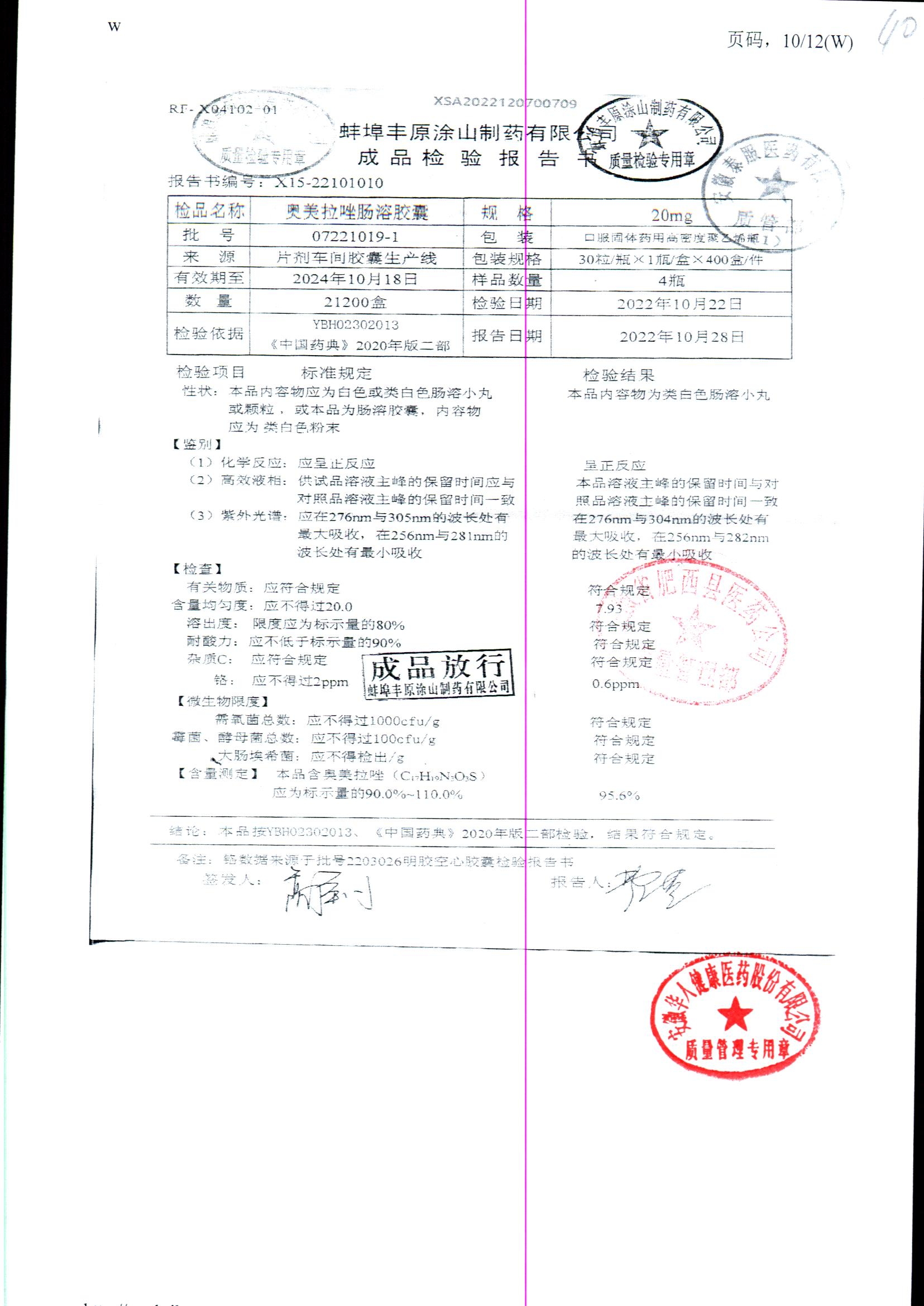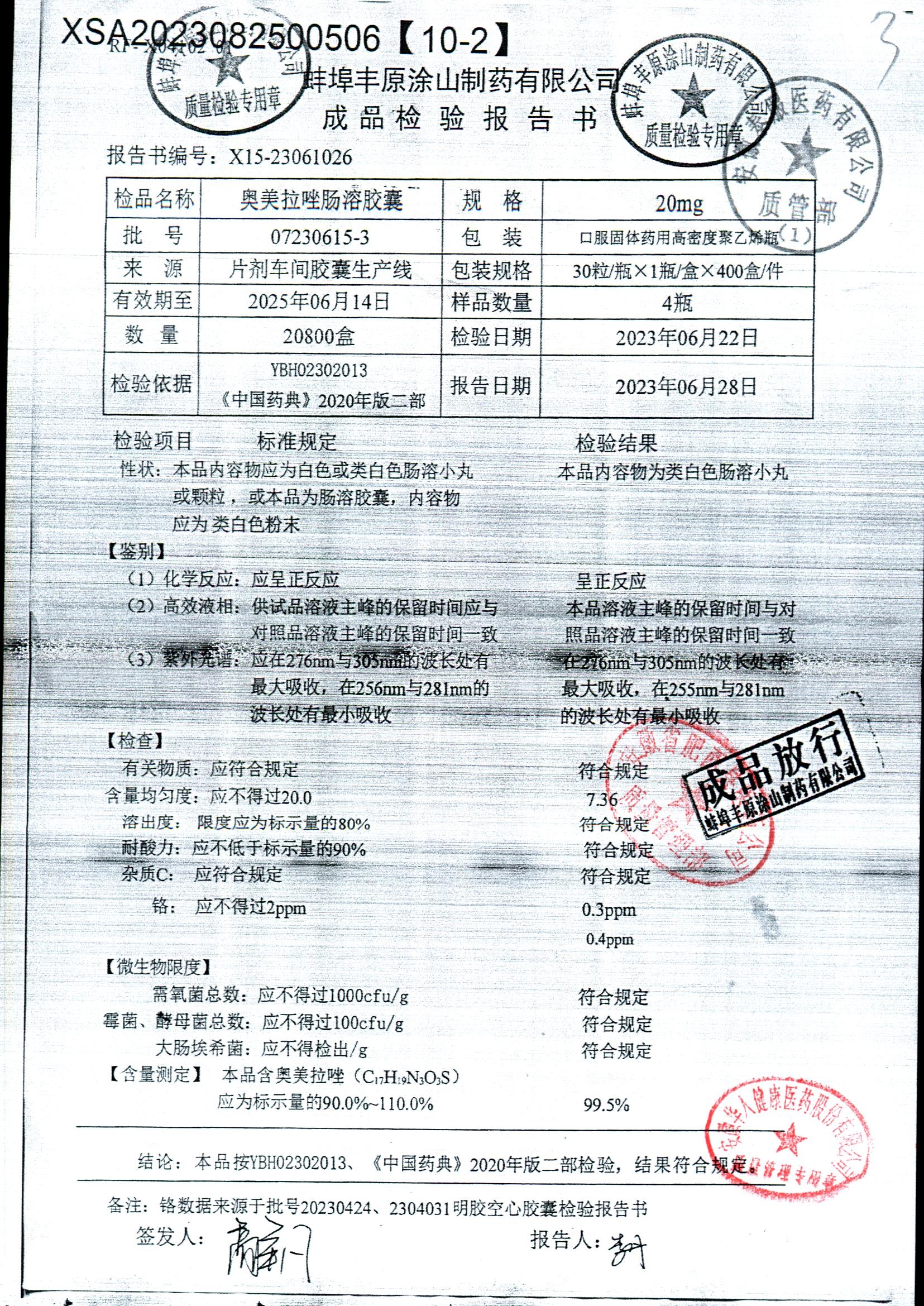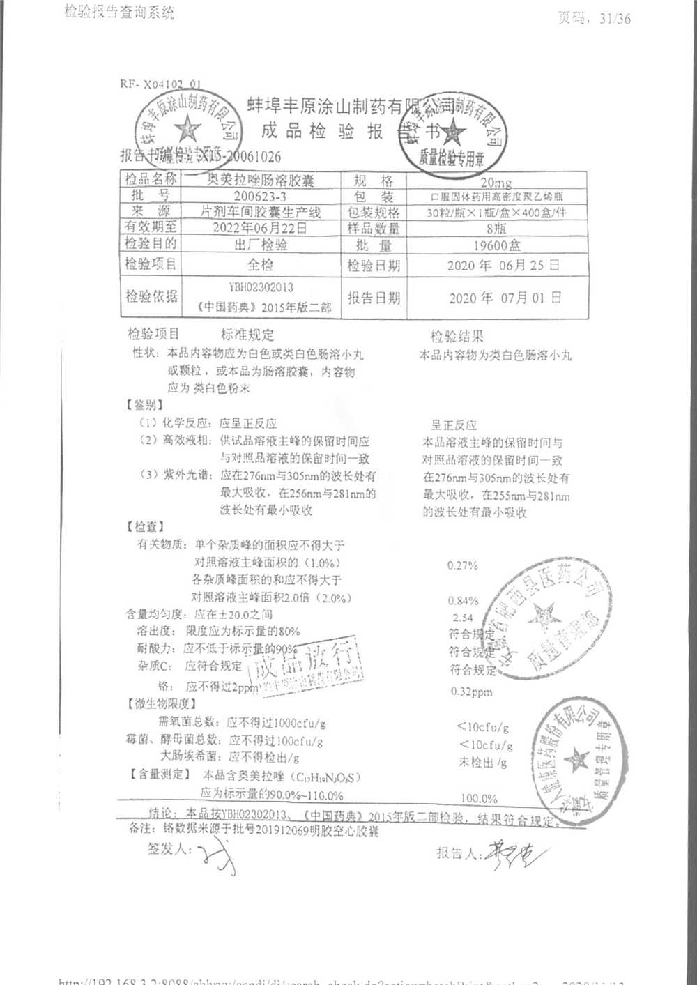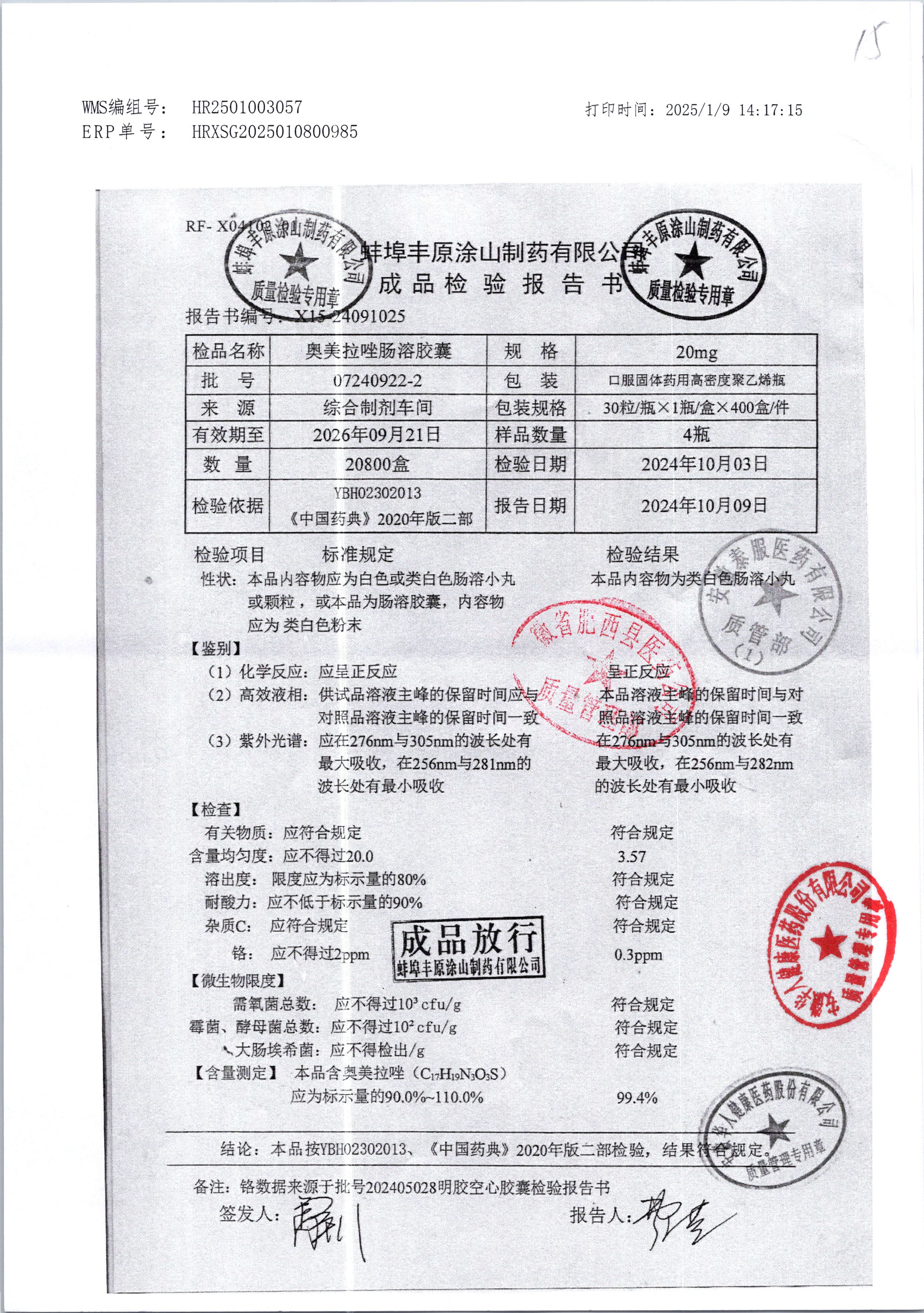 | 奥美拉唑肠溶胶囊 | 20mg*30s | 200918-3 | 查看详情 |