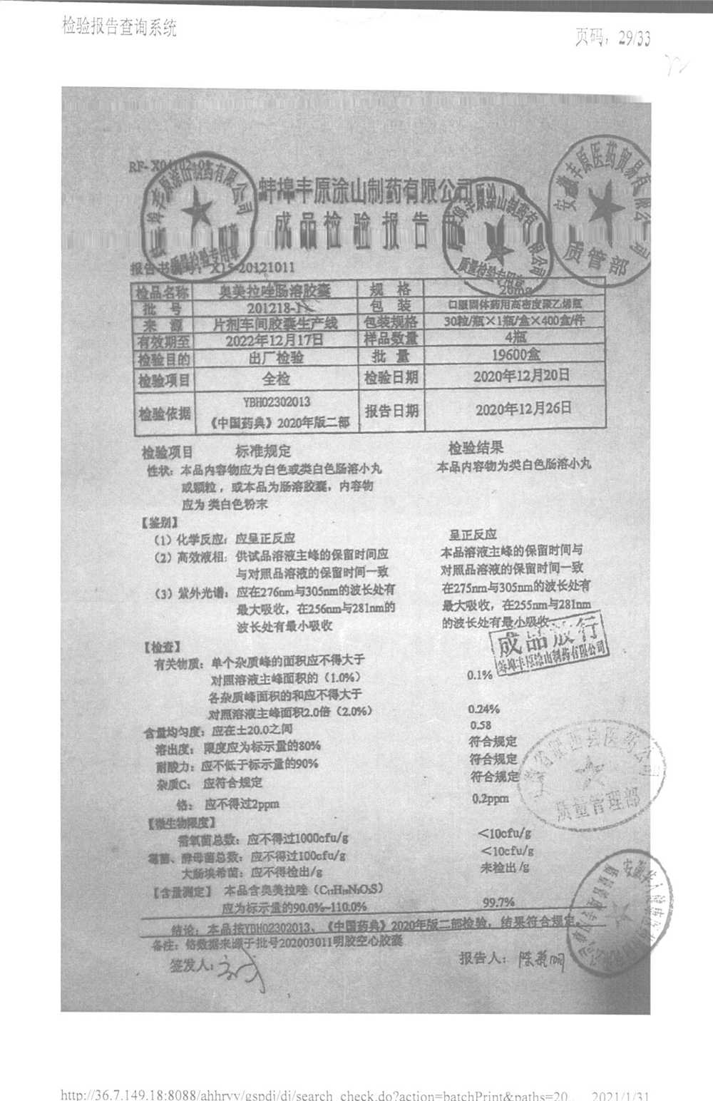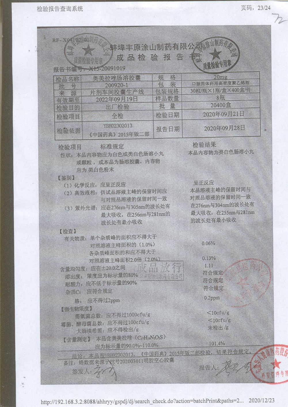 | 奥美拉唑肠溶胶囊 | 20mg*30s | 201218-2 | 查看详情 |