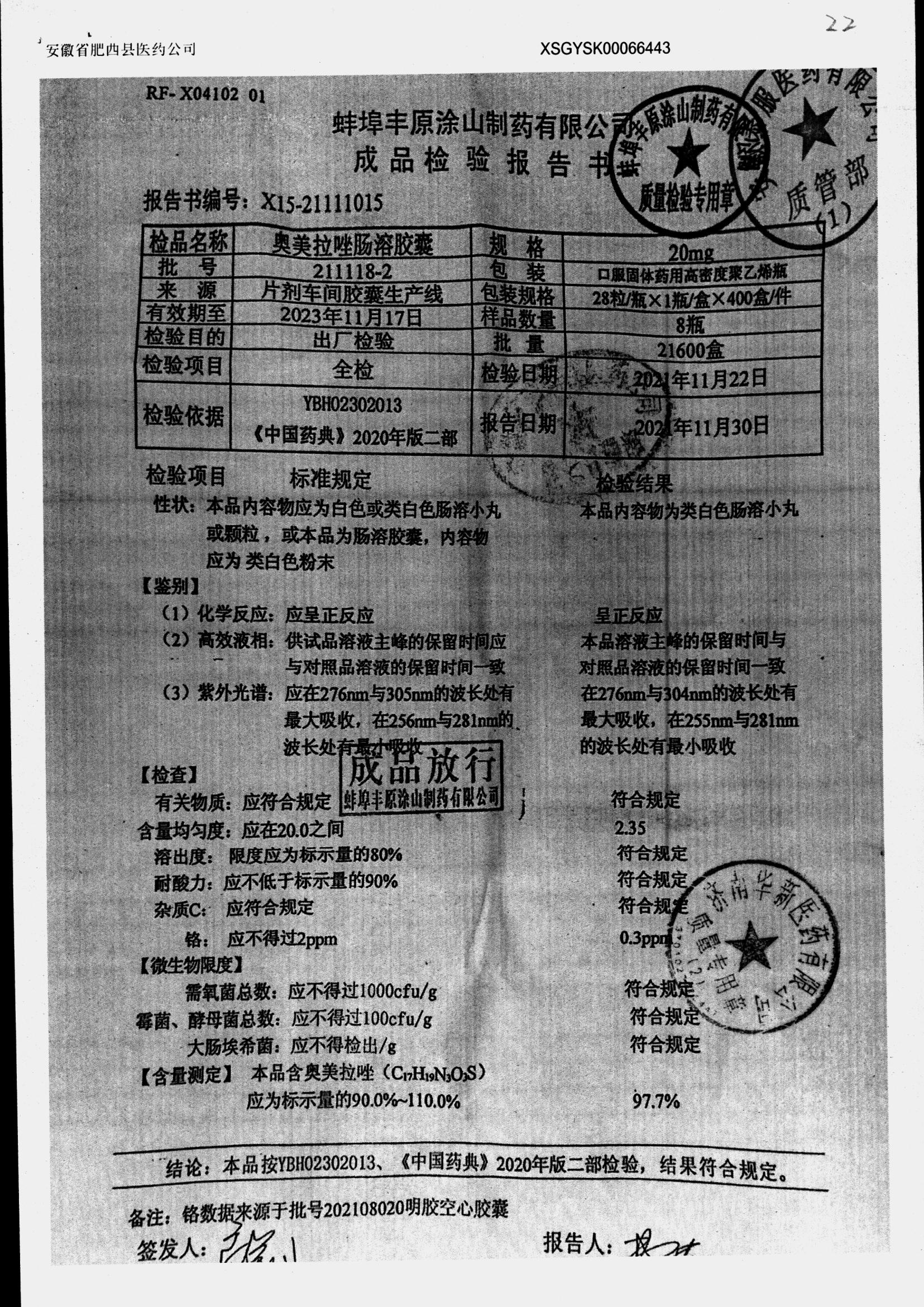 | 奥美拉唑肠溶胶囊 | 20mg*30s | 211118-2 | 查看详情 |