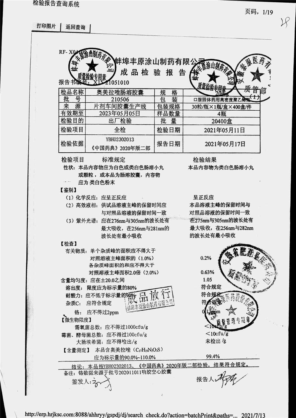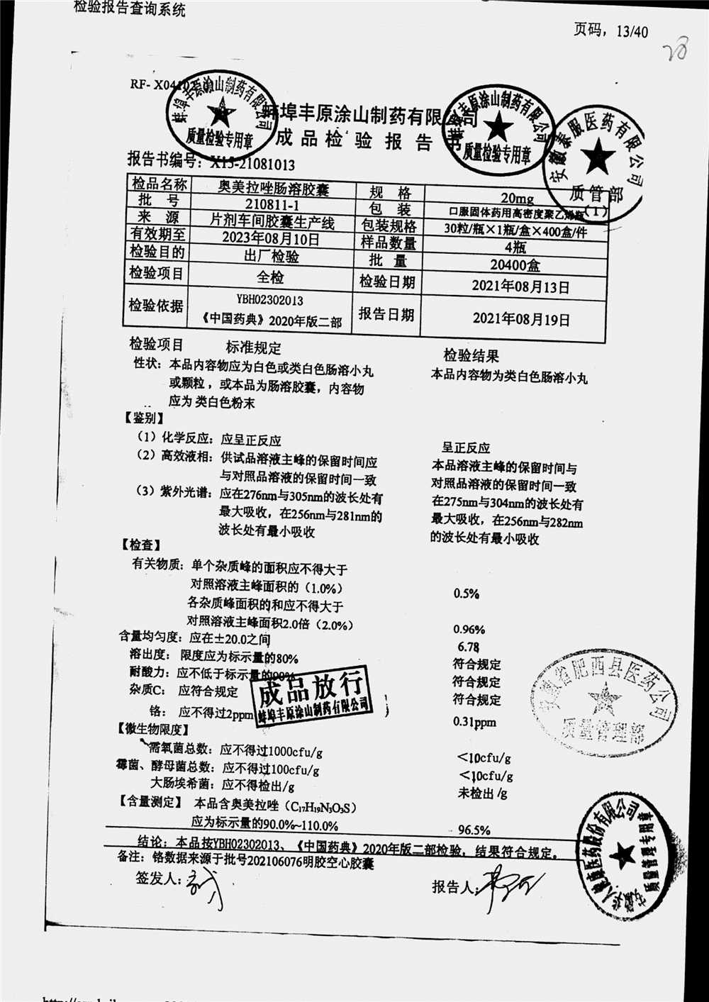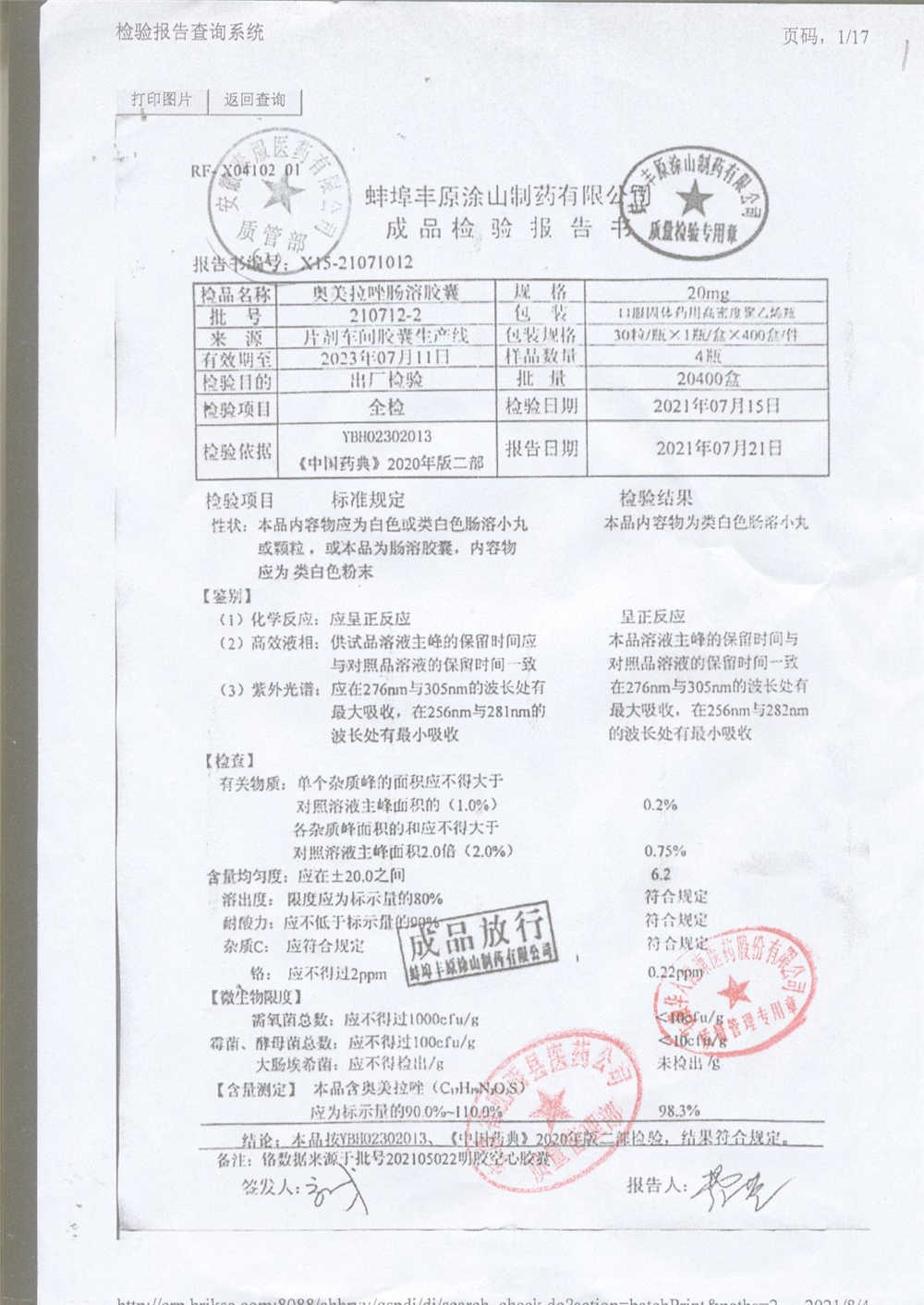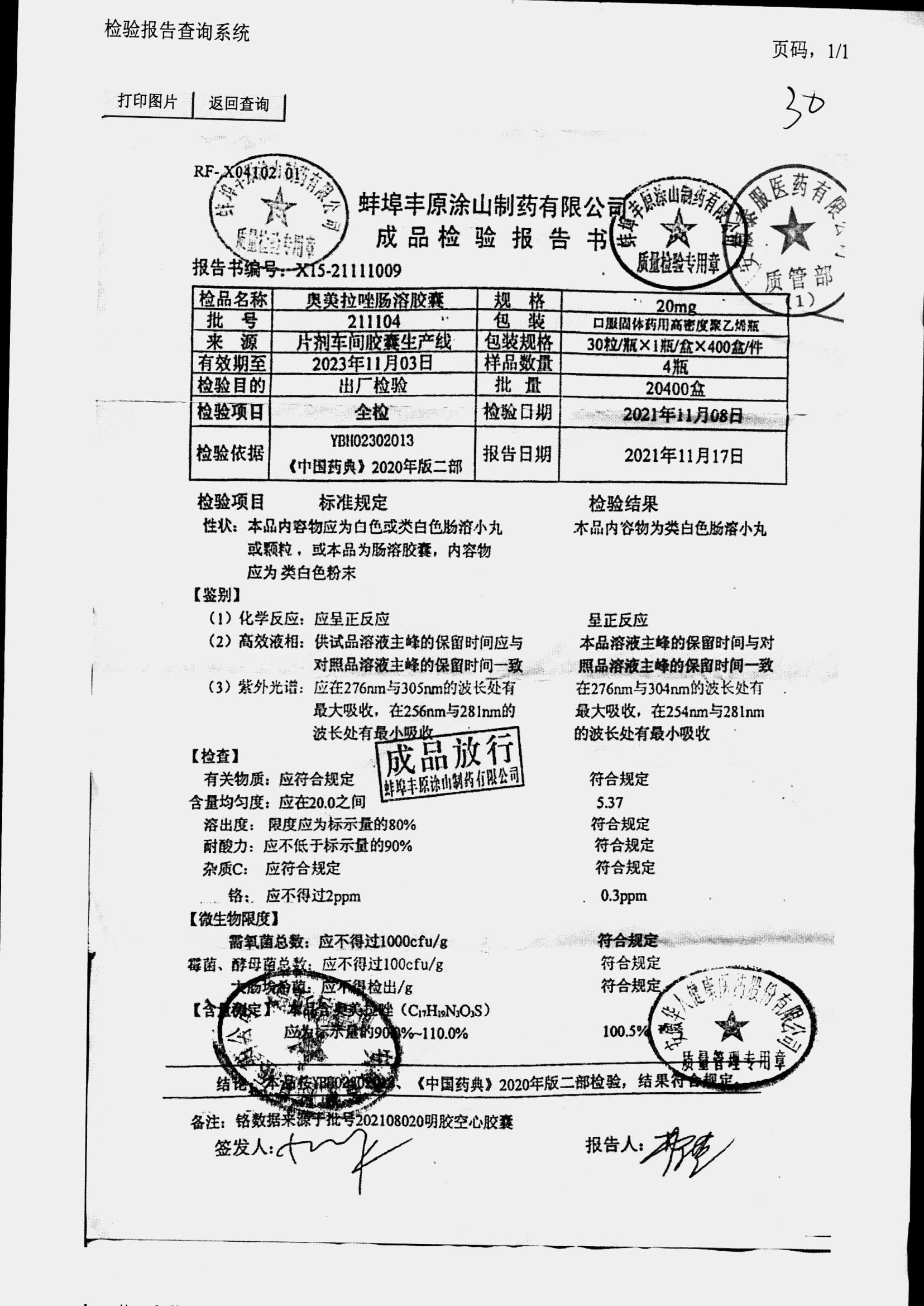 | 奥美拉唑肠溶胶囊 | 20mg*30s | 210811-1 | 查看详情 |