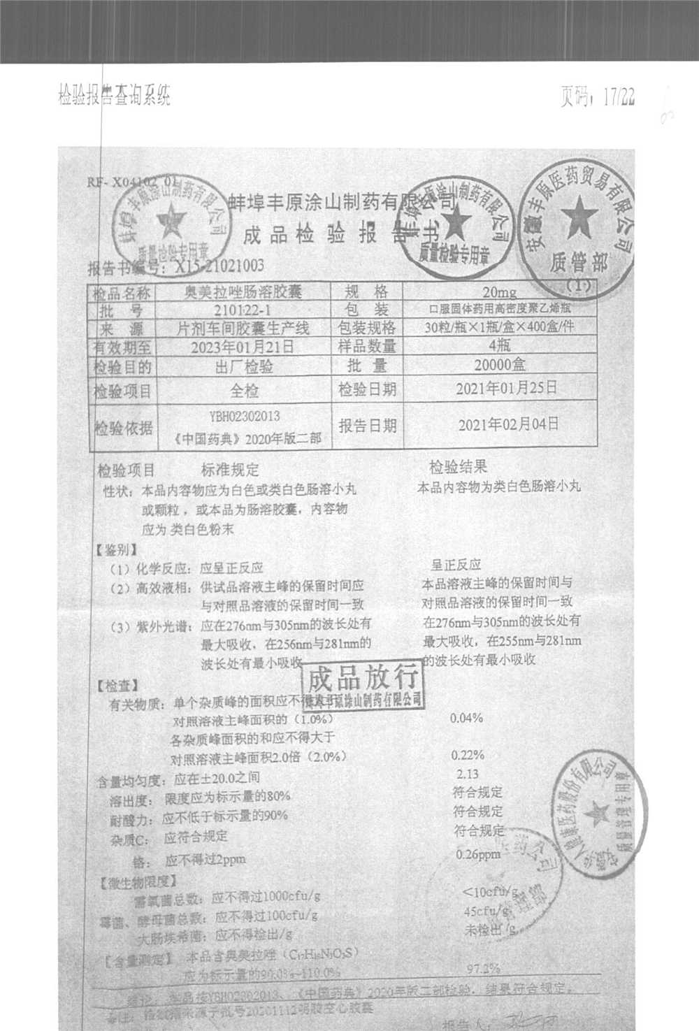 | 奥美拉唑肠溶胶囊 | 20mg*30s | 210122-1 | 查看详情 |