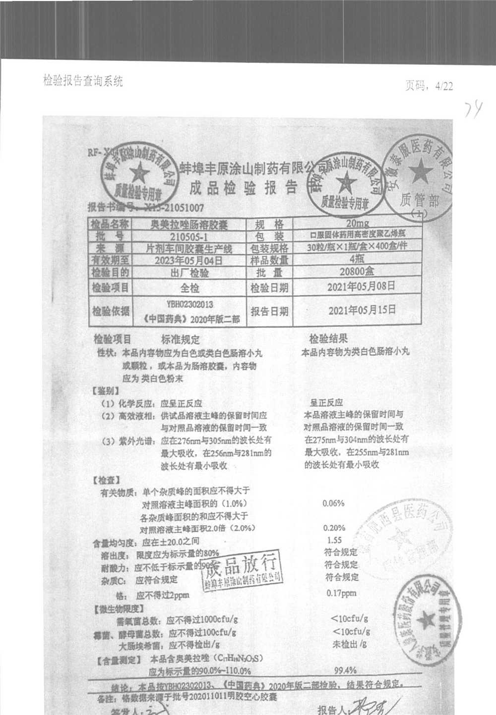 | 奥美拉唑肠溶胶囊 | 20mg*30s | 210506 | 查看详情 |