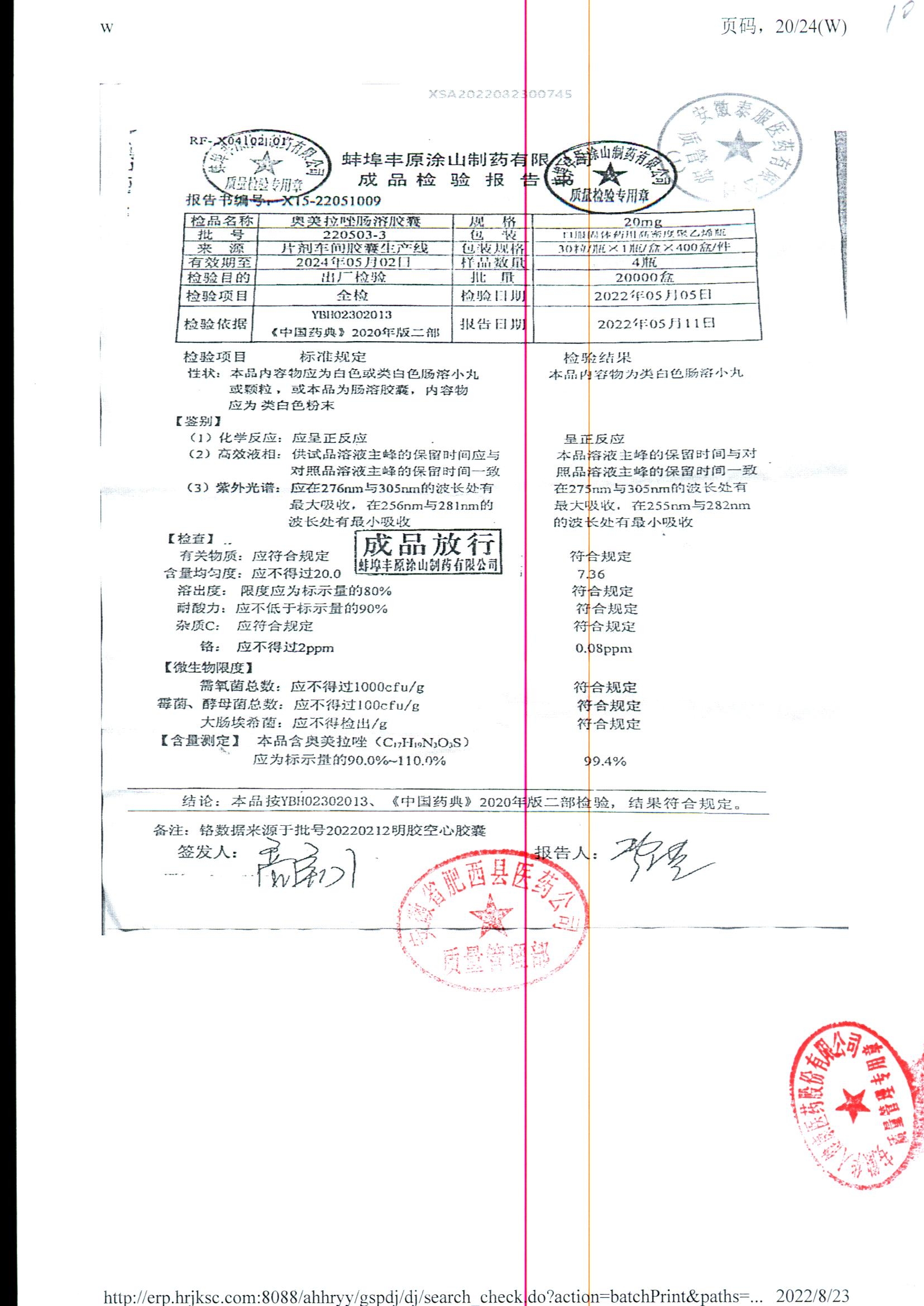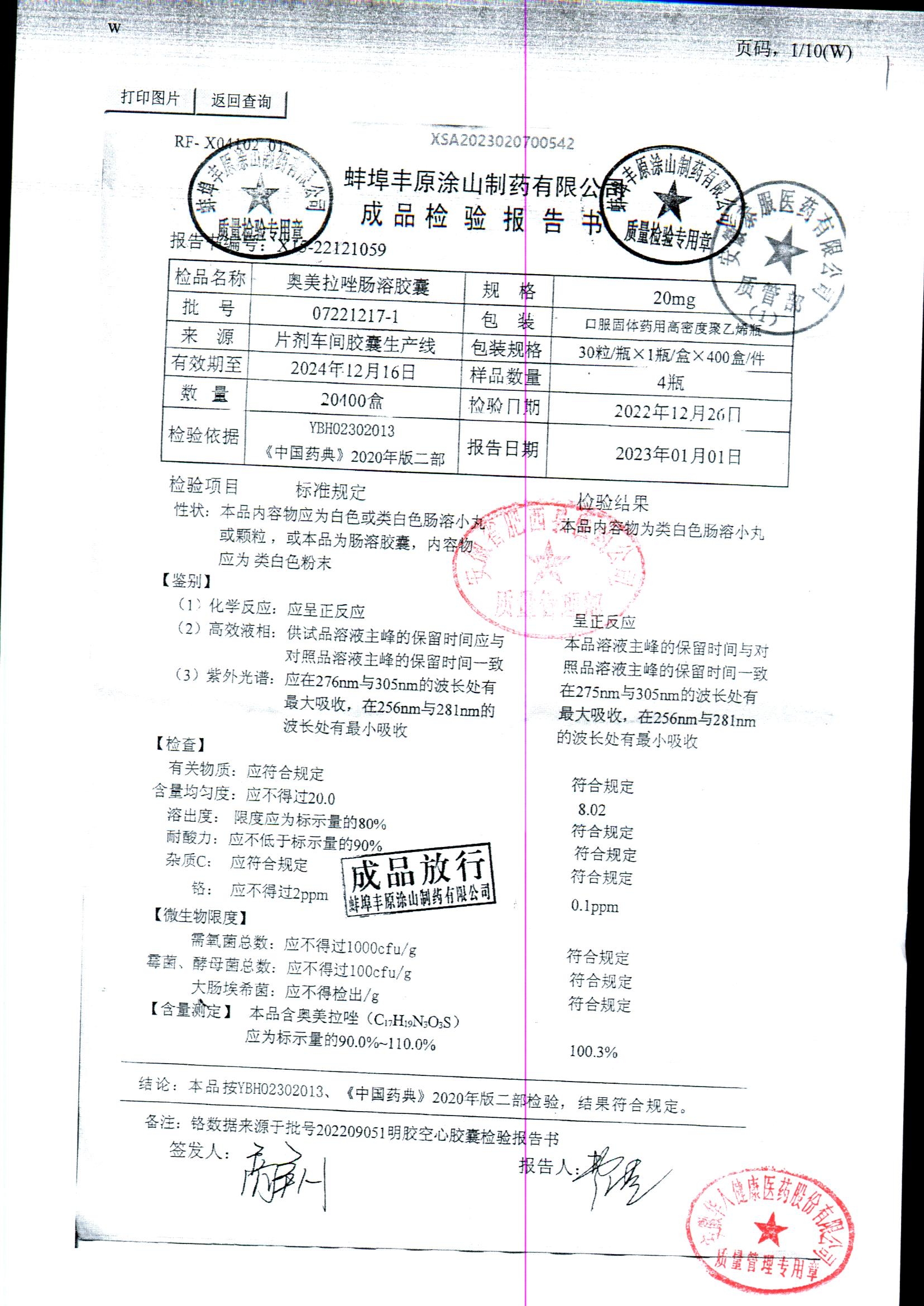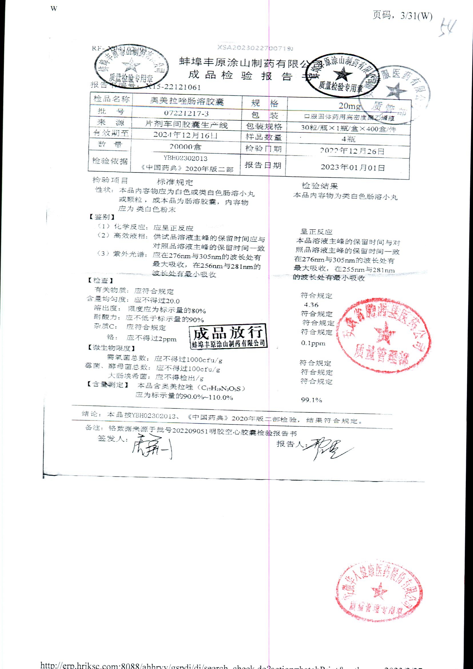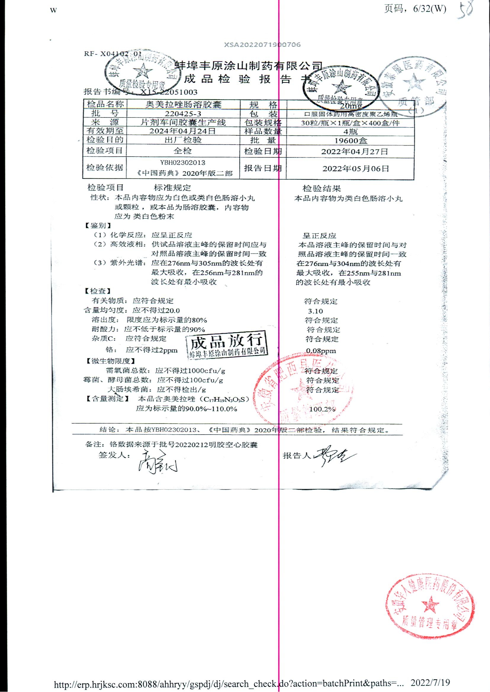 | 奥美拉唑肠溶胶囊 | 20mg*30s | 220503-3 | 查看详情 |