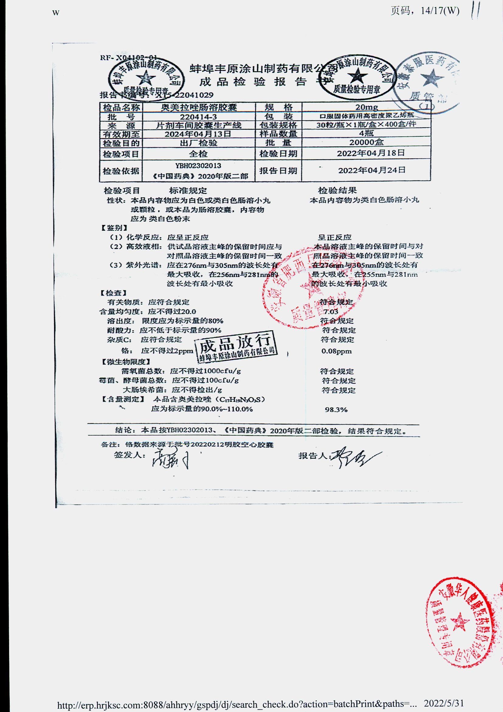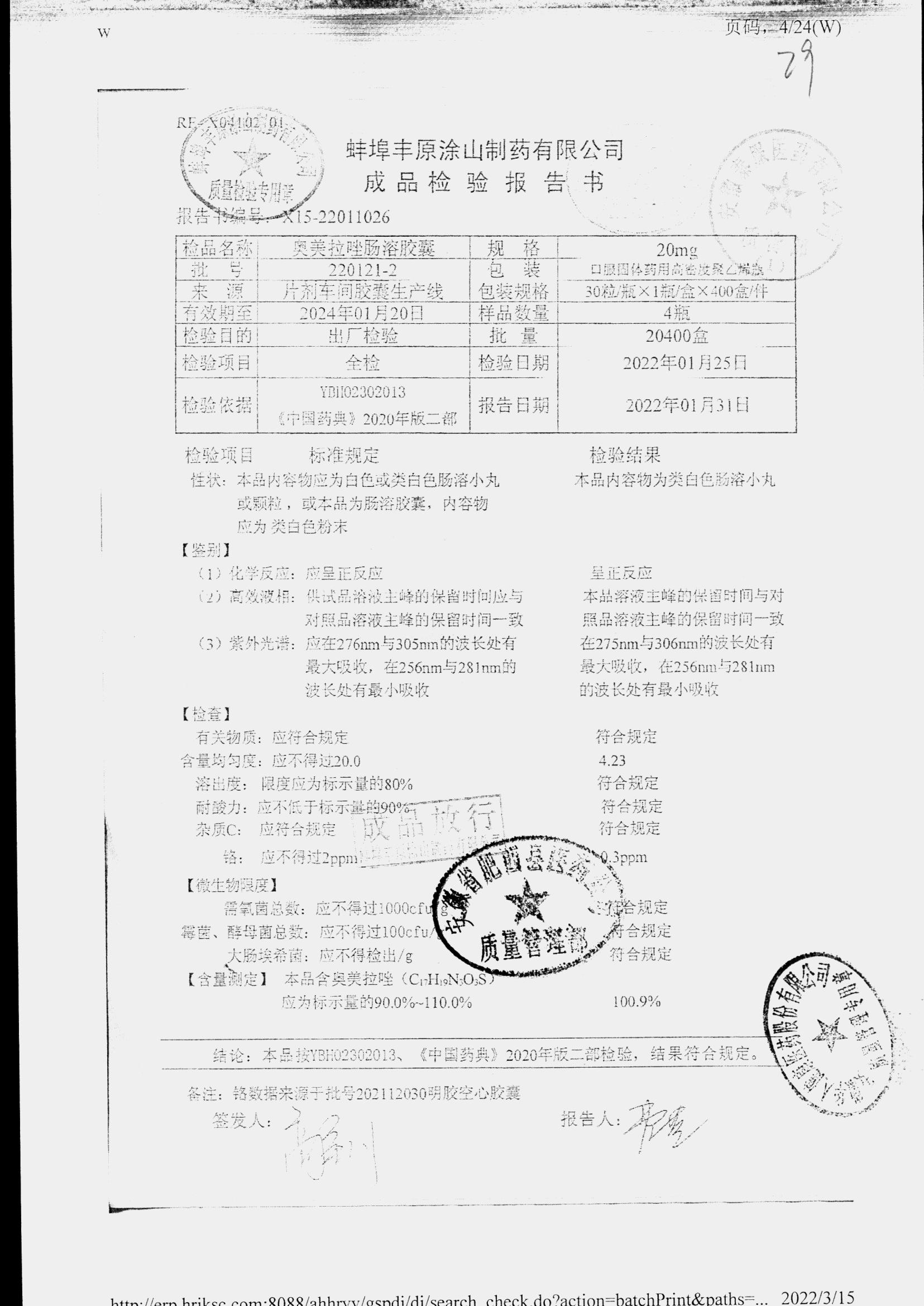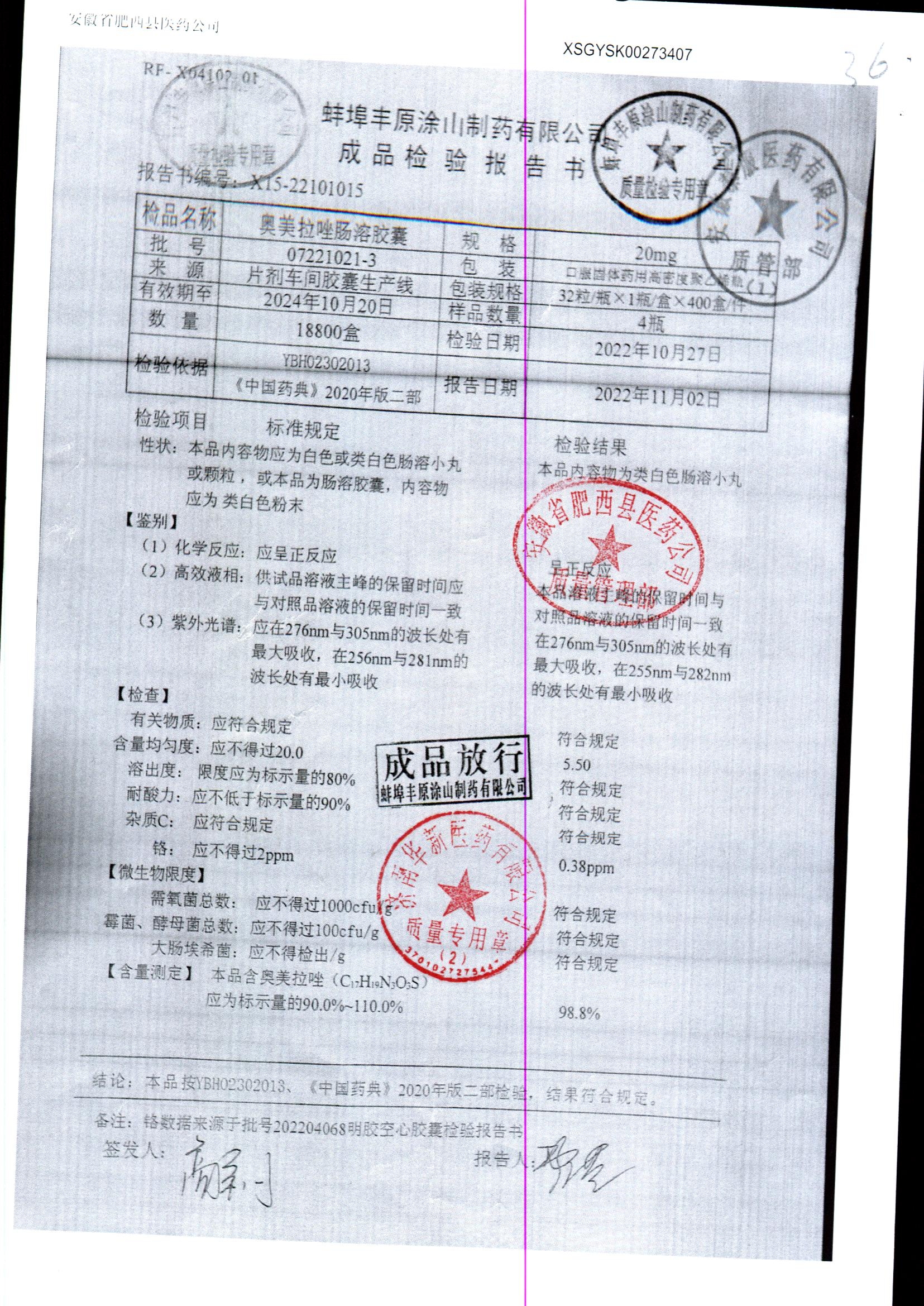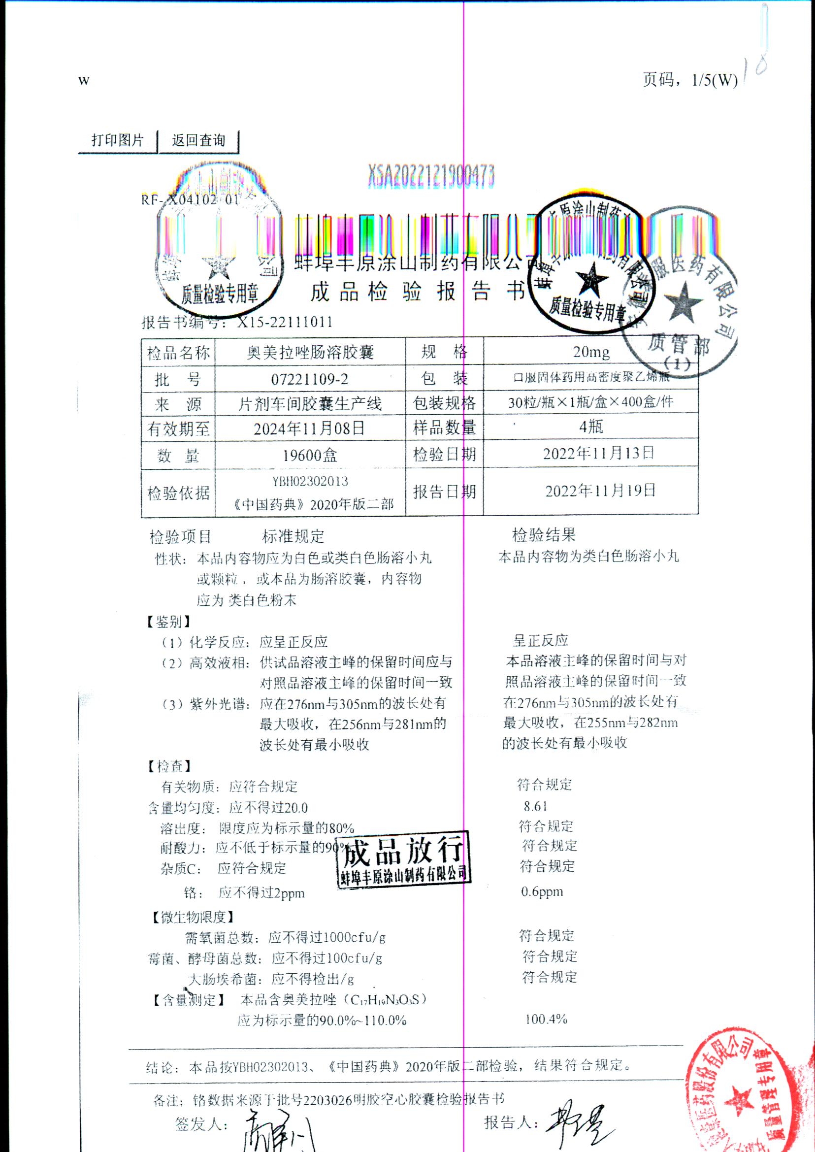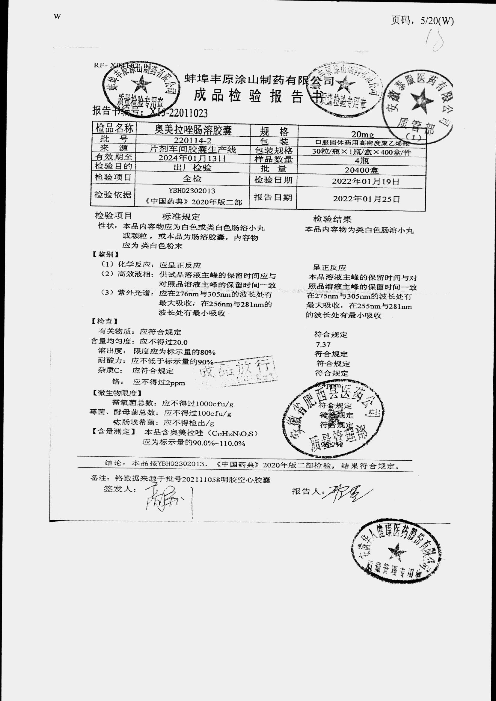 | 奥美拉唑肠溶胶囊 | 20mg*30s | 220503-3 | 查看详情 |