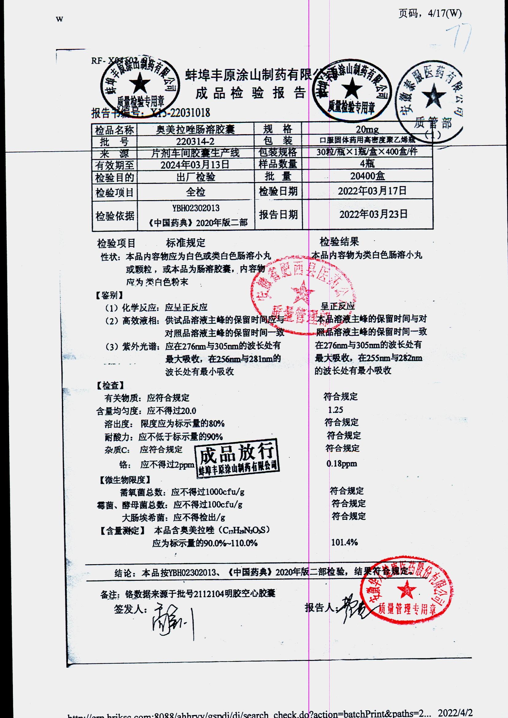 | 奥美拉唑肠溶胶囊 | 20mg*30s | 220414-3 | 查看详情 |