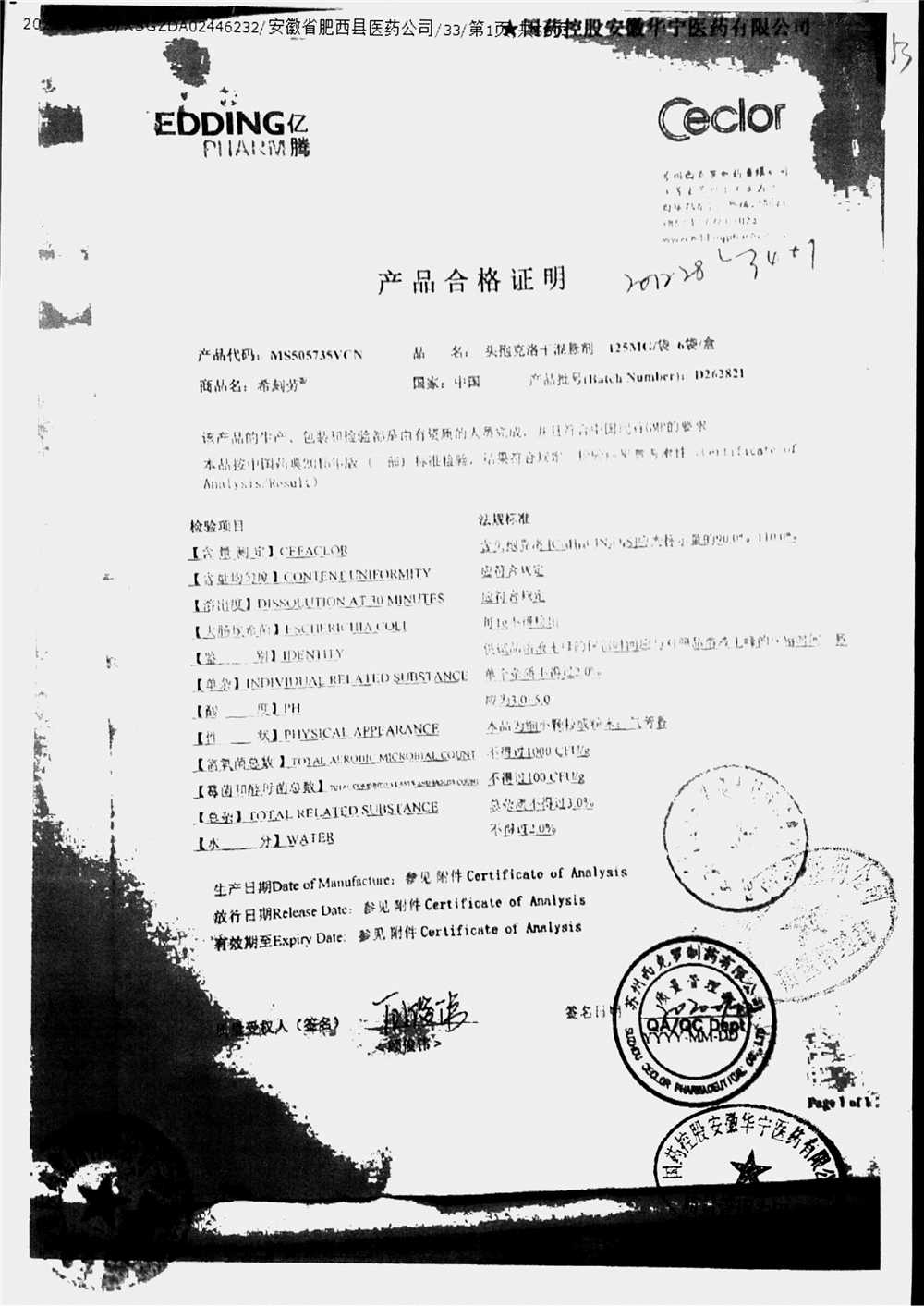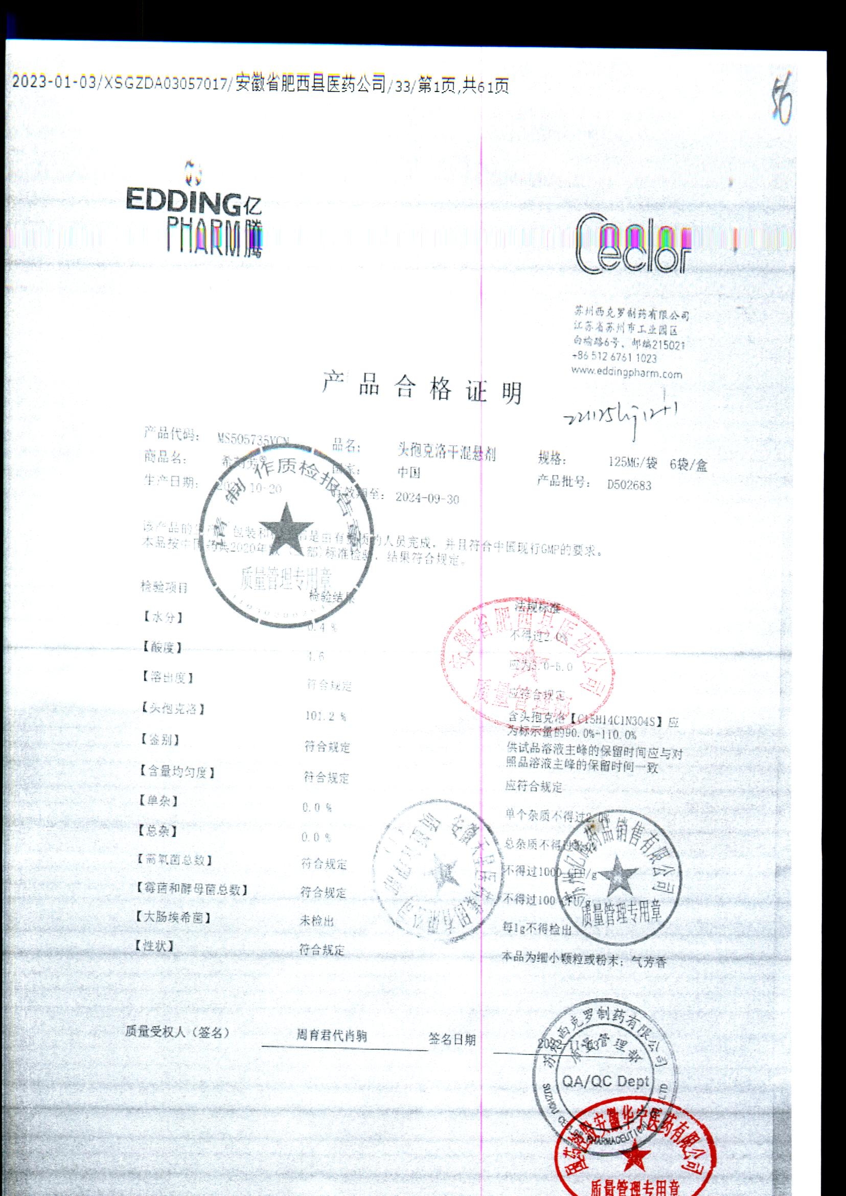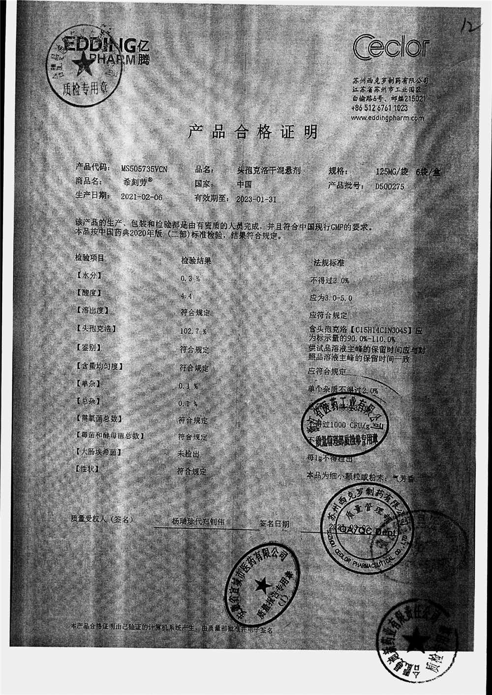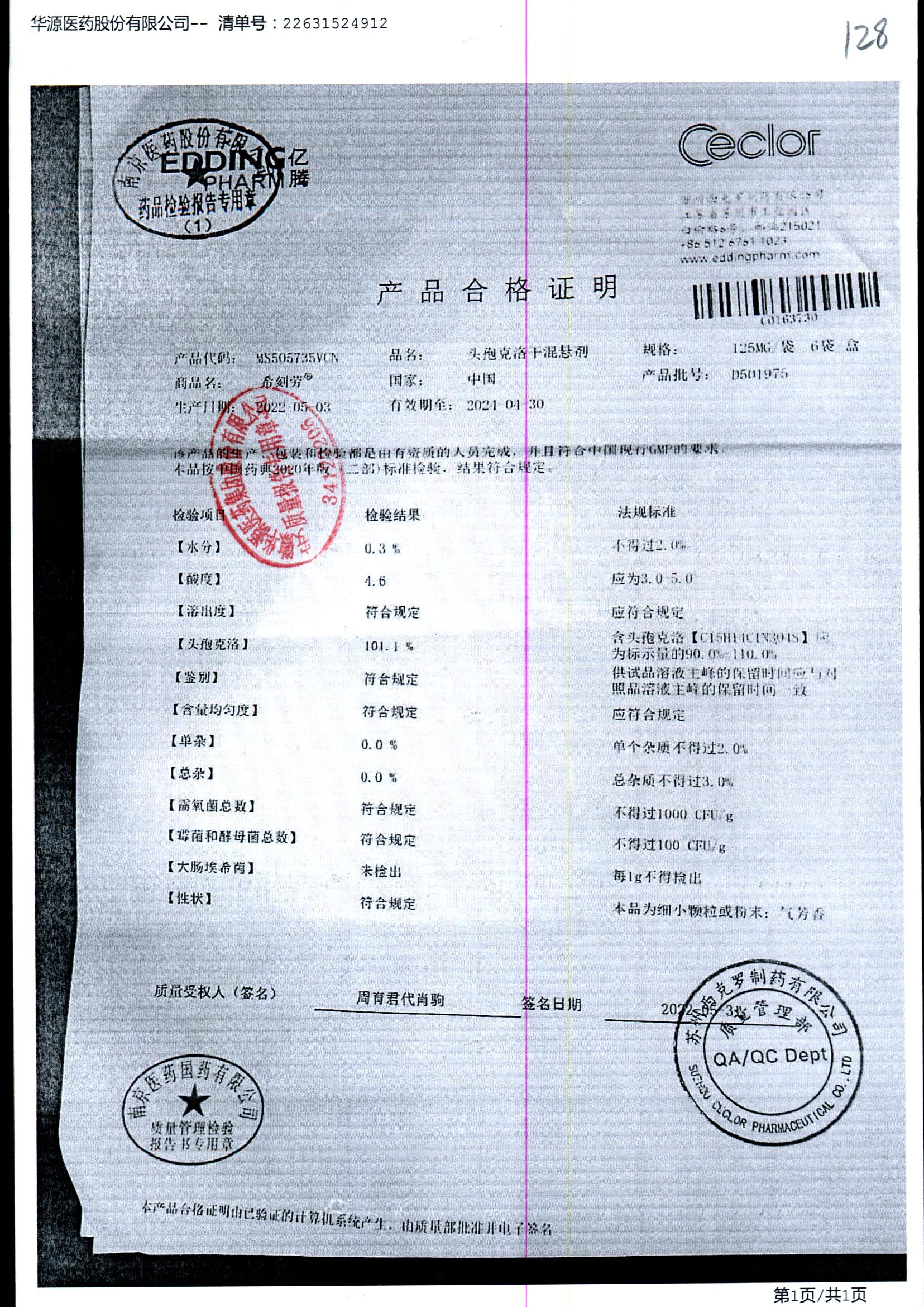 | 头孢克洛干混悬剂 | 0.125g*6袋 | D262821(2/2) | 查看详情 |