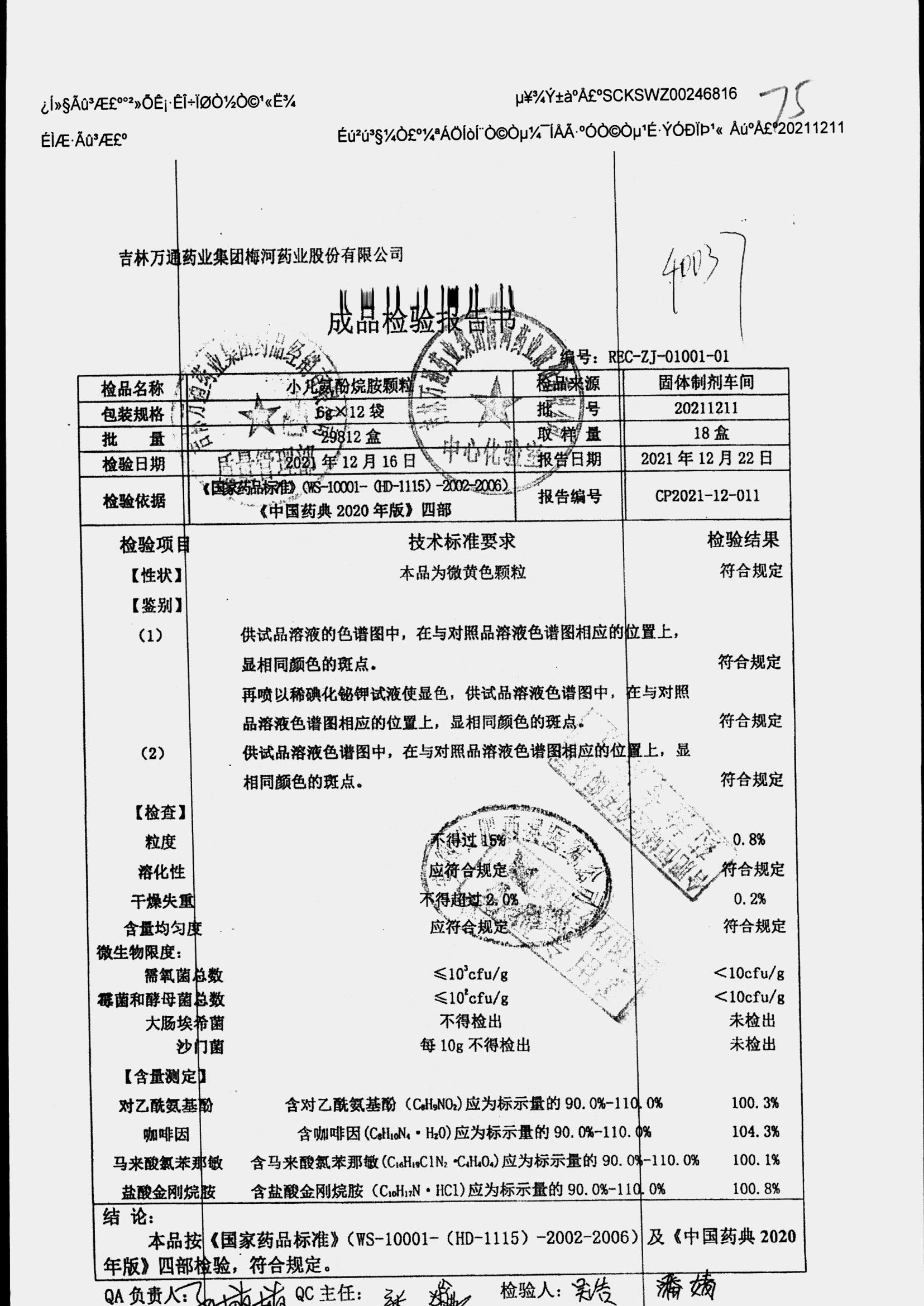 | 小儿氨酚烷胺颗粒 | 6g*12袋 | 20211211 | 查看详情 |
