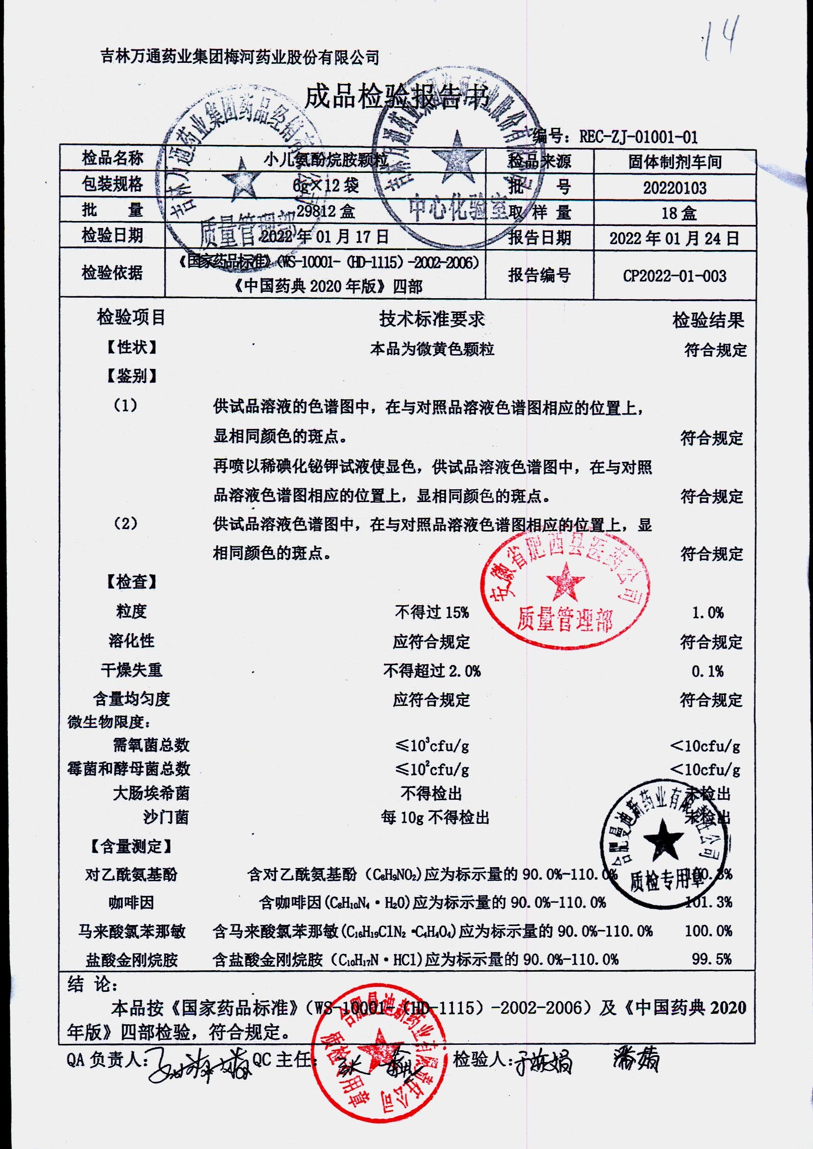 | 小儿氨酚烷胺颗粒 | 6g*12袋 | 20220103 | 查看详情 |