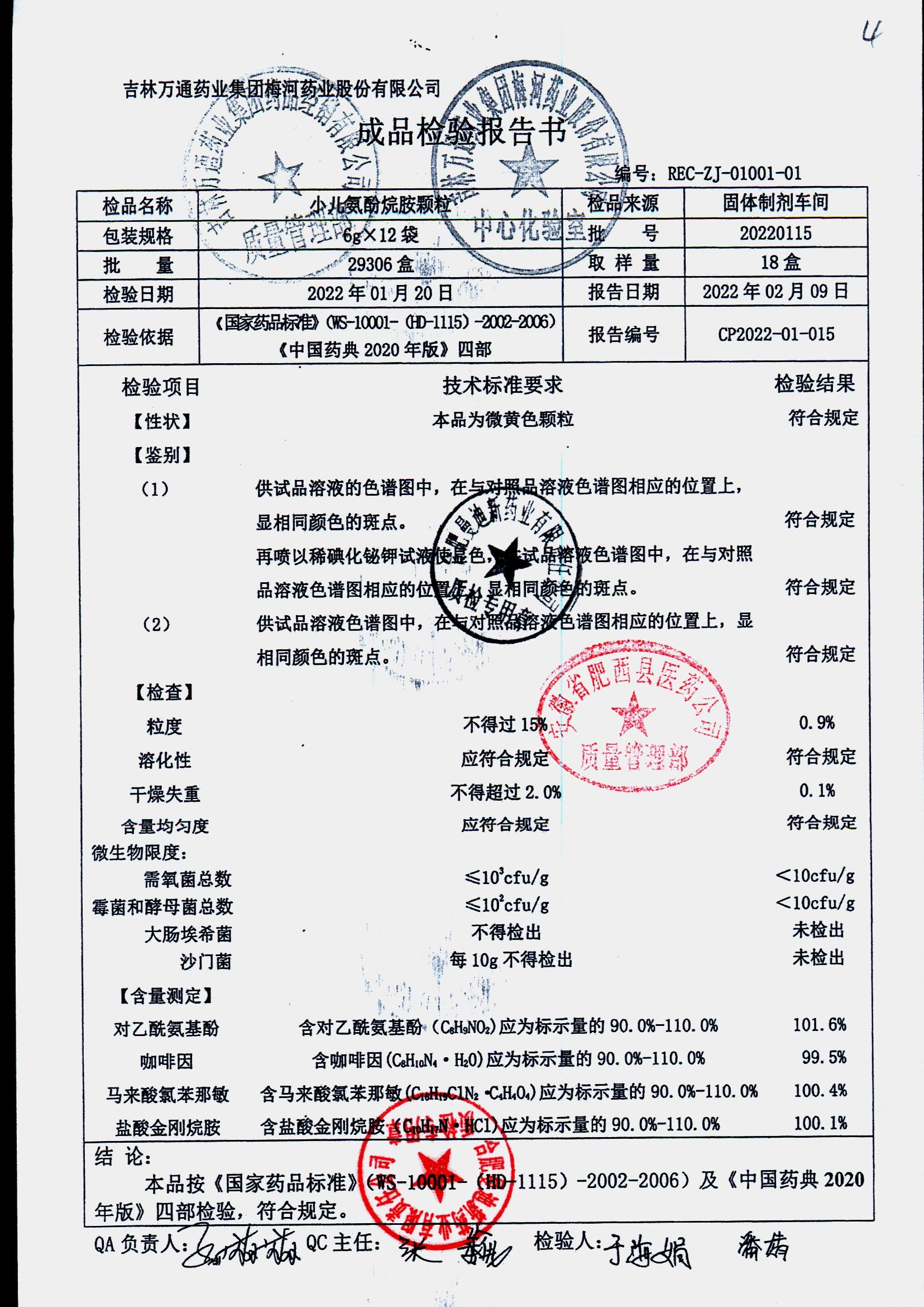 | 小儿氨酚烷胺颗粒 | 6g*12袋 | 20220115 | 查看详情 |