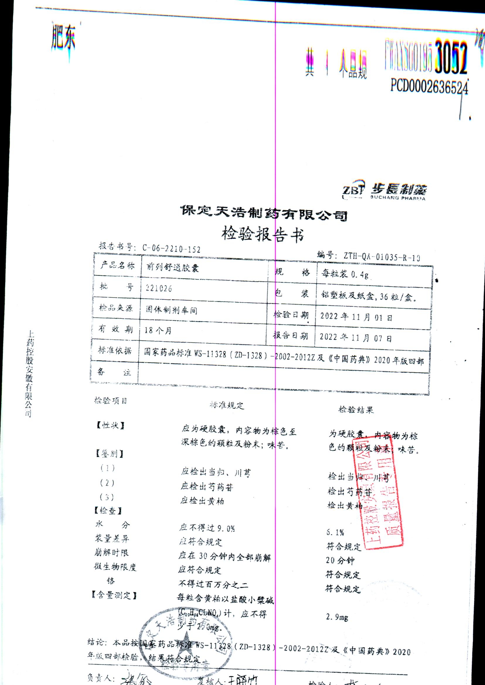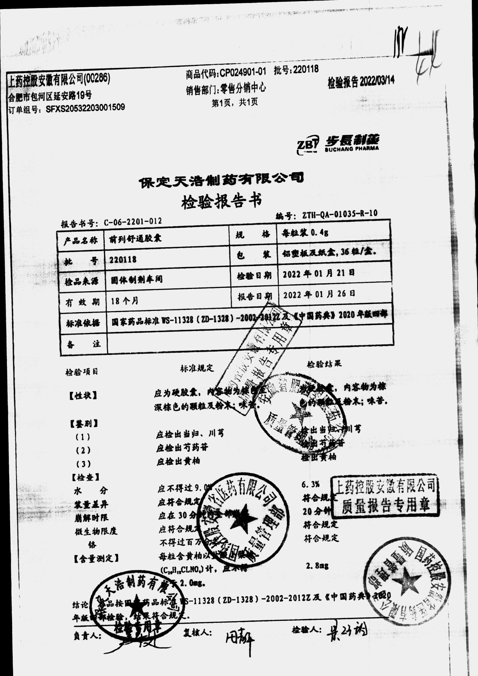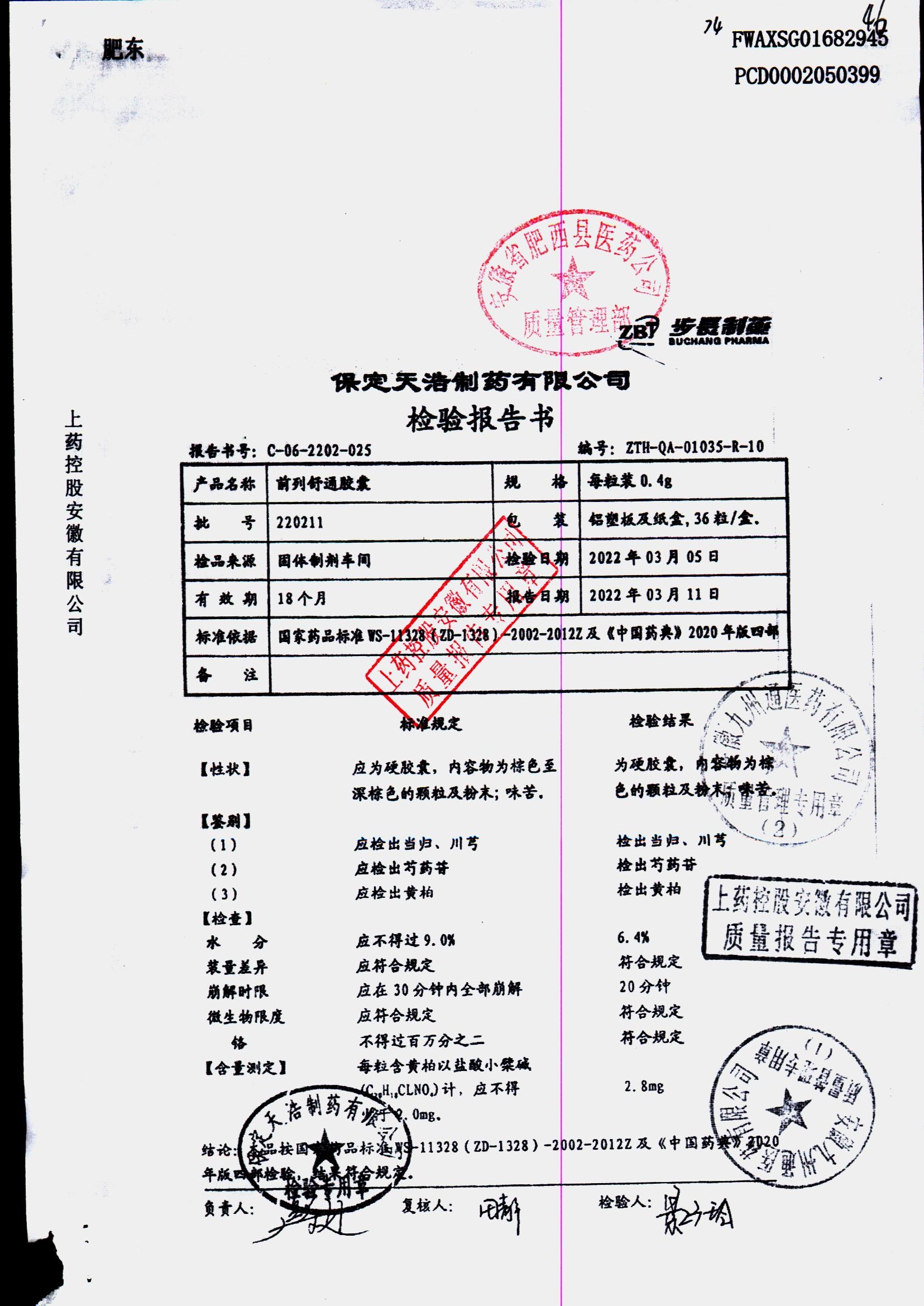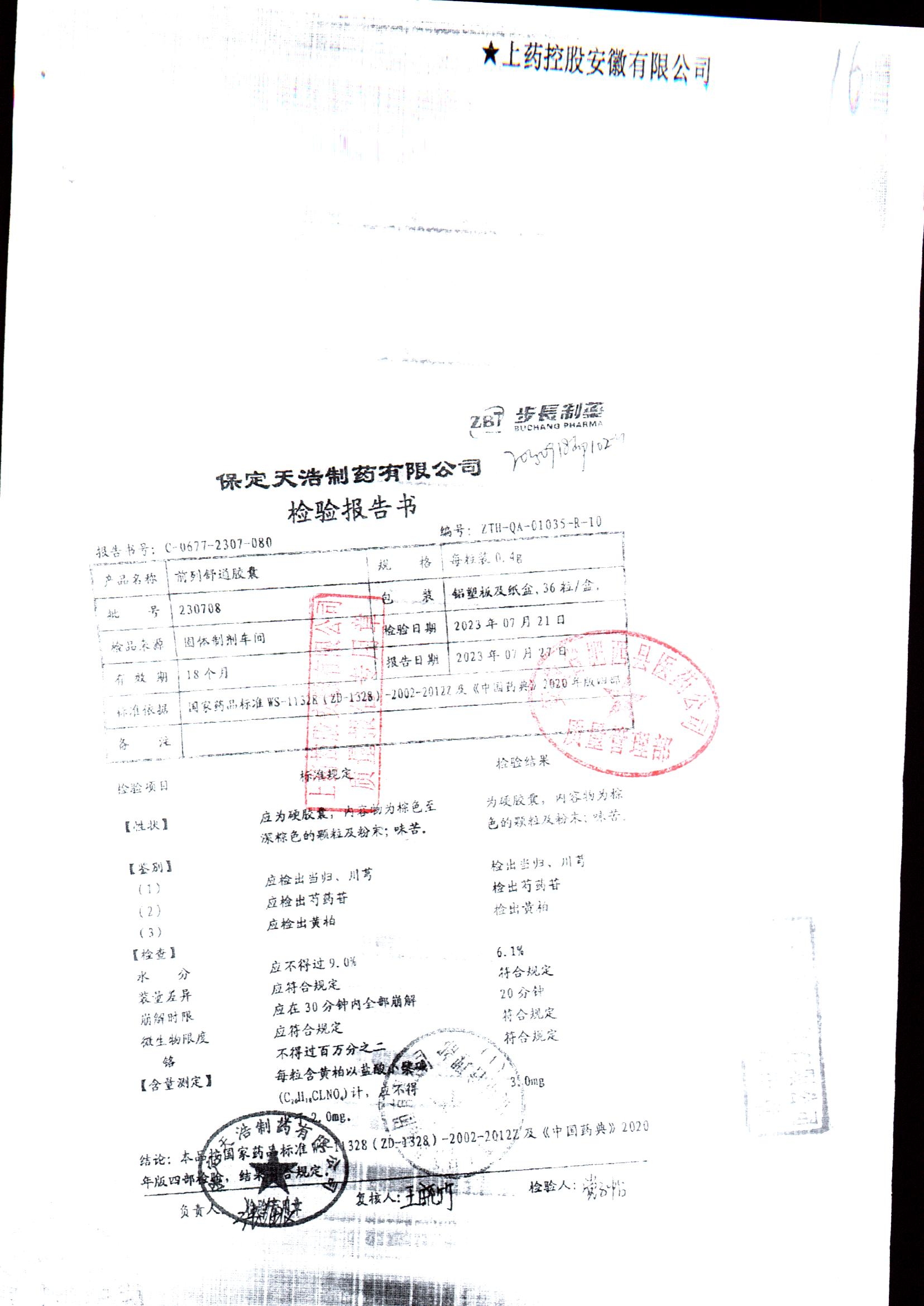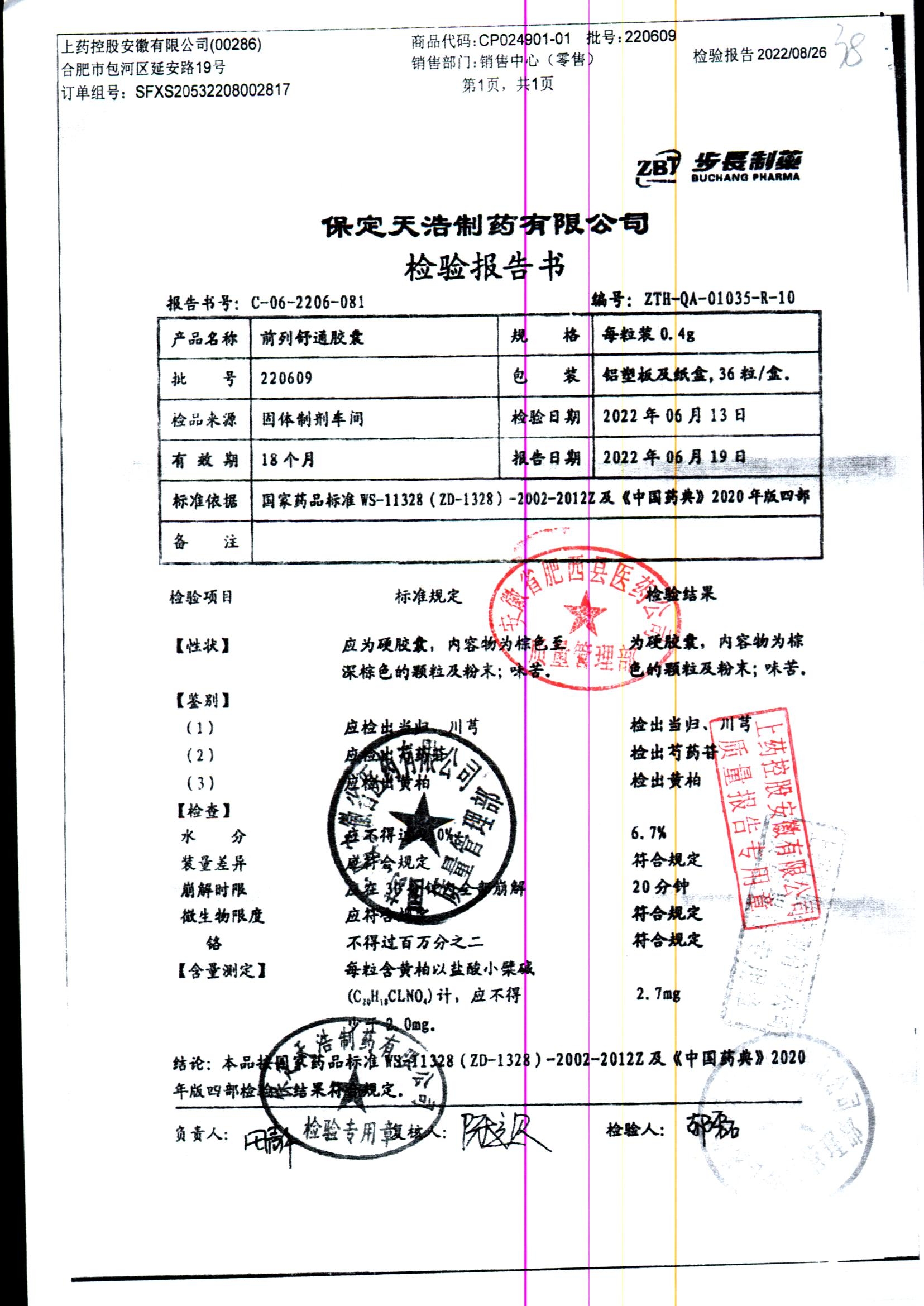 | 前列舒通胶囊 | 0.4g*18s*2板 | 240618 | 查看详情 |