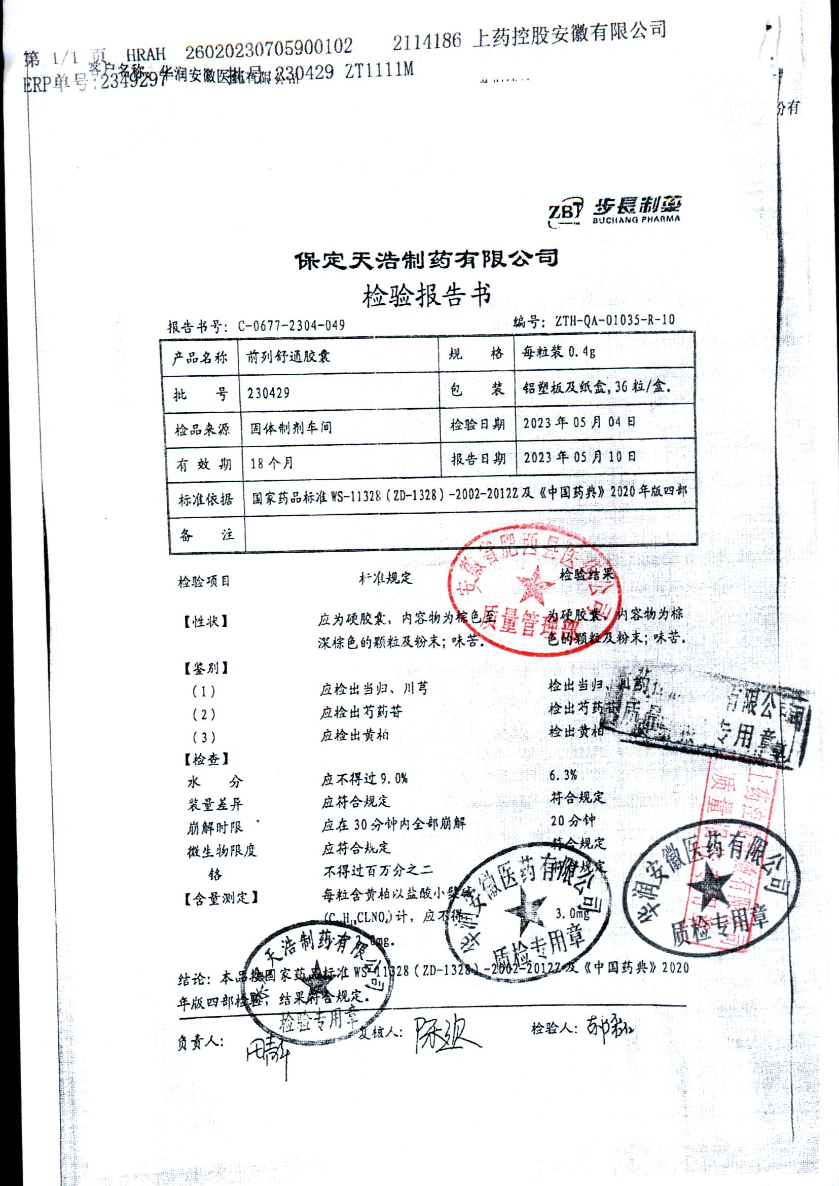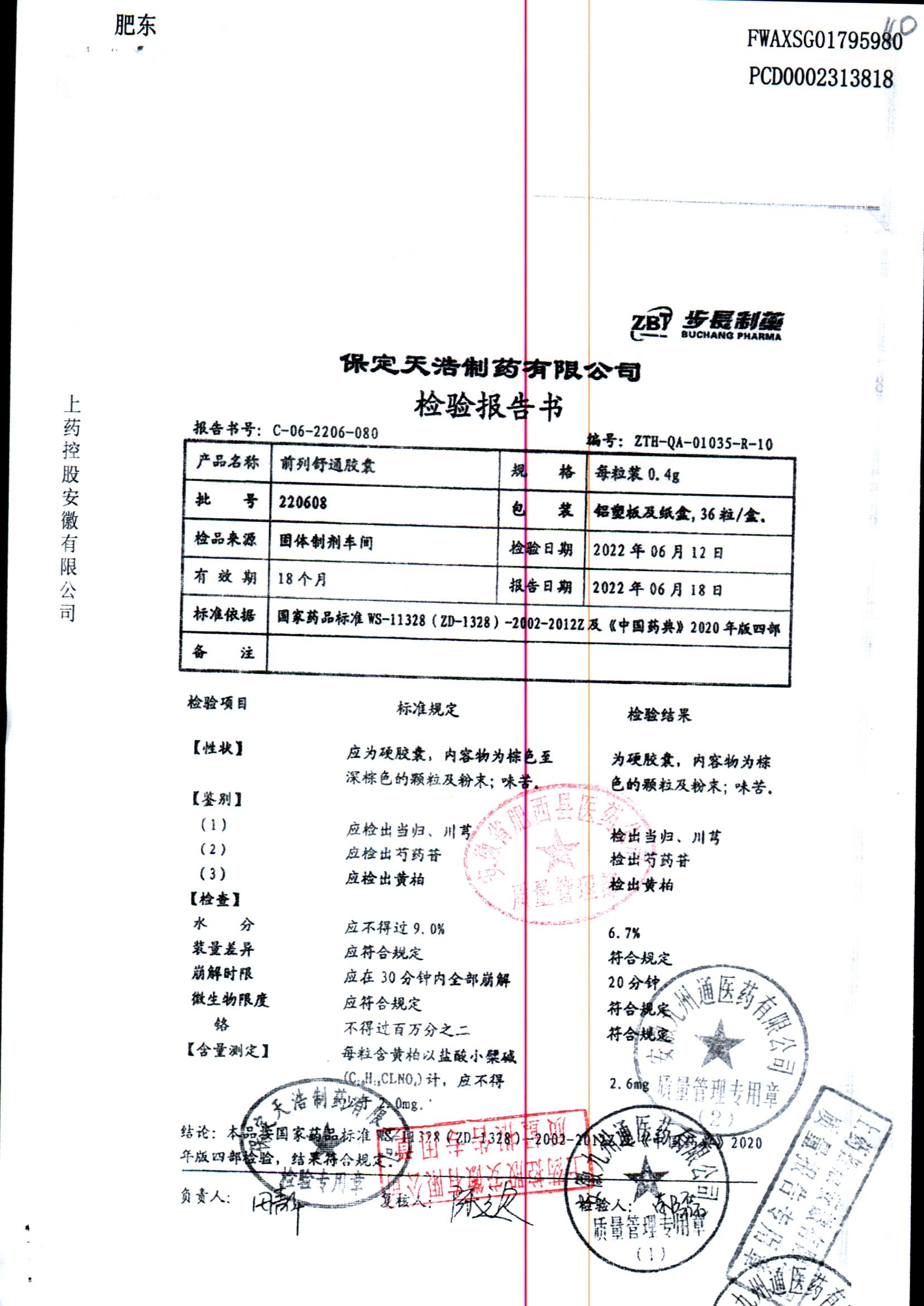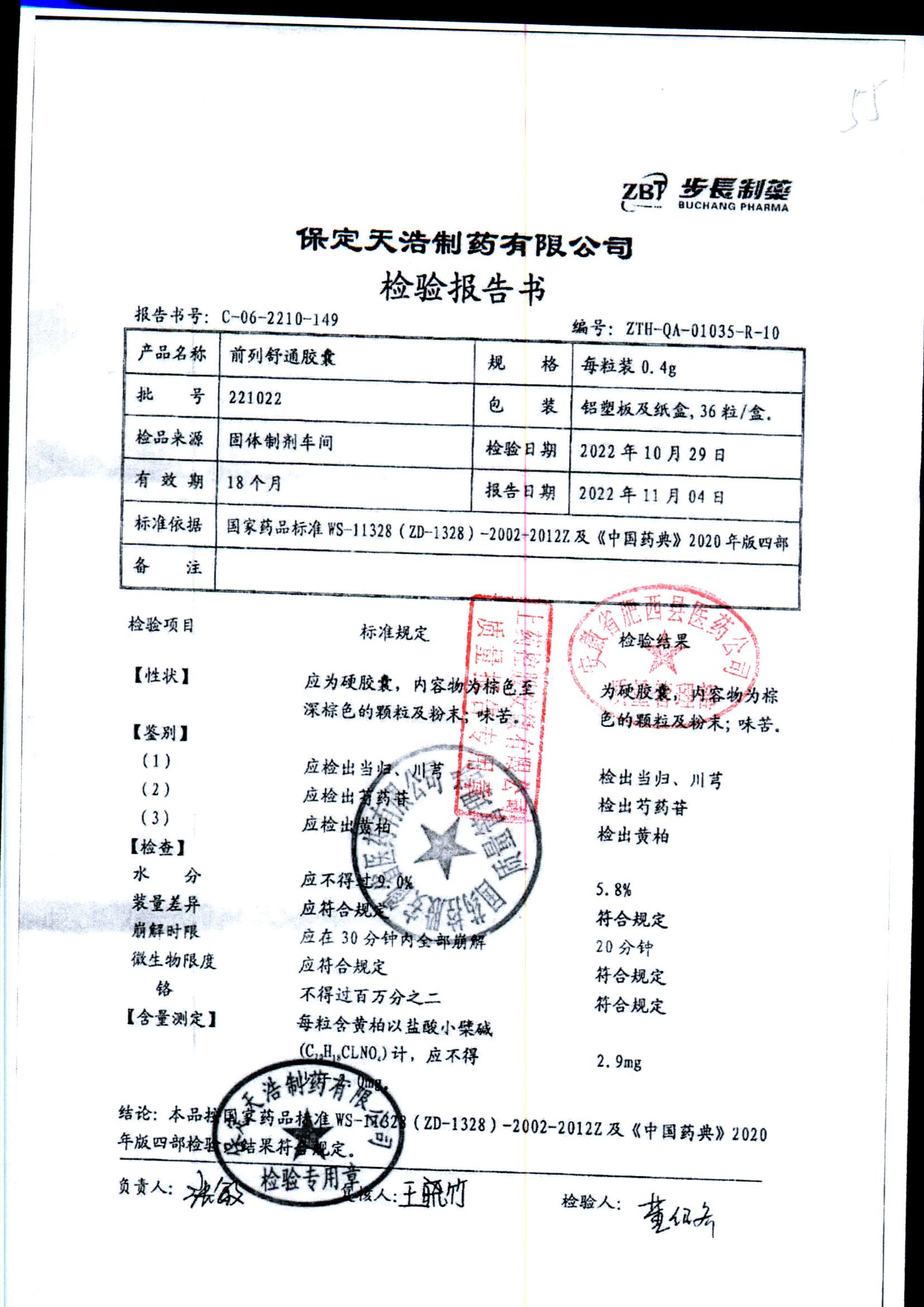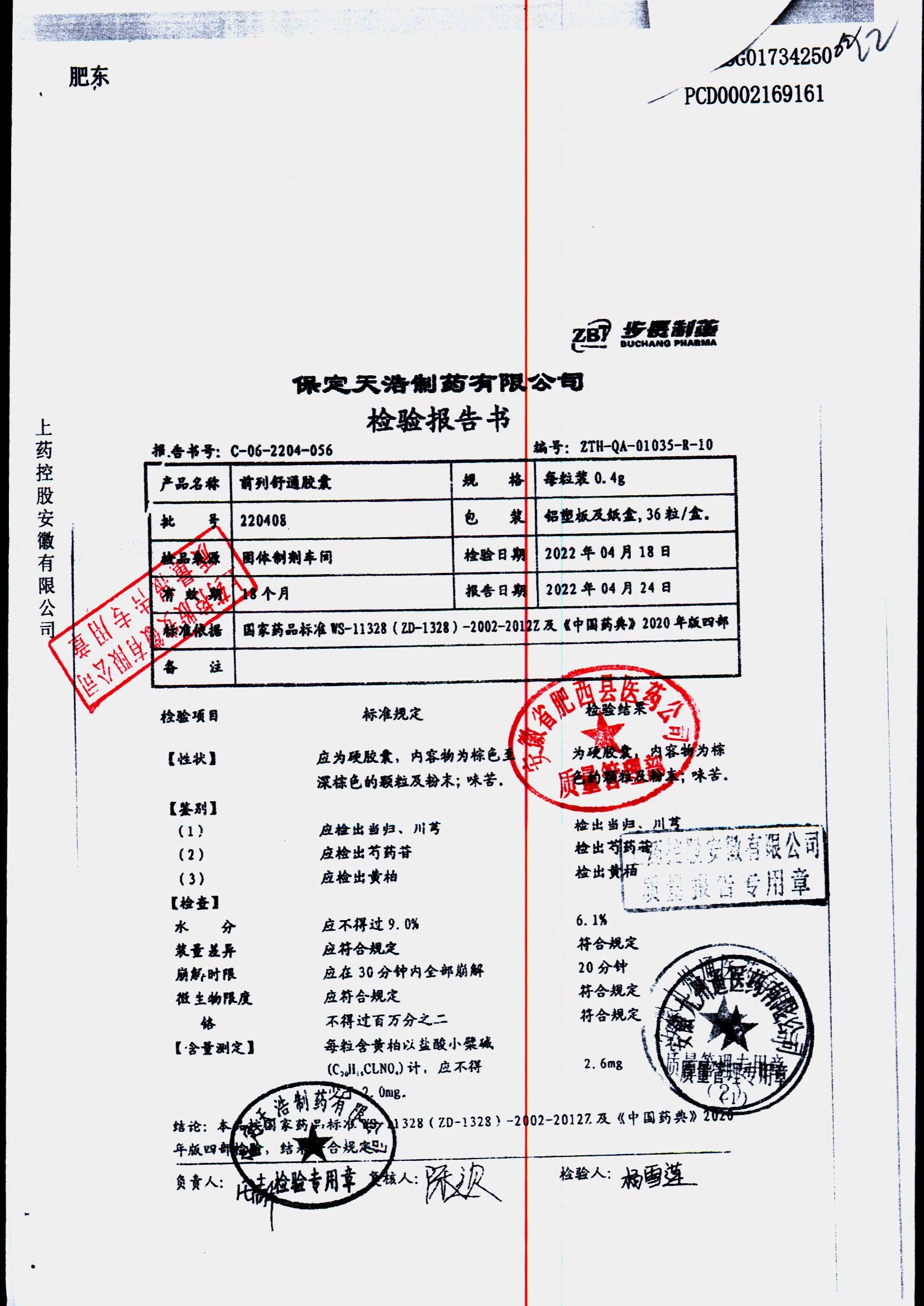 | 前列舒通胶囊 | 0.4g*18s*2板 | 240618 | 查看详情 |