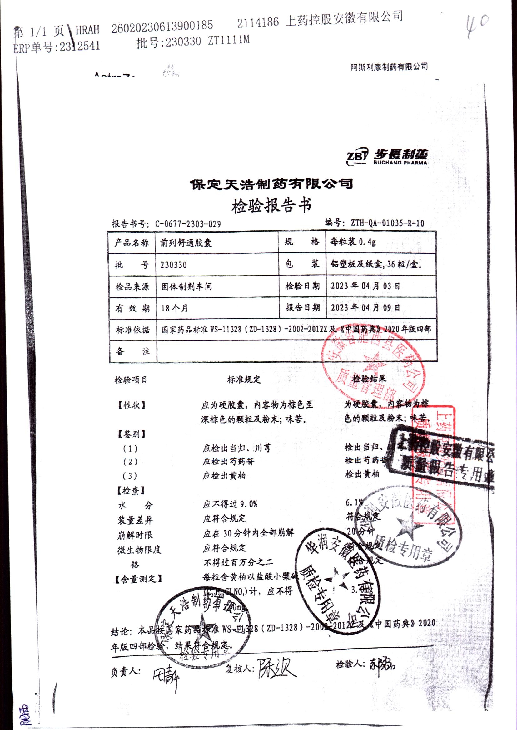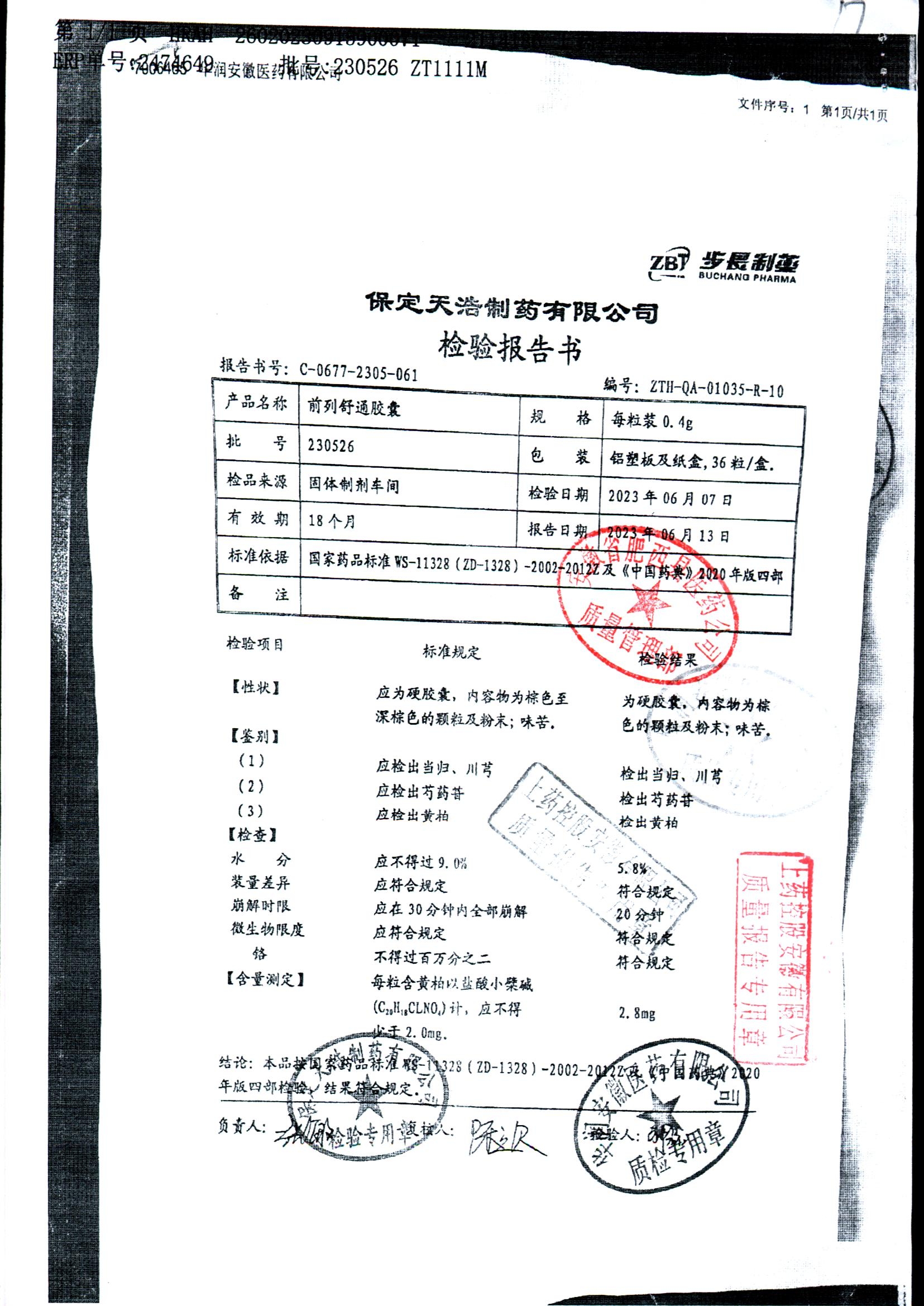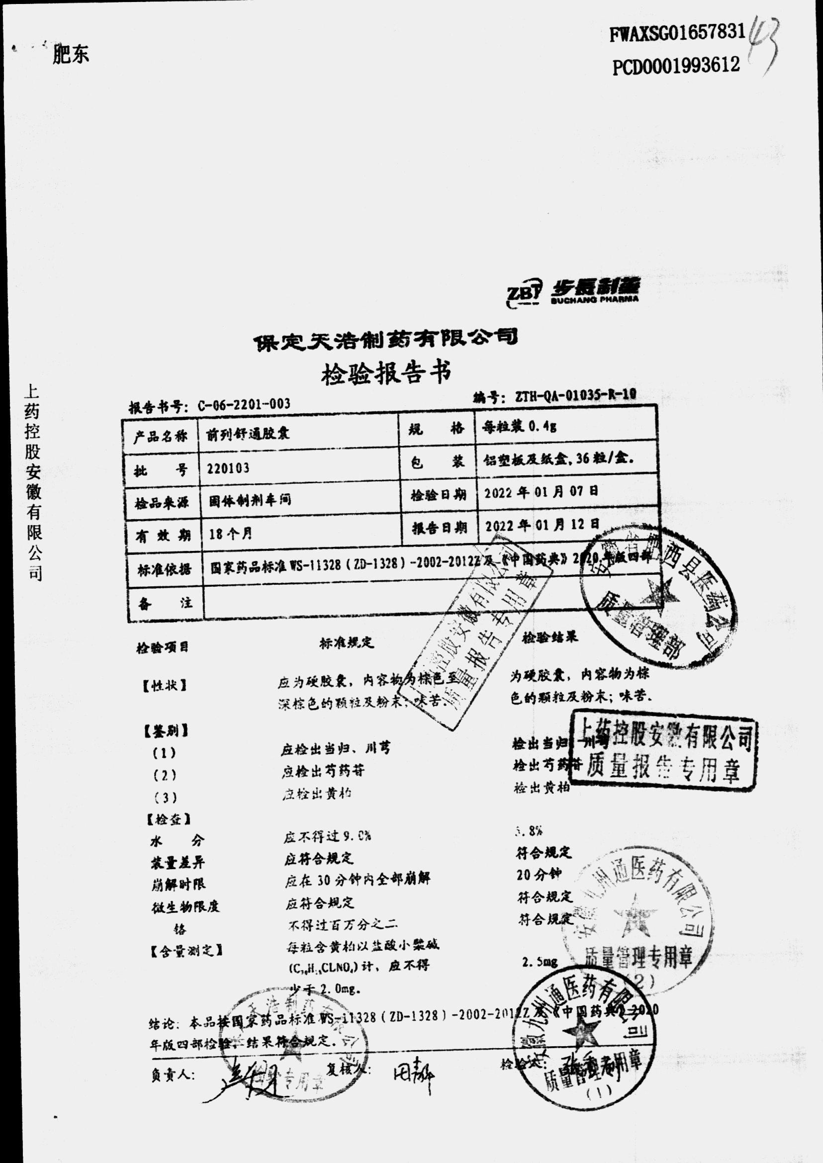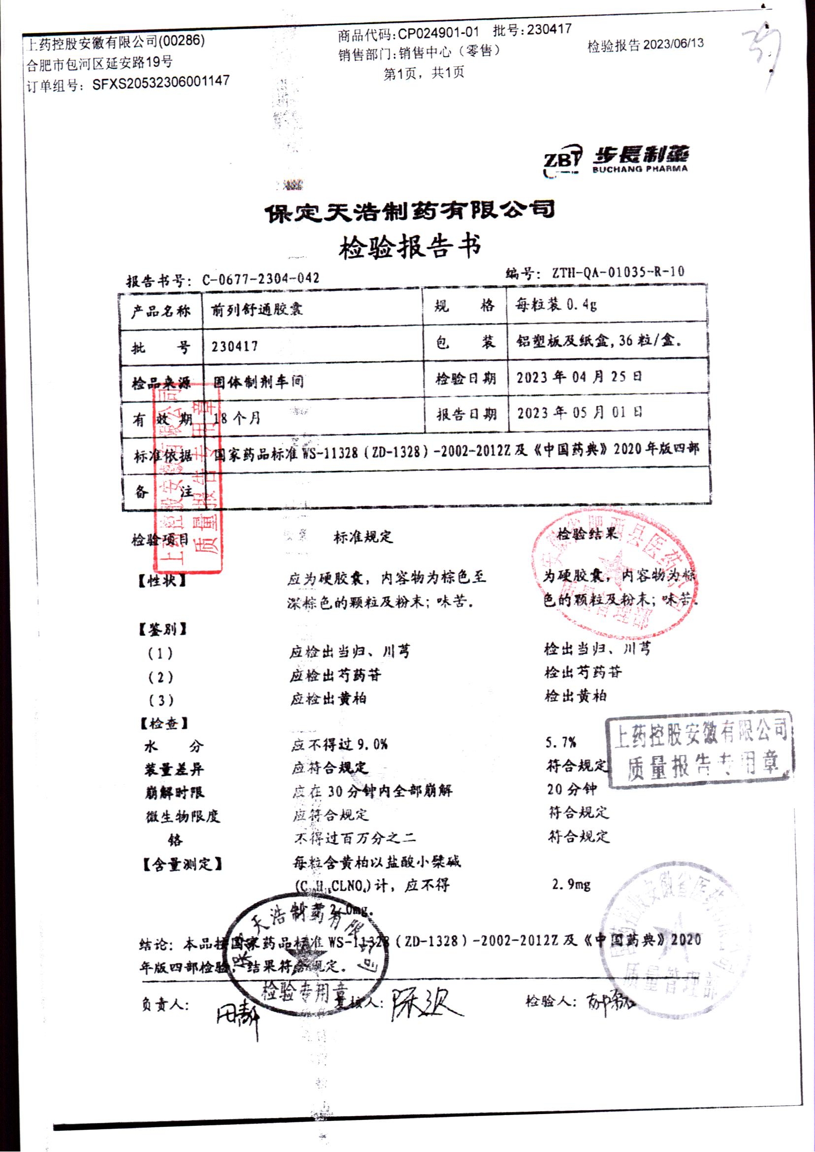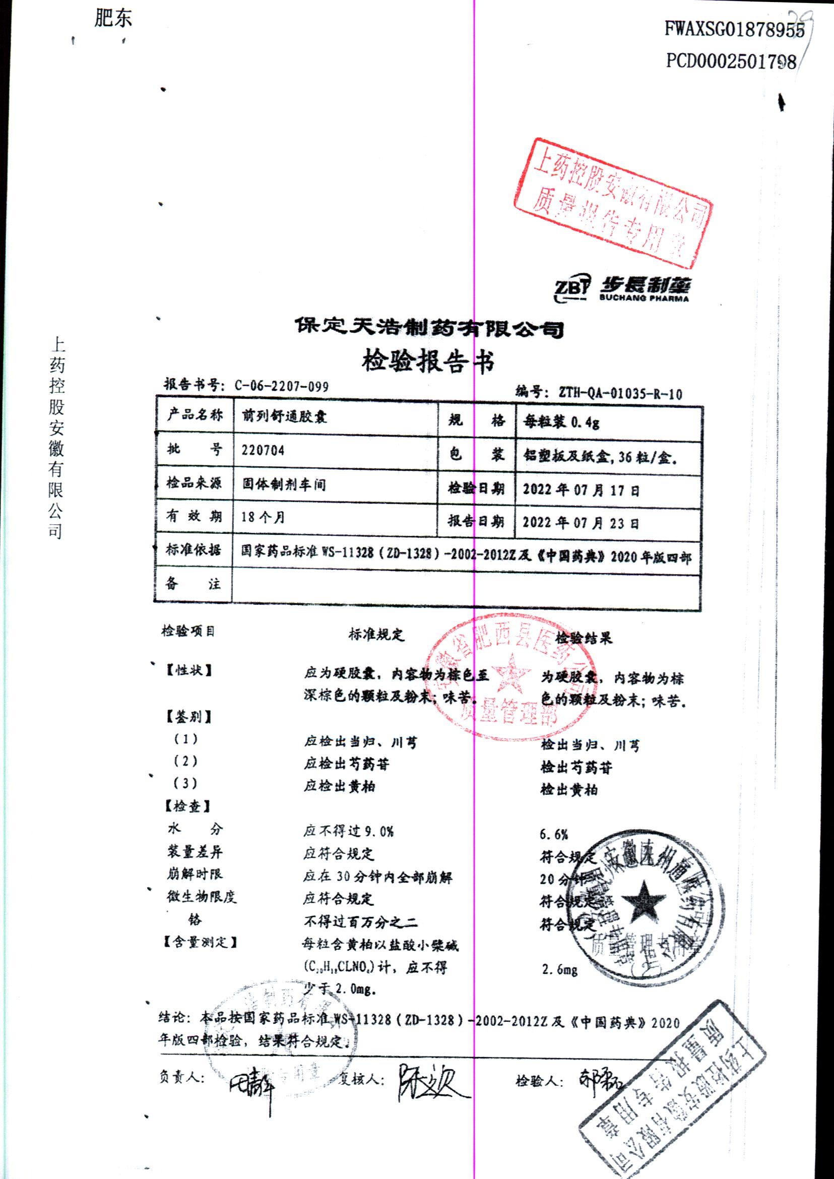| 前列舒通胶囊 | 0.4g*18s*2板 | 240618 | 查看详情 |