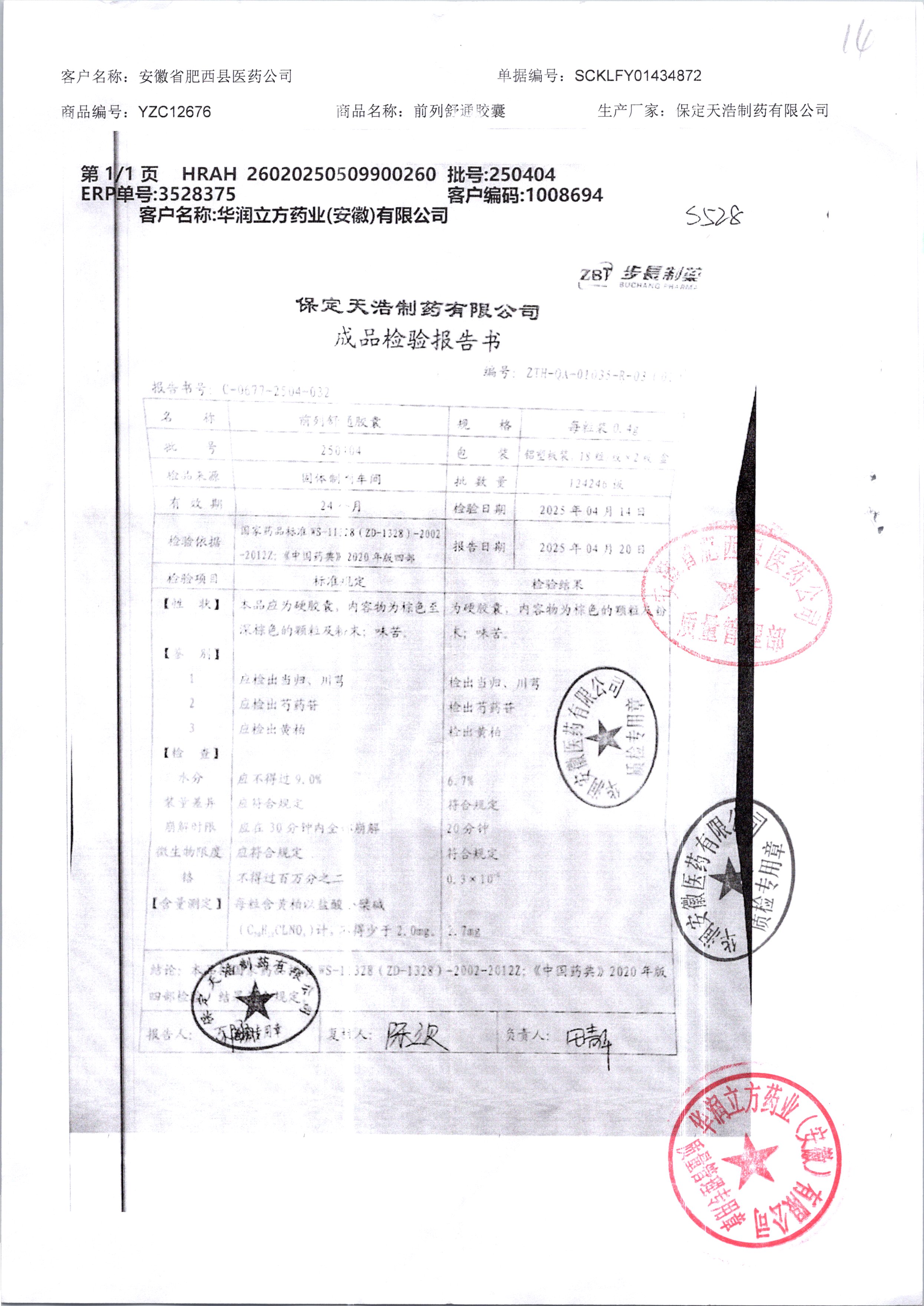 | 前列舒通胶囊 | 0.4g*18s*2板 | 250404 | 查看详情 |