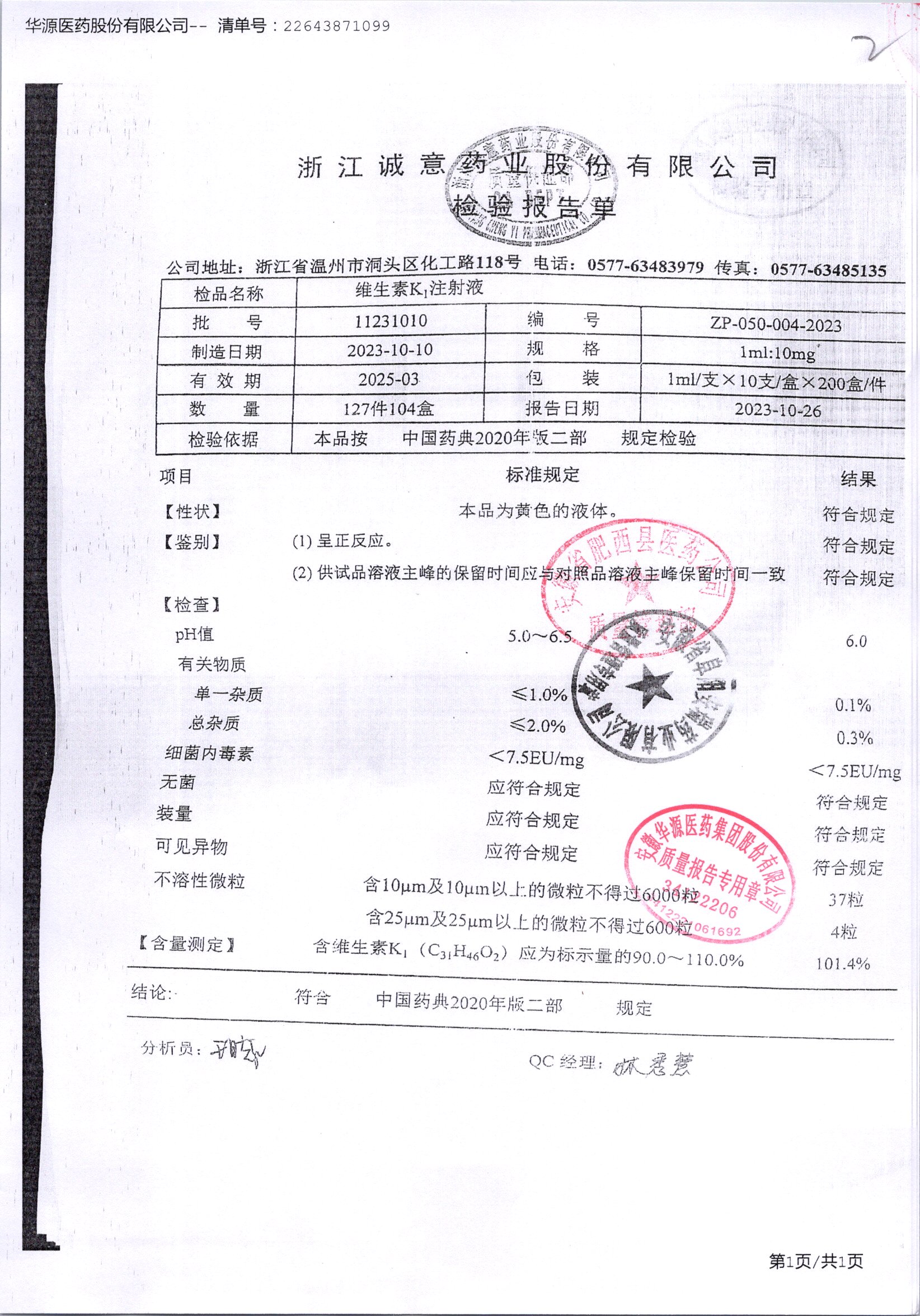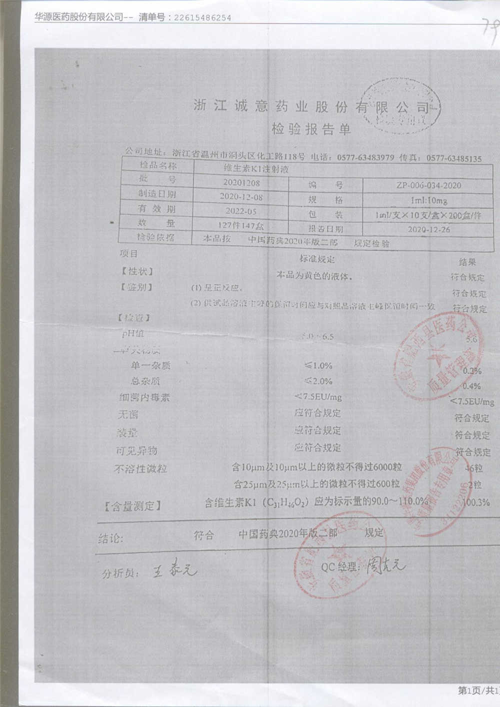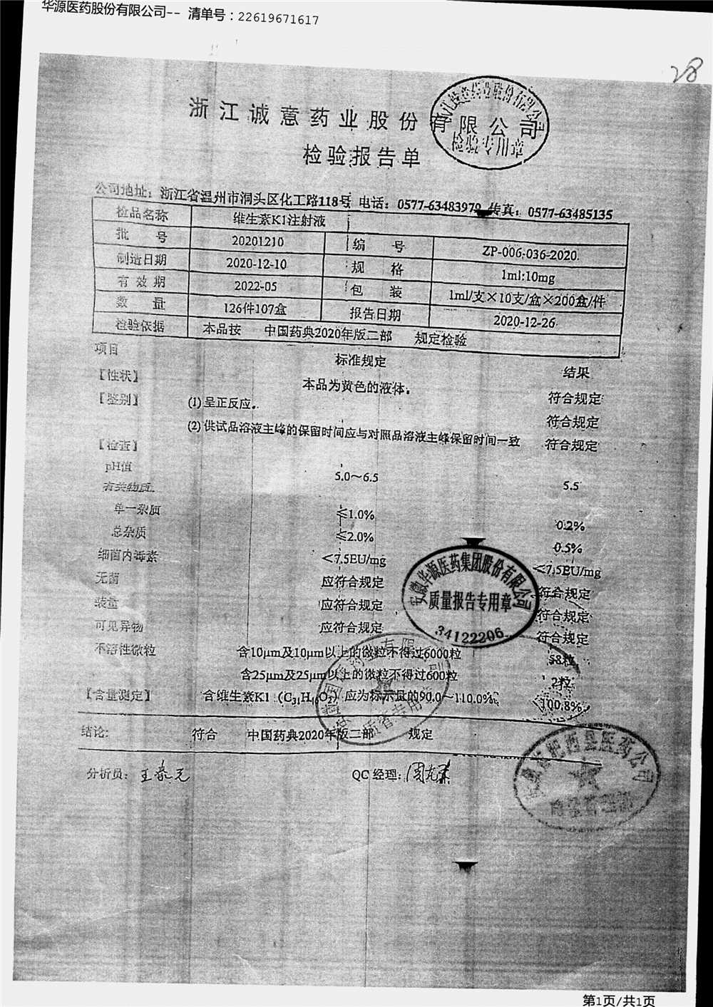 | 维生素K1注射液 | 1ml:10mg*10支 | 20201208 | 查看详情 |