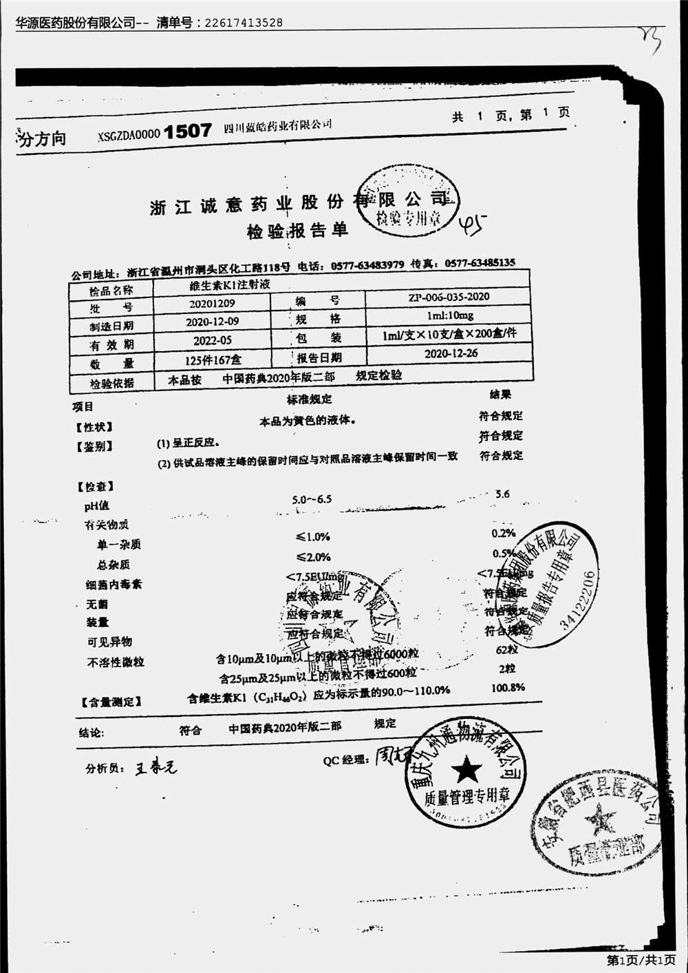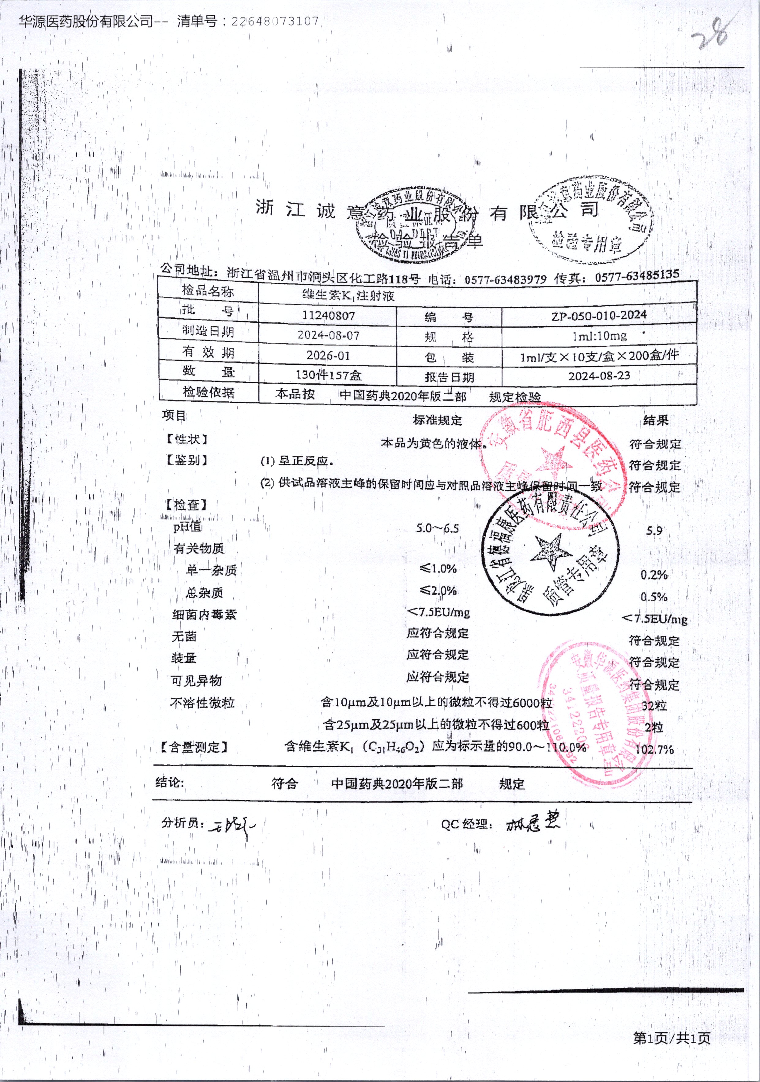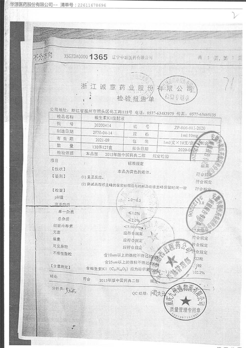 | 维生素K1注射液 | 1ml:10mg*10支 | 20201208 | 查看详情 |