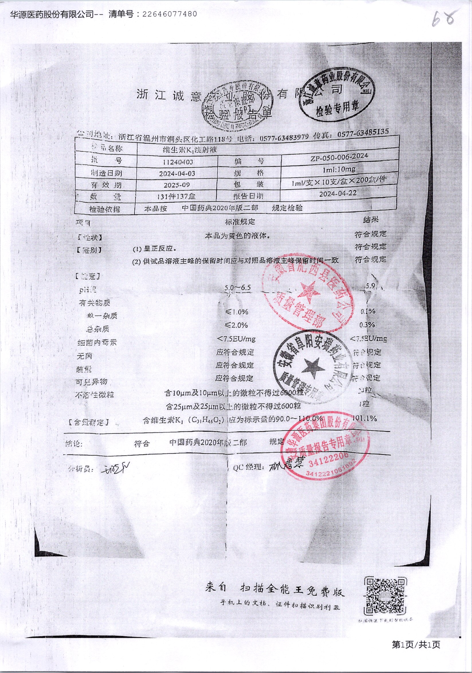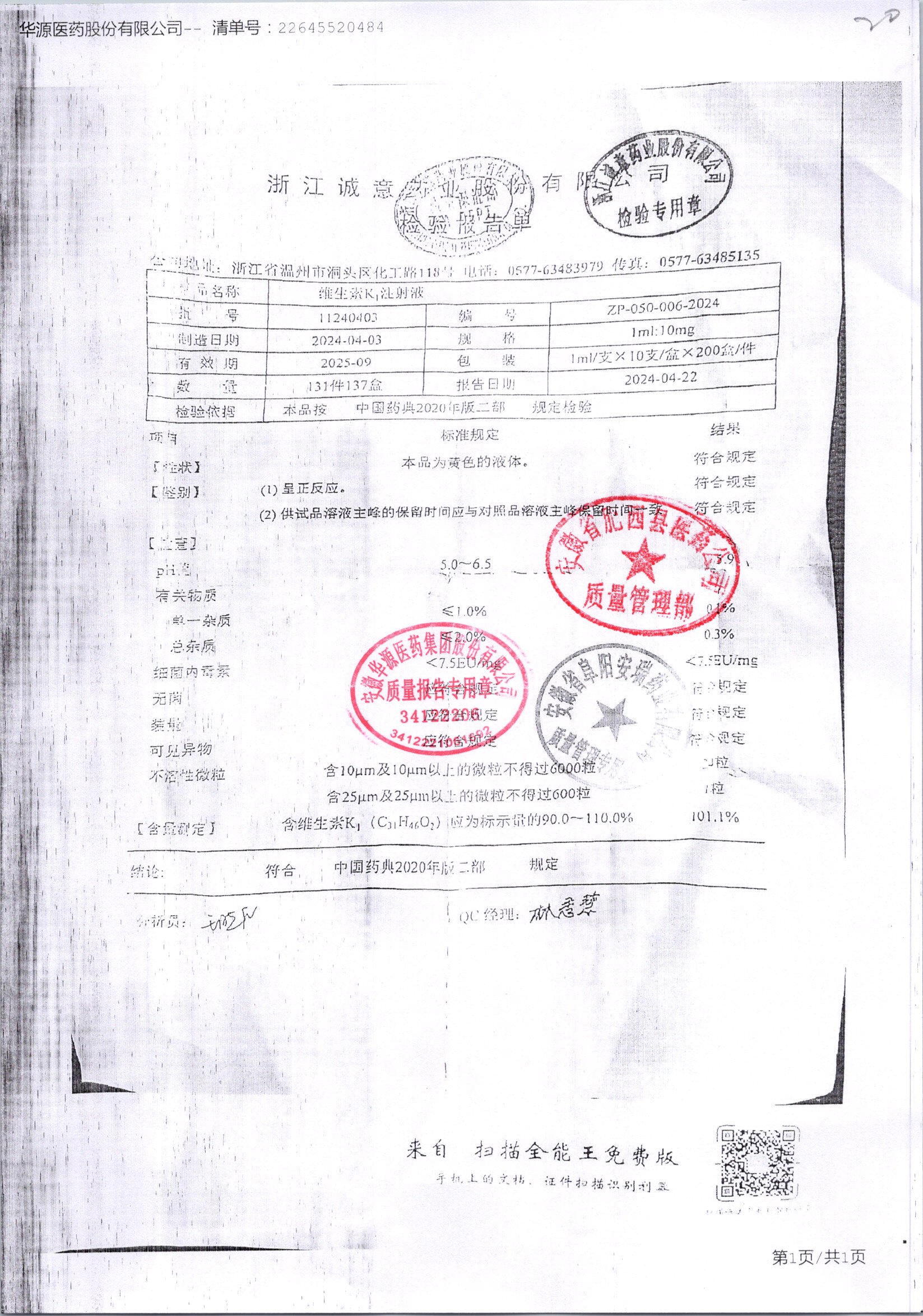 | 维生素K1注射液 | 1ml:10mg*10支 | 20200414 | 查看详情 |