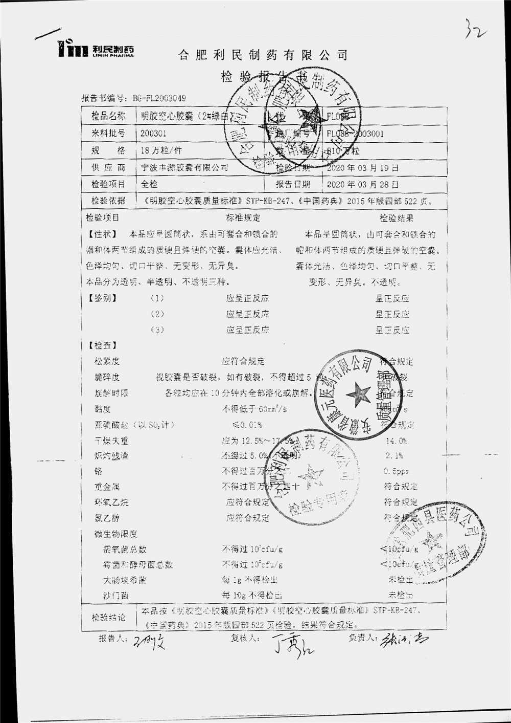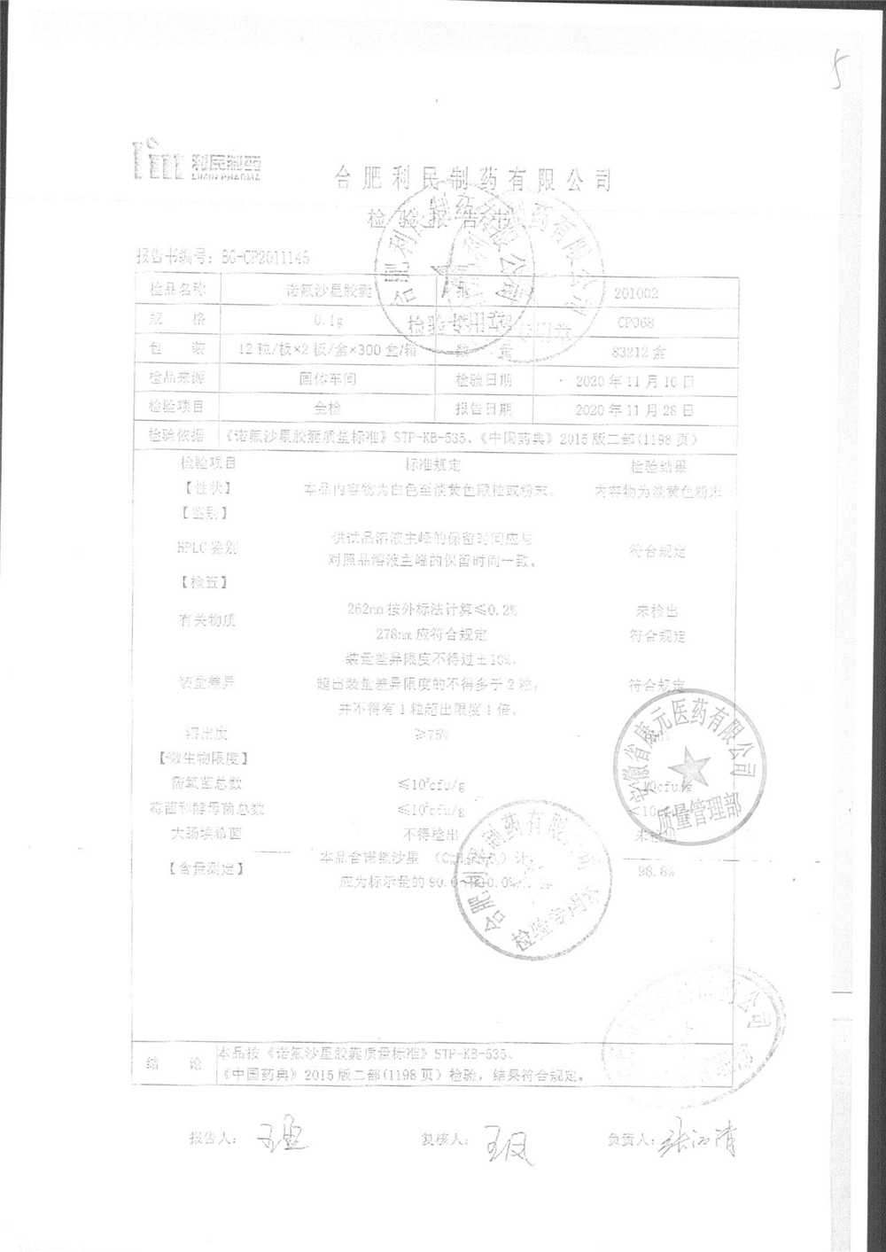 | 诺氟沙星胶囊 | 0.1g*12s*2板 | 201002(2/3) | 查看详情 |