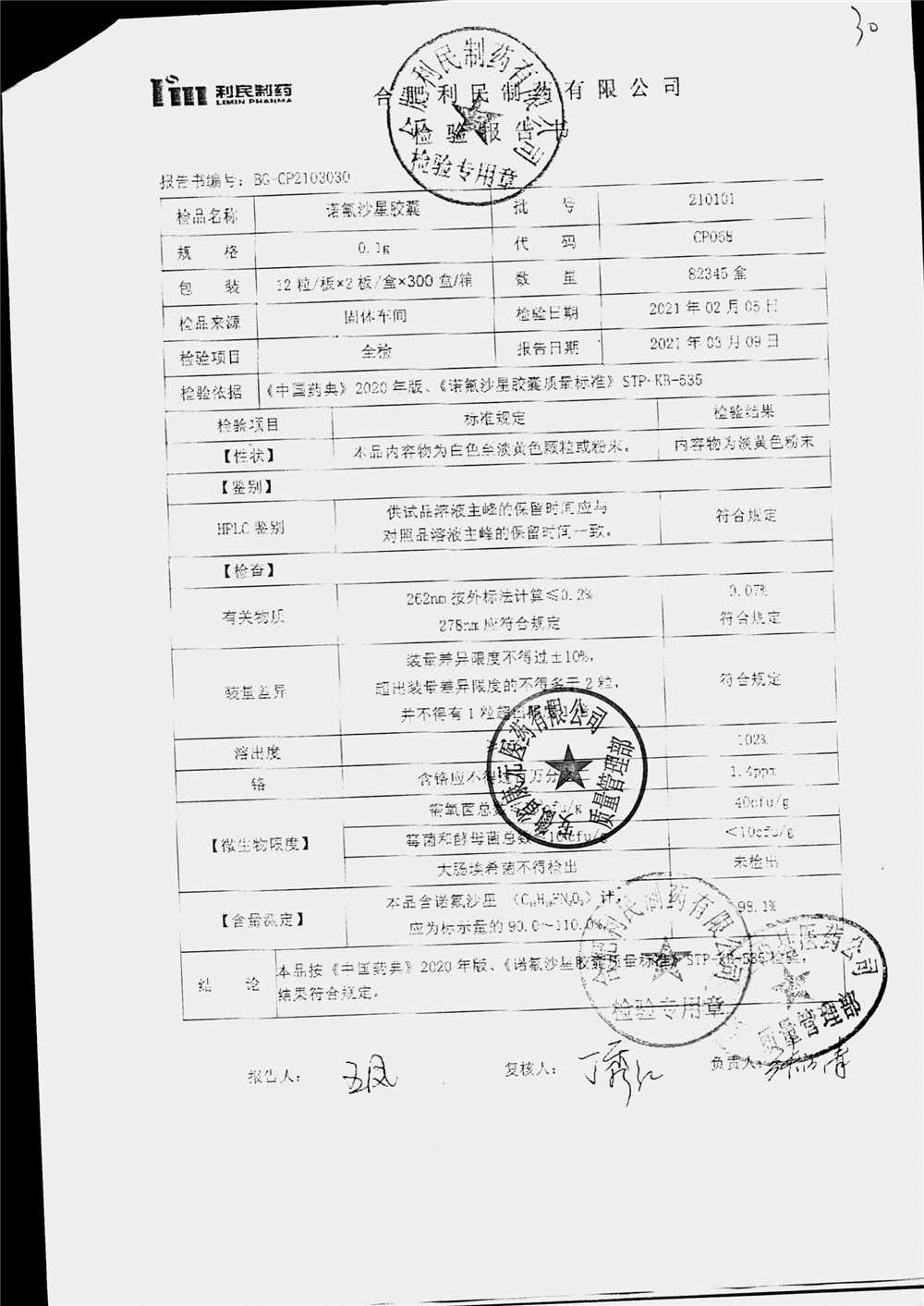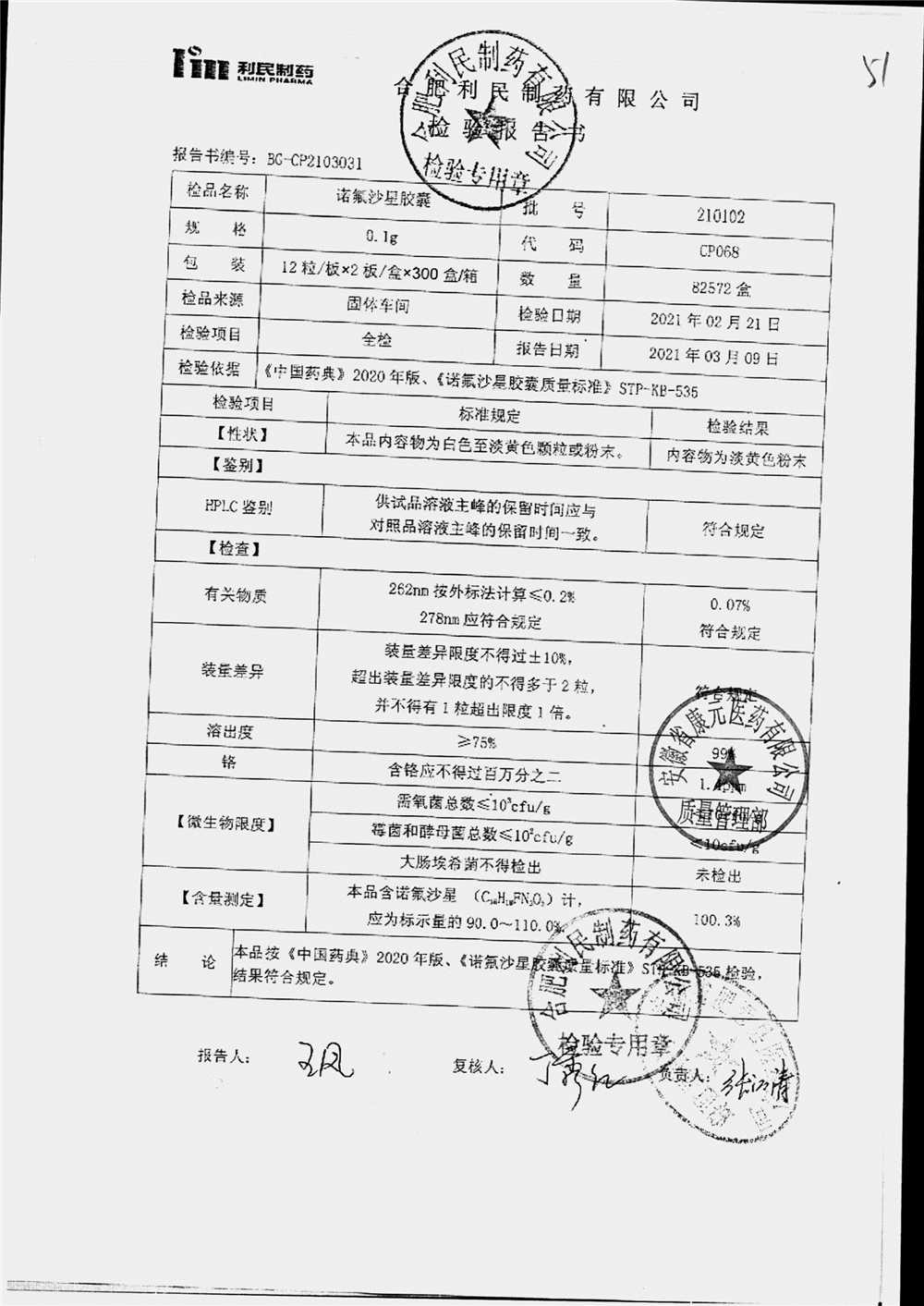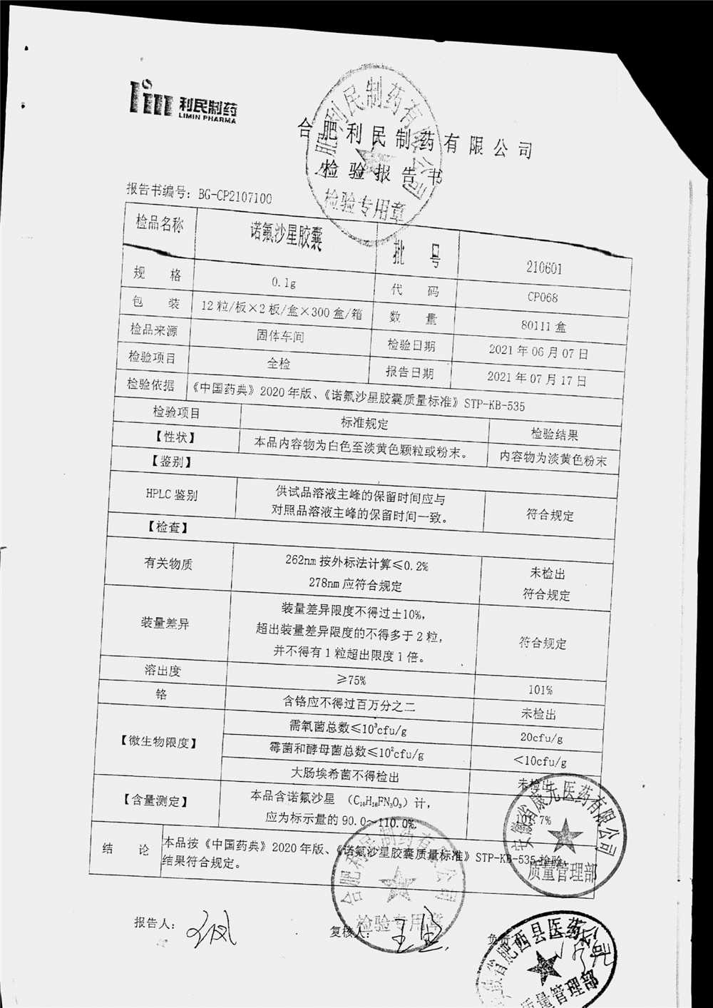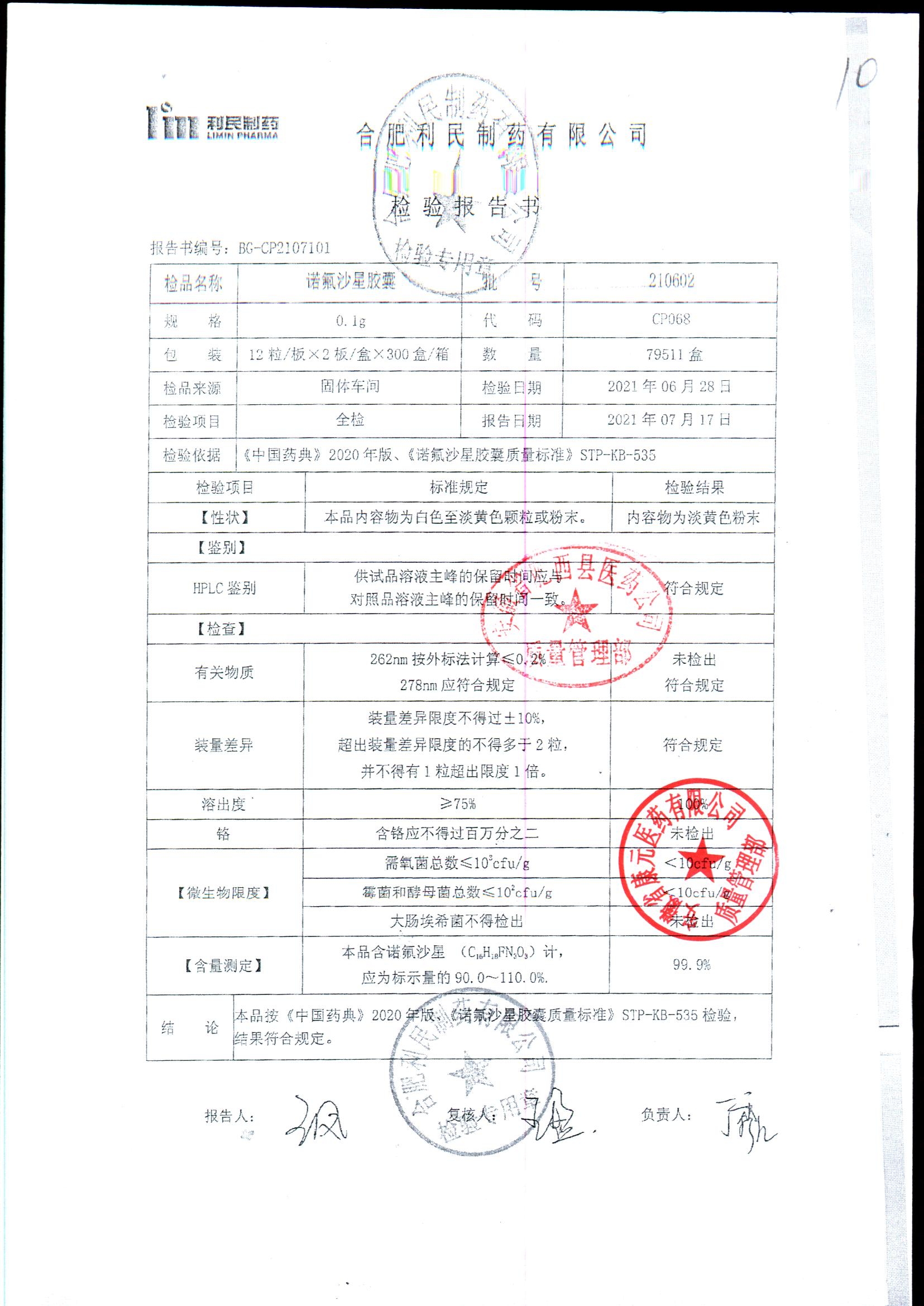 | 诺氟沙星胶囊 | 0.1g*12s*2板 | 210601 | 查看详情 |