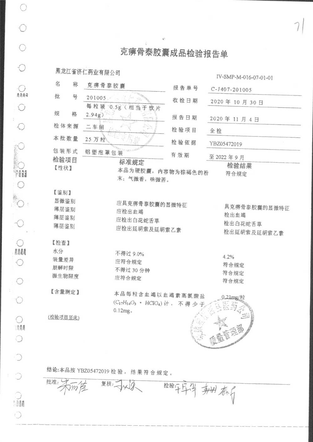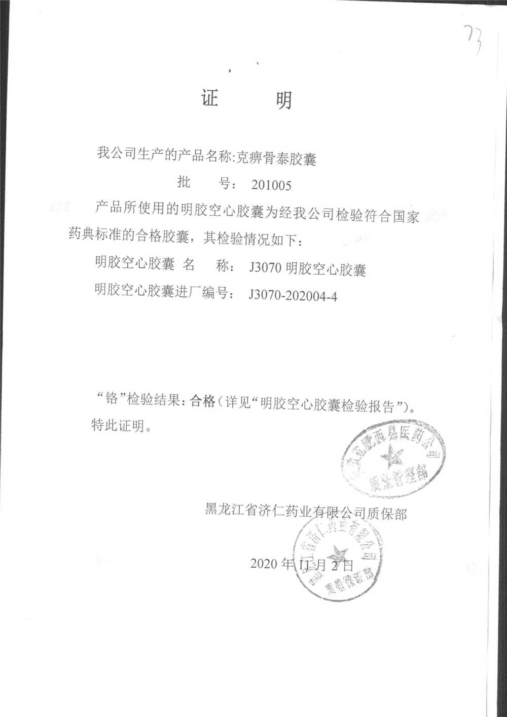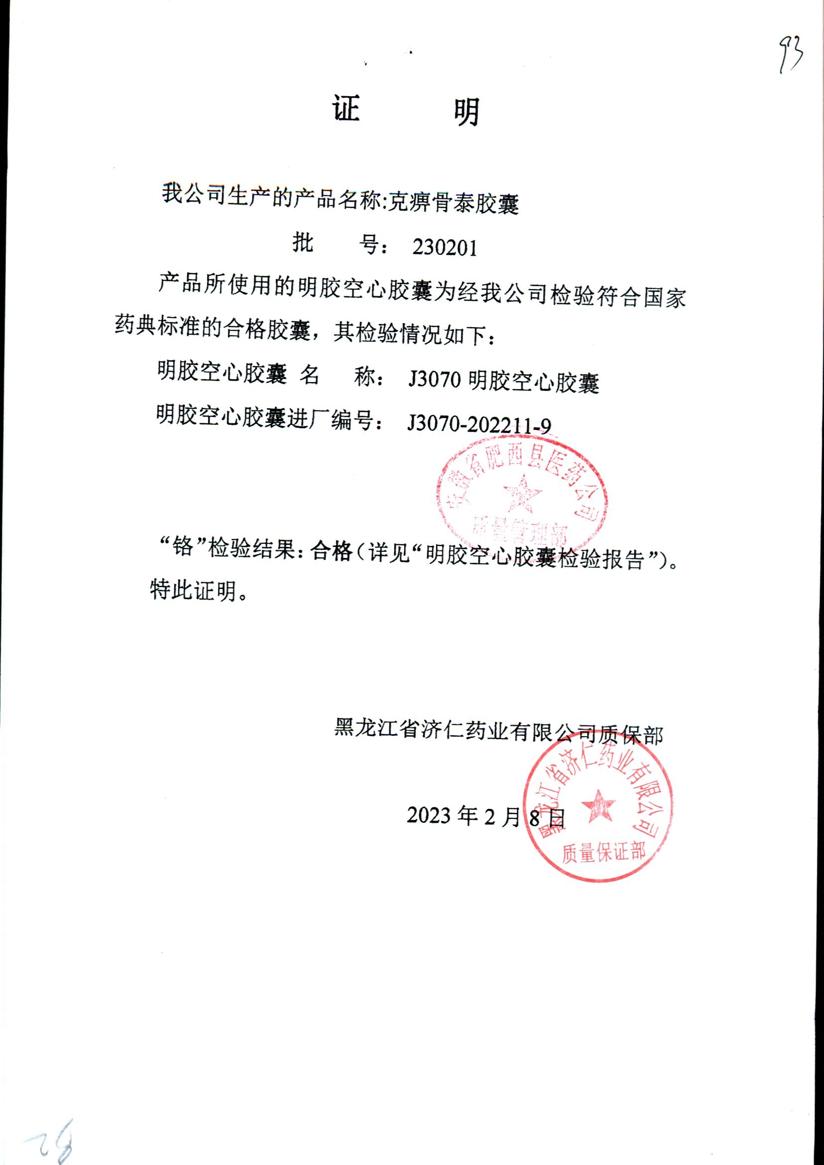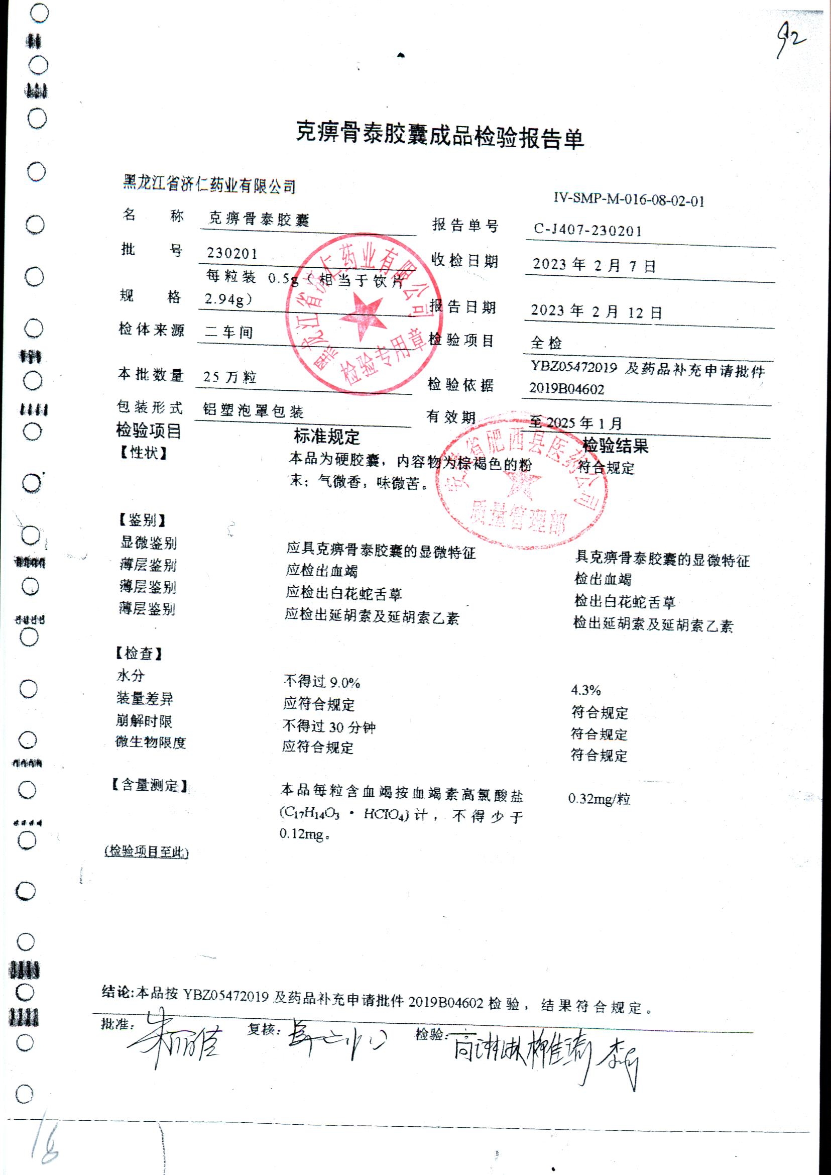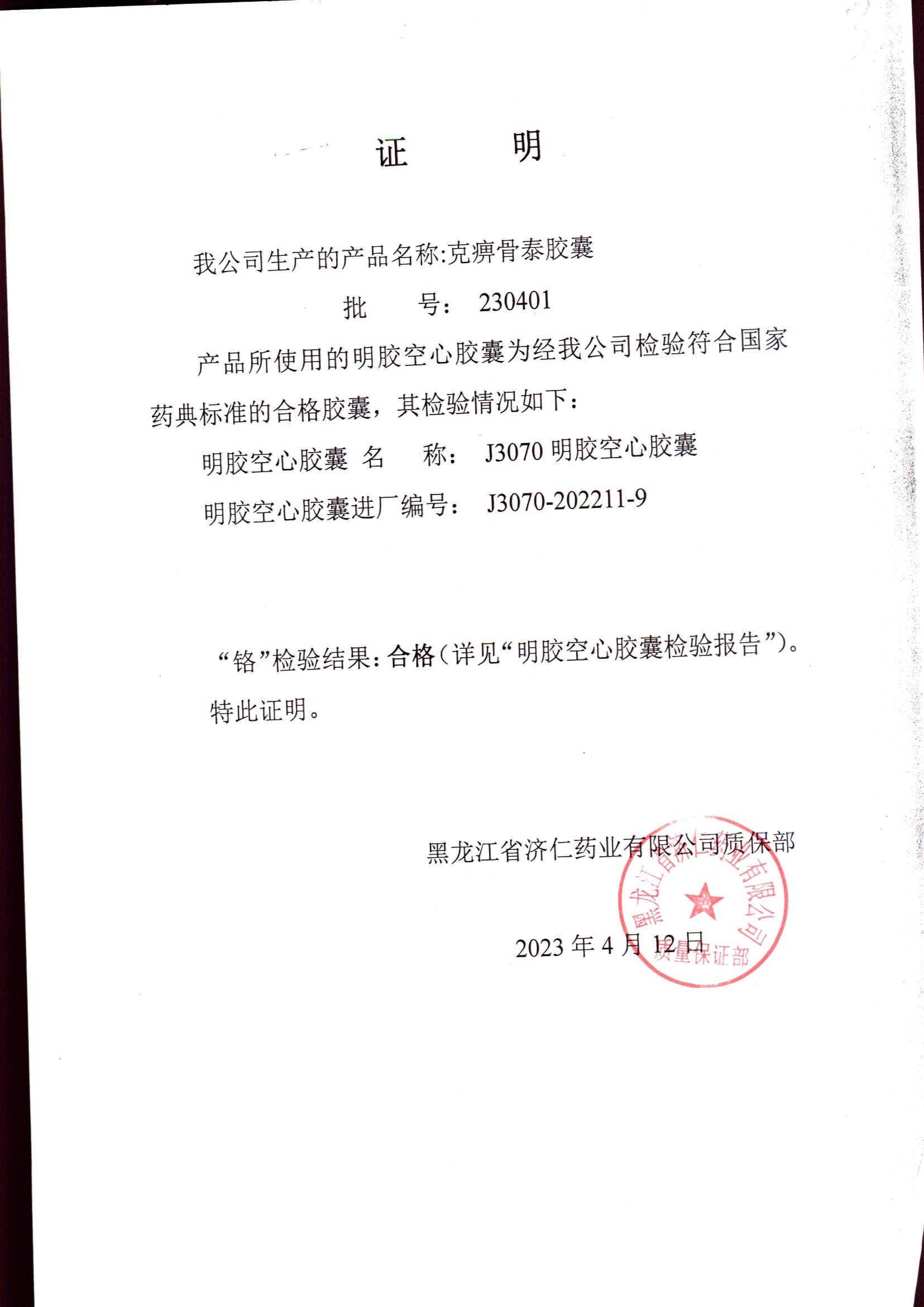 | 克痹骨泰胶囊 | 0.5g*12s*4板 | 201005(2/3) | 查看详情 |