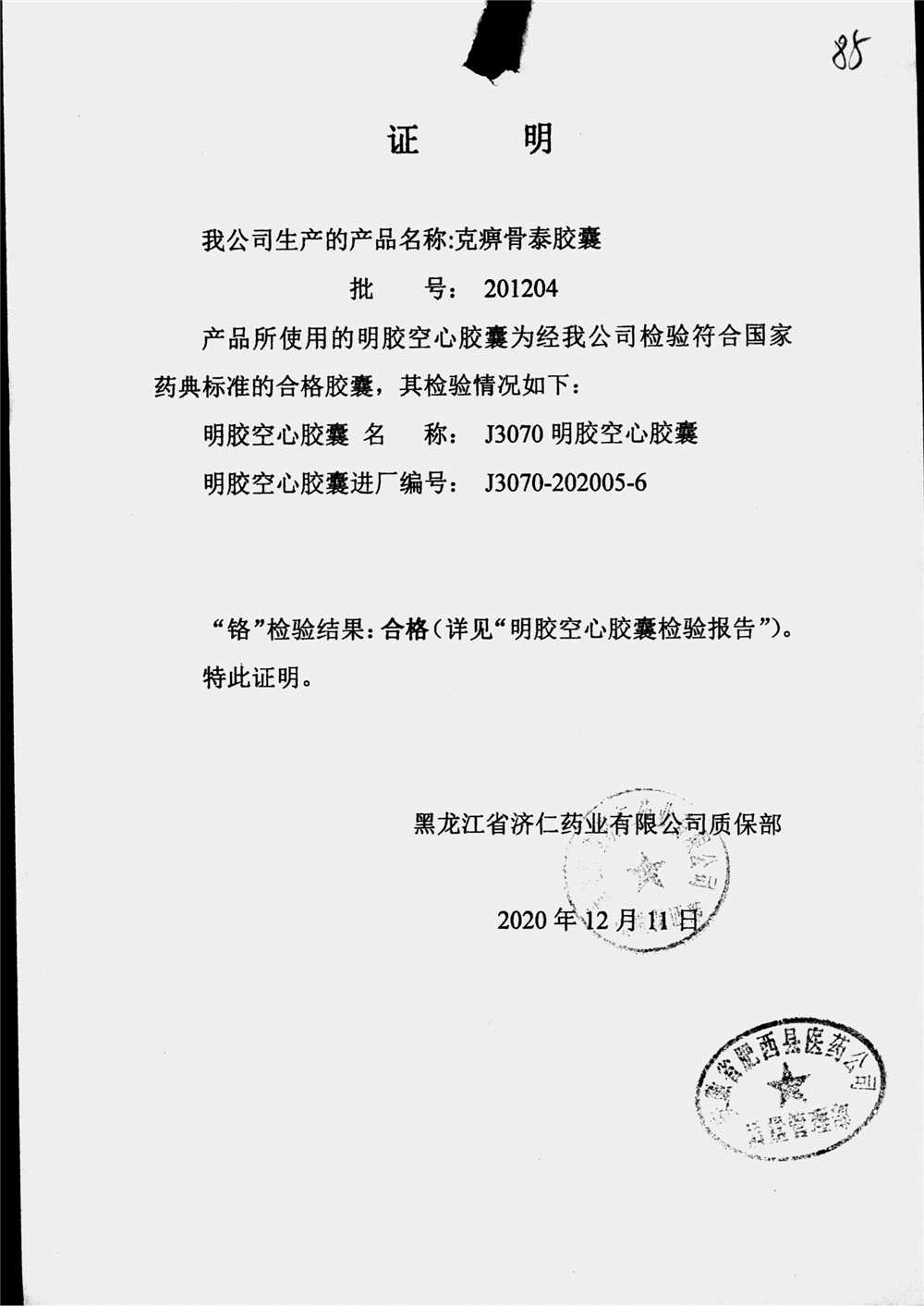 | 克痹骨泰胶囊 | 0.5g*12s*4板 | 201204(2/3) | 查看详情 |