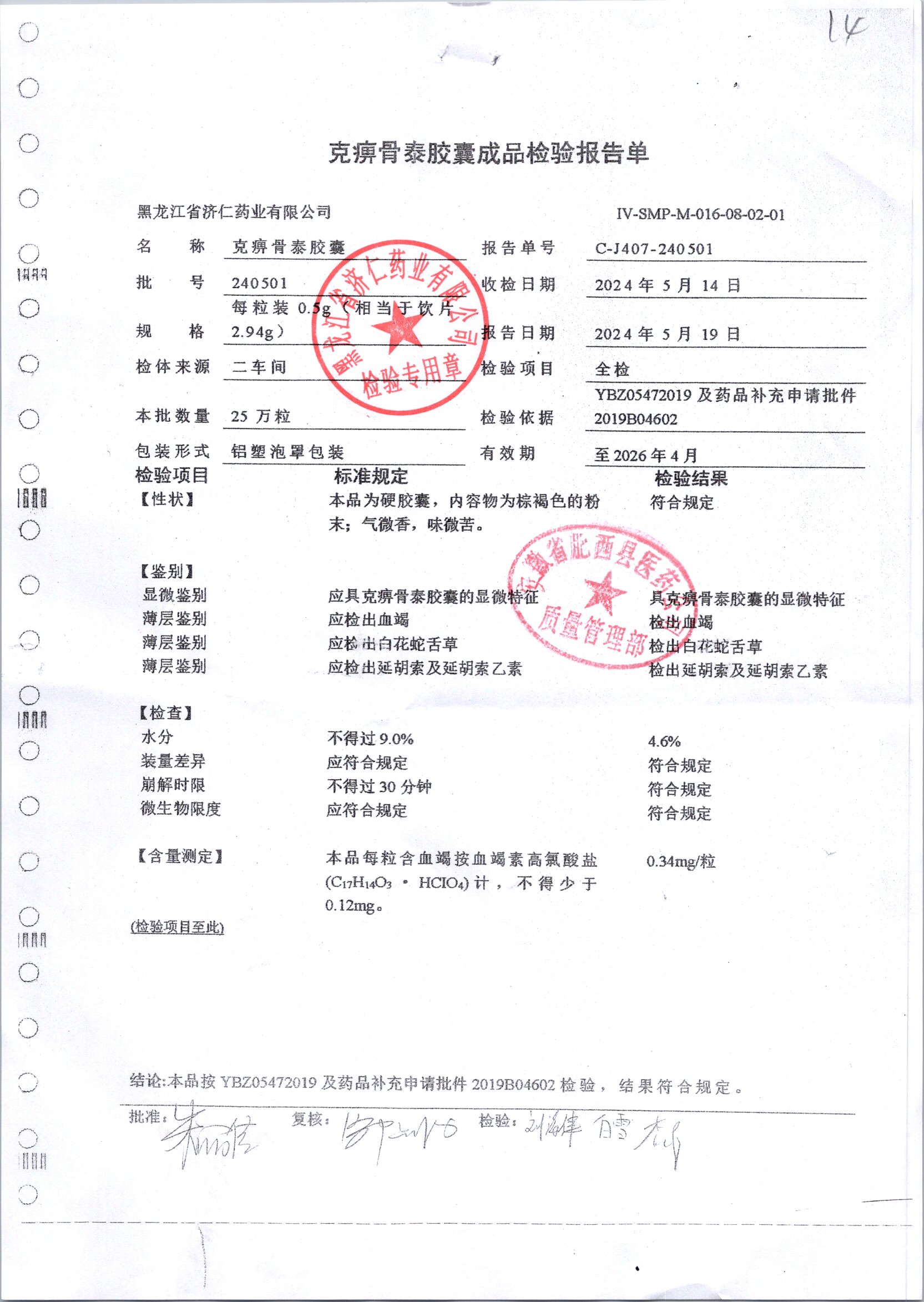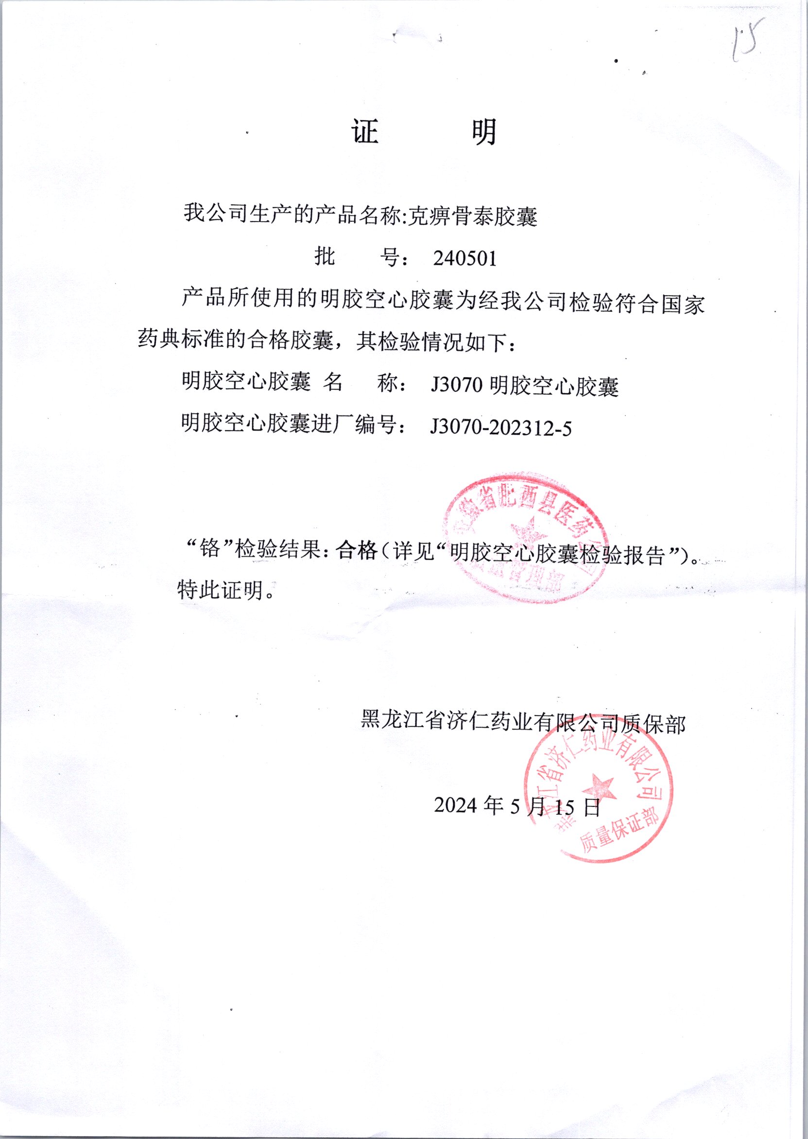 | 克痹骨泰胶囊 | 0.5g*12s*4板 | 240501/2 | 查看详情 |