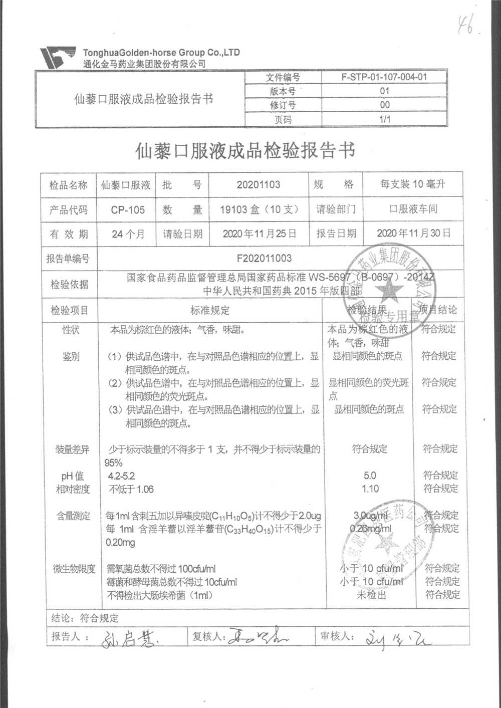 | 仙藜口服液 | 10ml*10支 | 20201103 | 查看详情 |