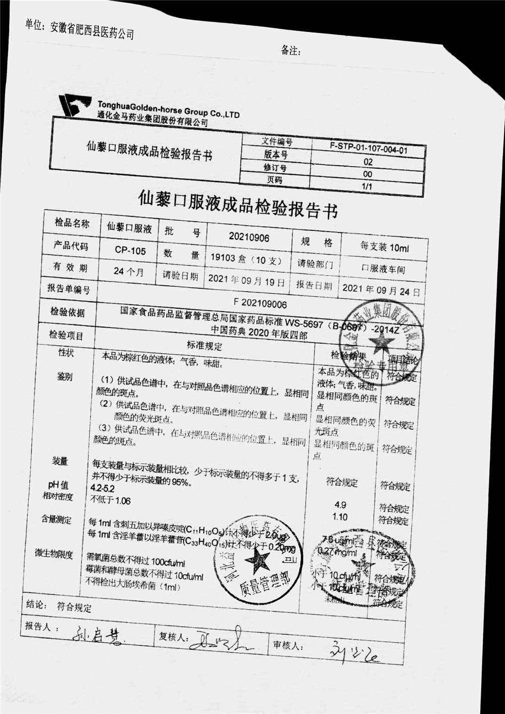 | 仙藜口服液 | 10ml*10支 | 20210906 | 查看详情 |