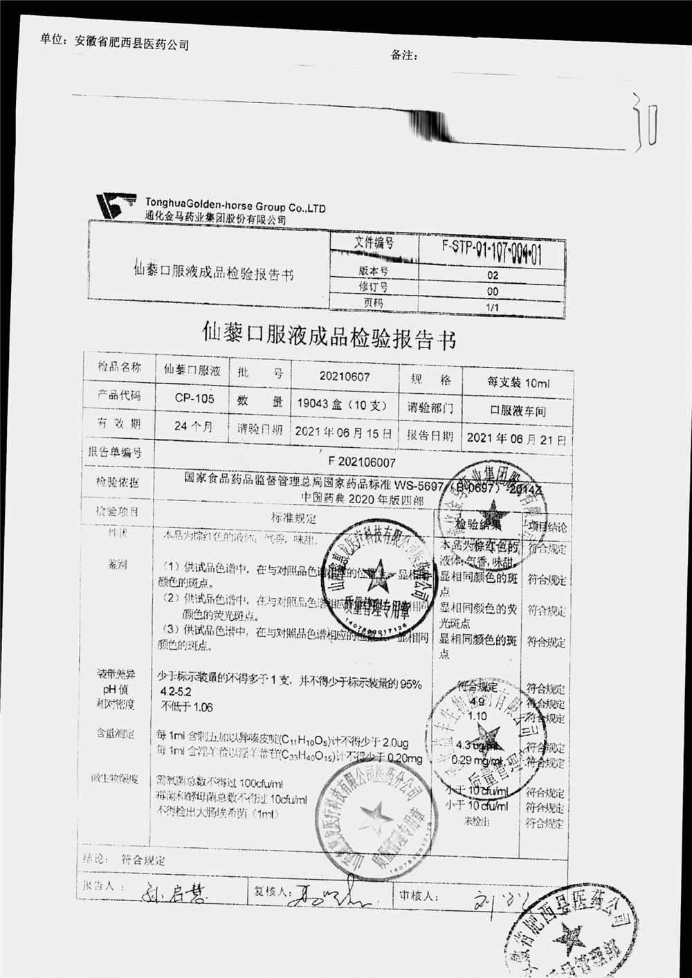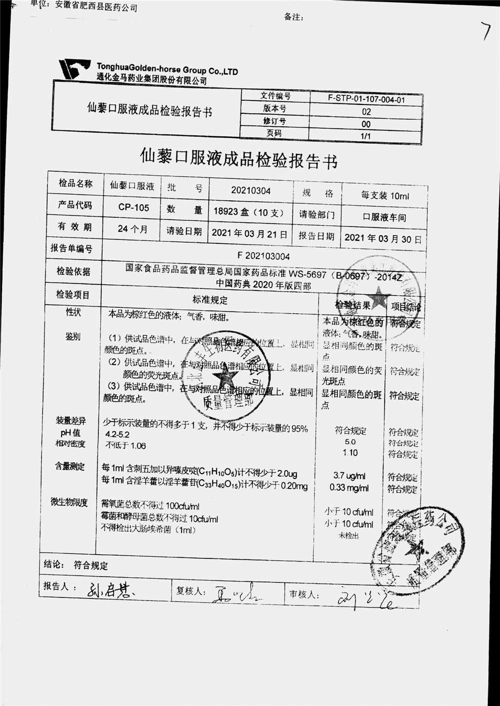 | 仙藜口服液 | 10ml*10支 | 20210607 | 查看详情 |