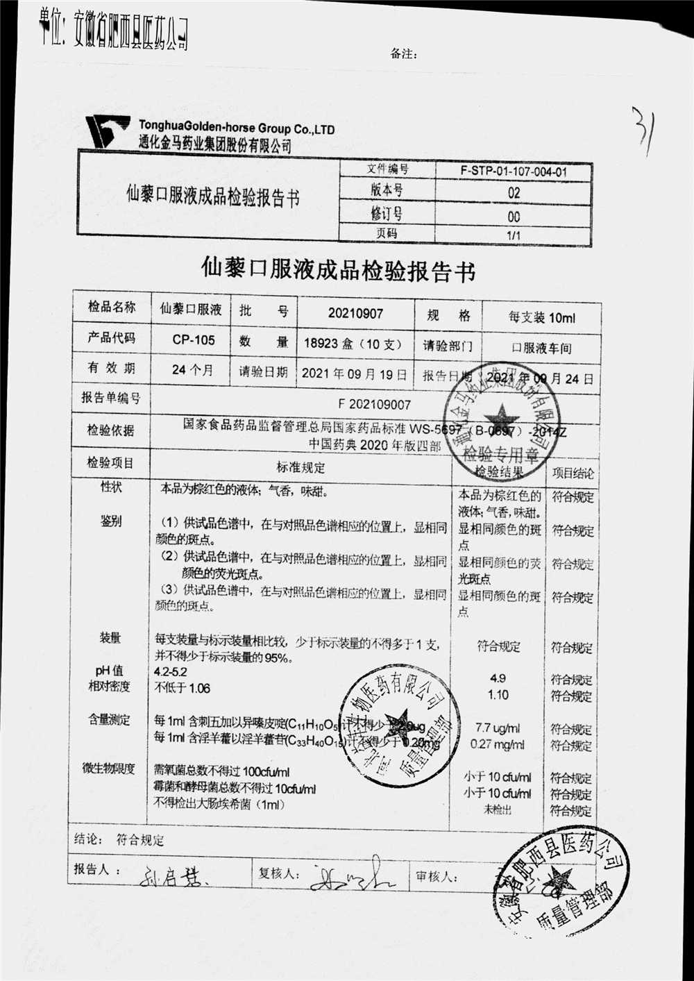 | 仙藜口服液 | 10ml*10支 | 20210907 | 查看详情 |