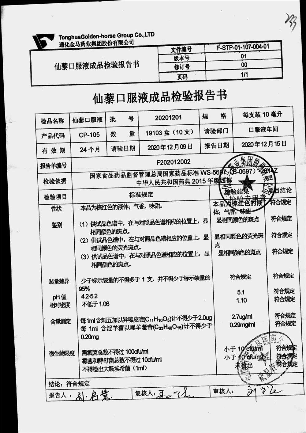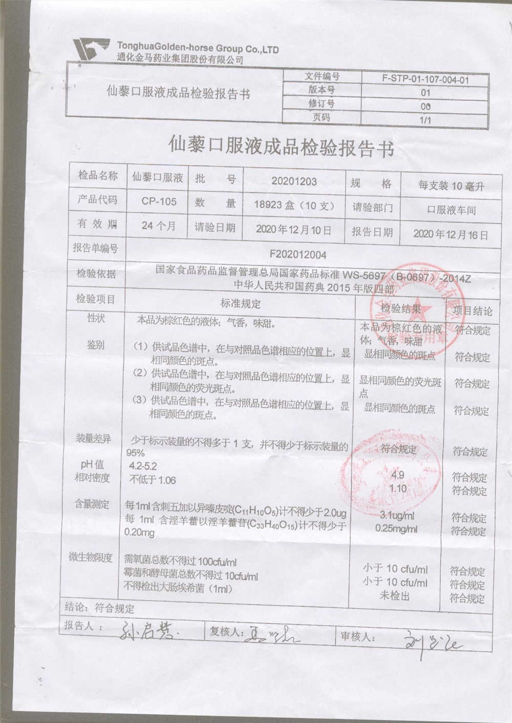 | 仙藜口服液 | 10ml*10支 | 20201203 | 查看详情 |