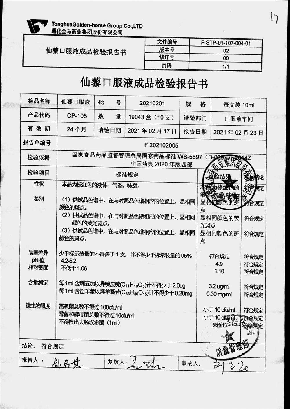 | 仙藜口服液 | 10ml*10支 | 20210201 | 查看详情 |