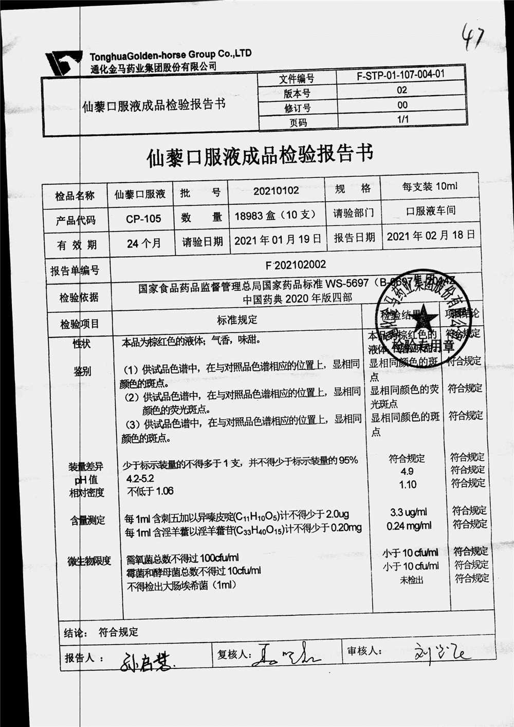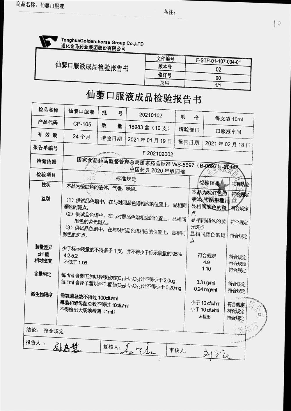 | 仙藜口服液 | 10ml*10支 | 20210102 | 查看详情 |