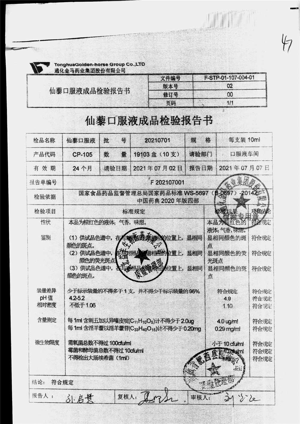 | 仙藜口服液 | 10ml*10支 | 20210701 | 查看详情 |