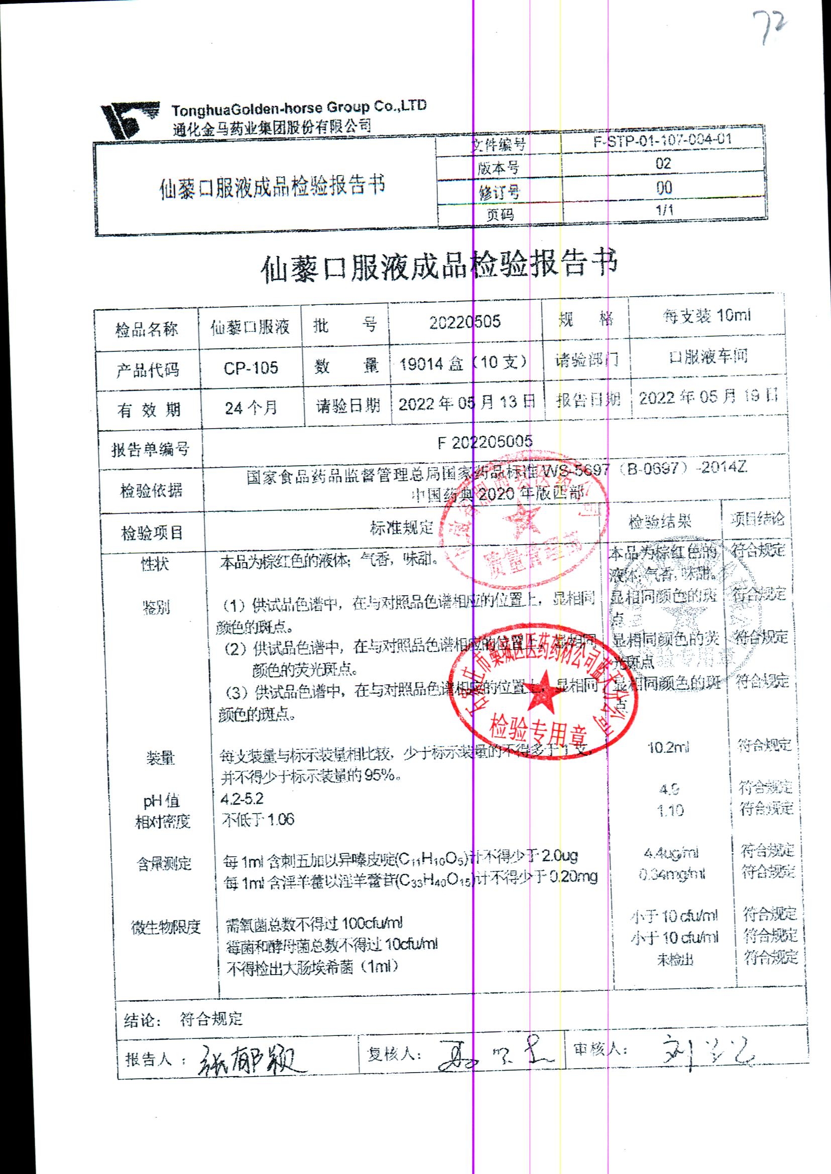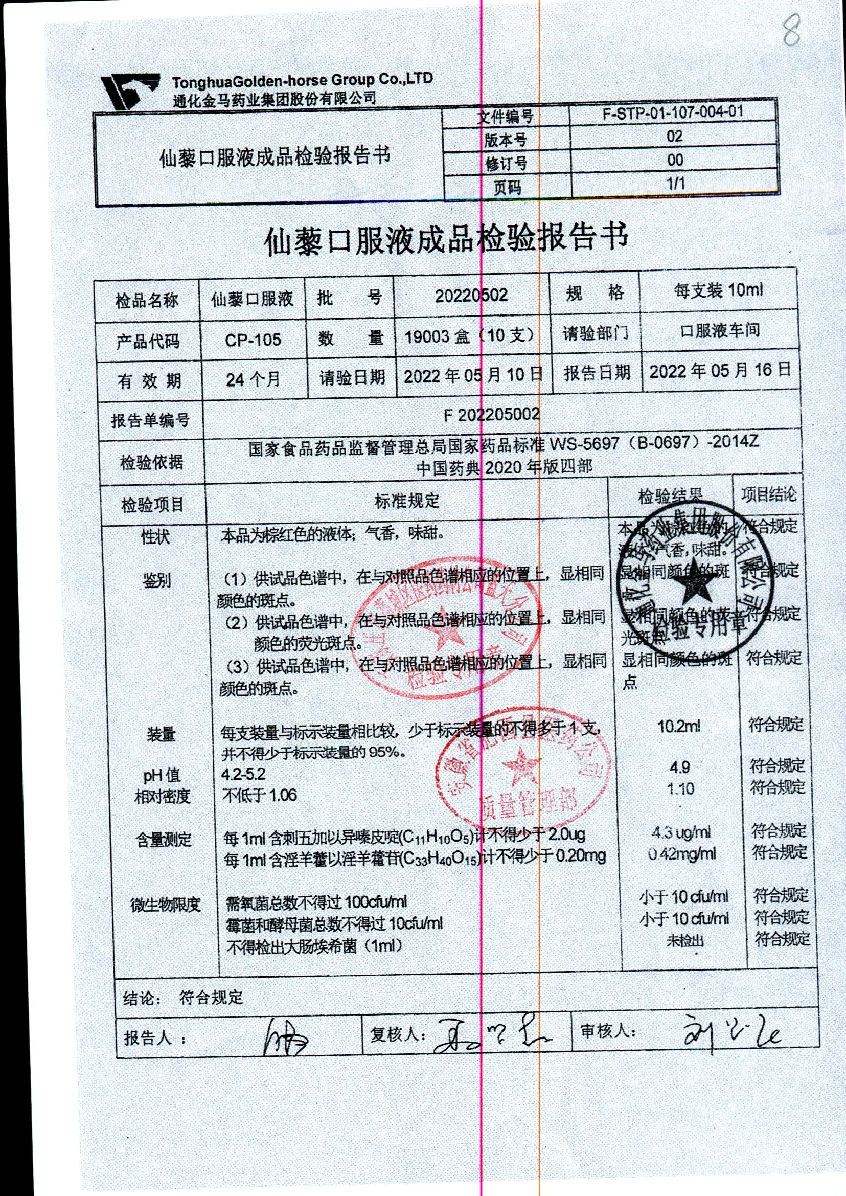 | 仙藜口服液 | 10ml*10支 | 20220502 | 查看详情 |