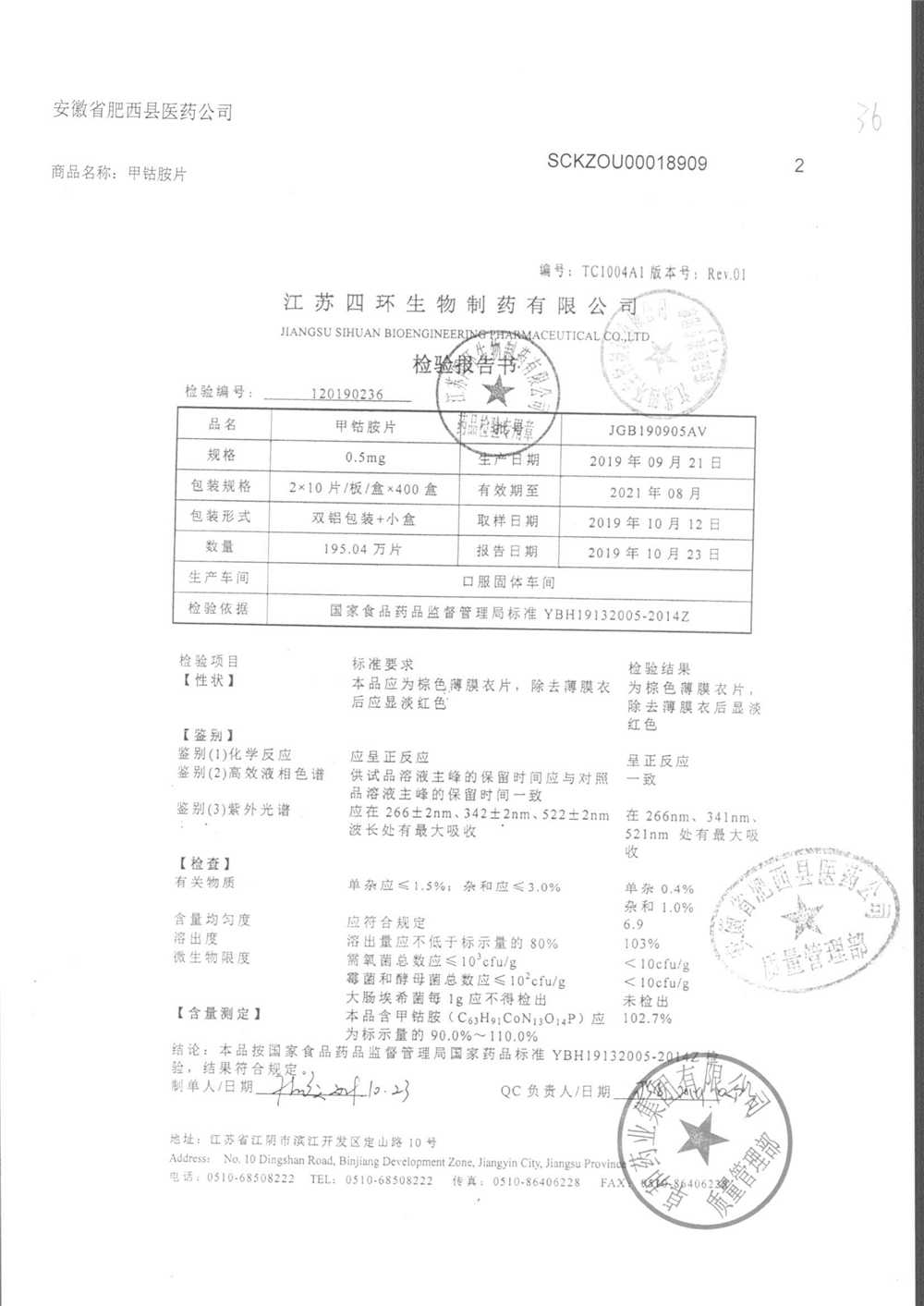 | 甲钴胺片 | 0.5mg | JGB190905AV | 查看详情 |