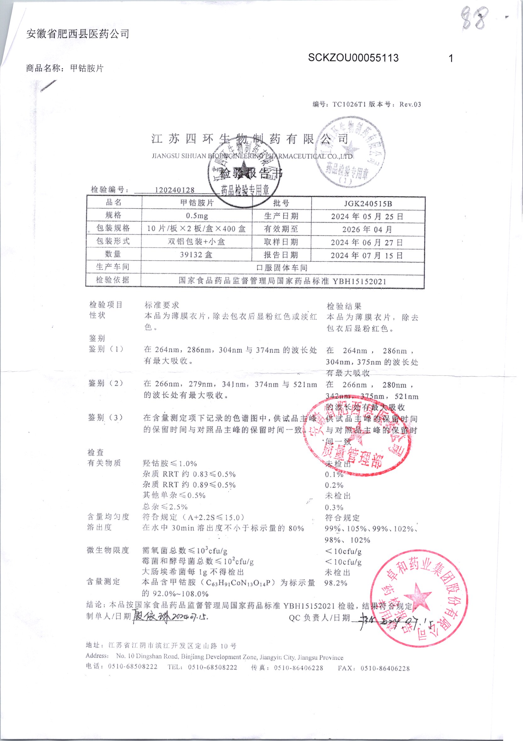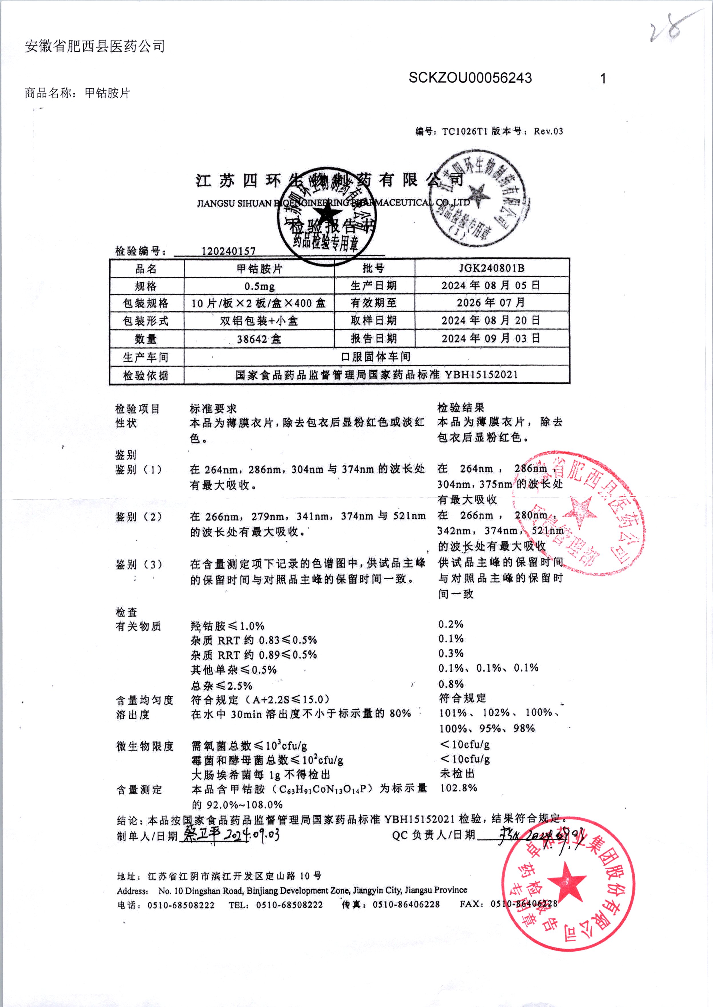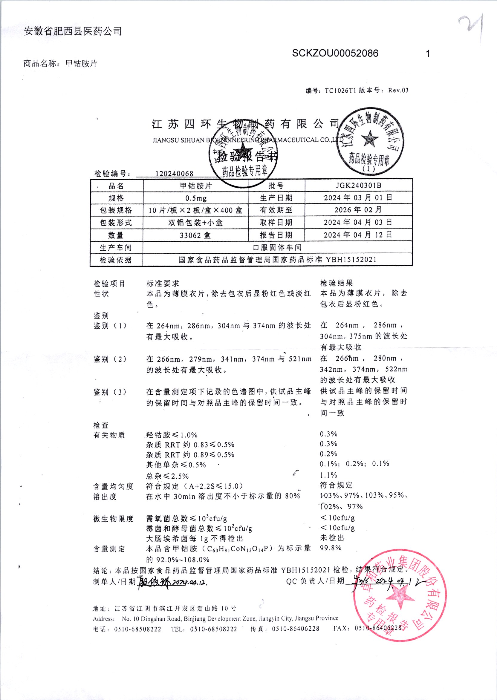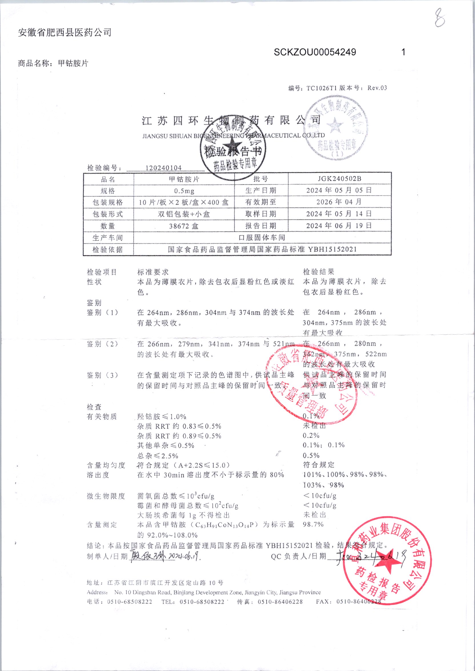 | 甲钴胺片 | 0.5mg | JGK240515B | 查看详情 |
