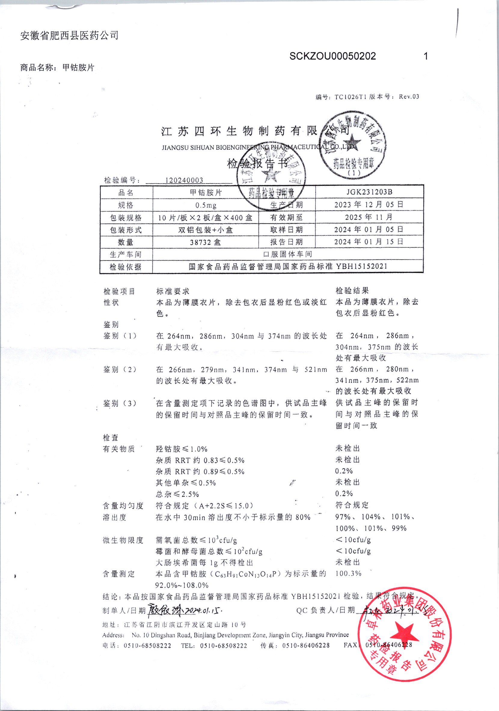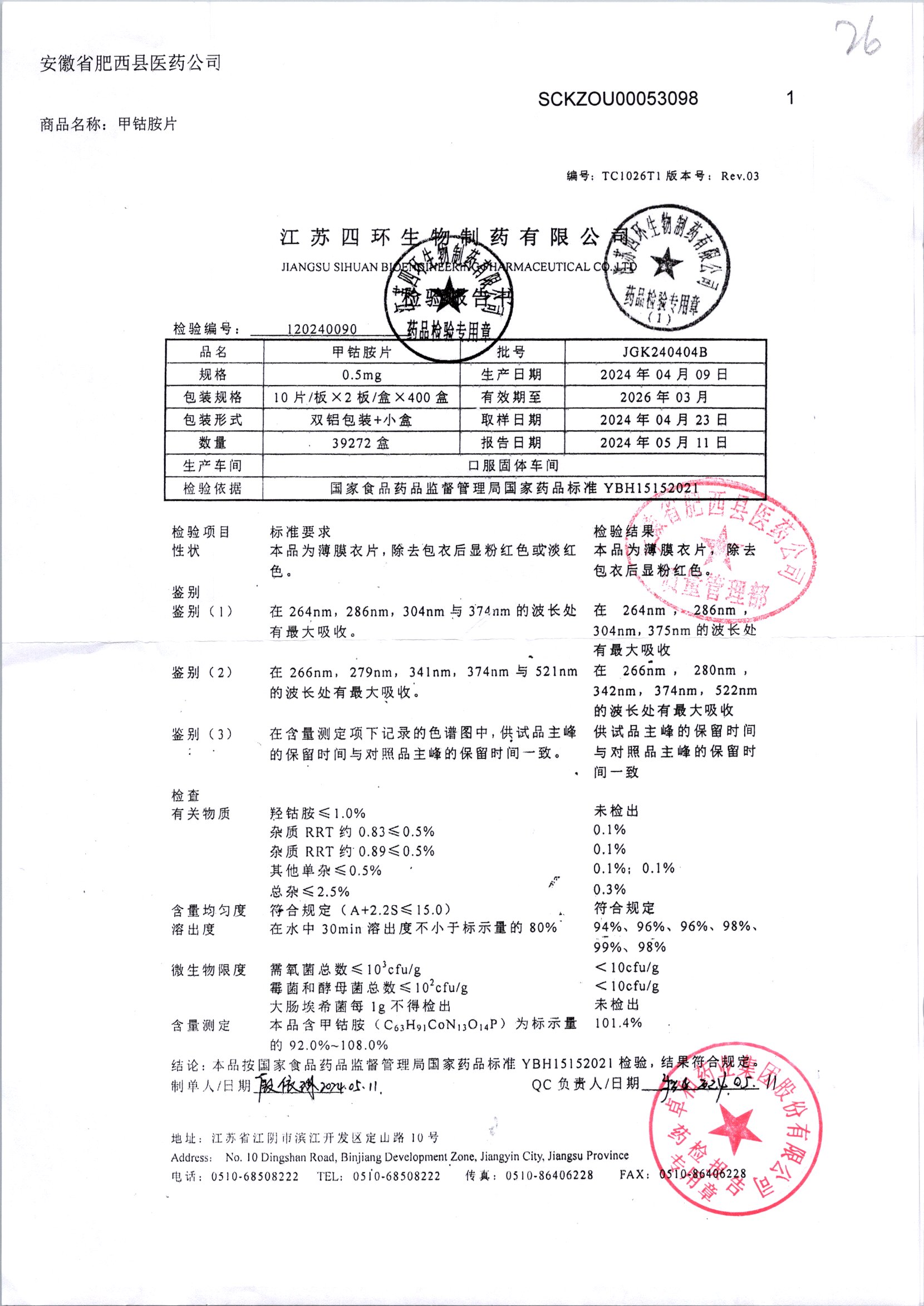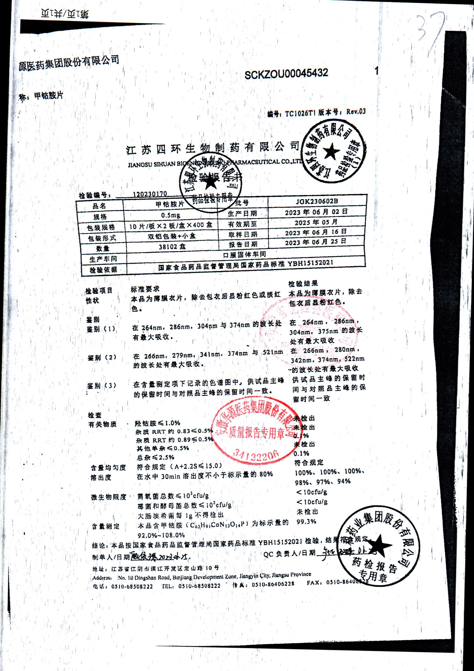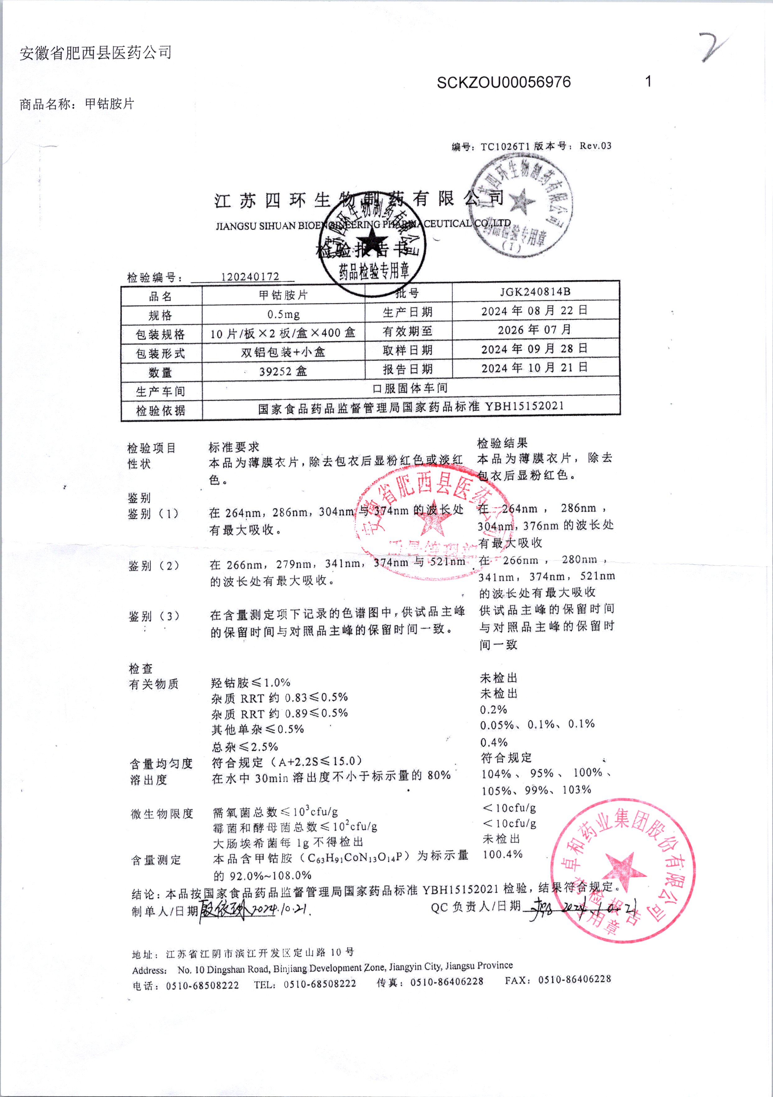 | 甲钴胺片 | 0.5mg | JGK240515B | 查看详情 |
