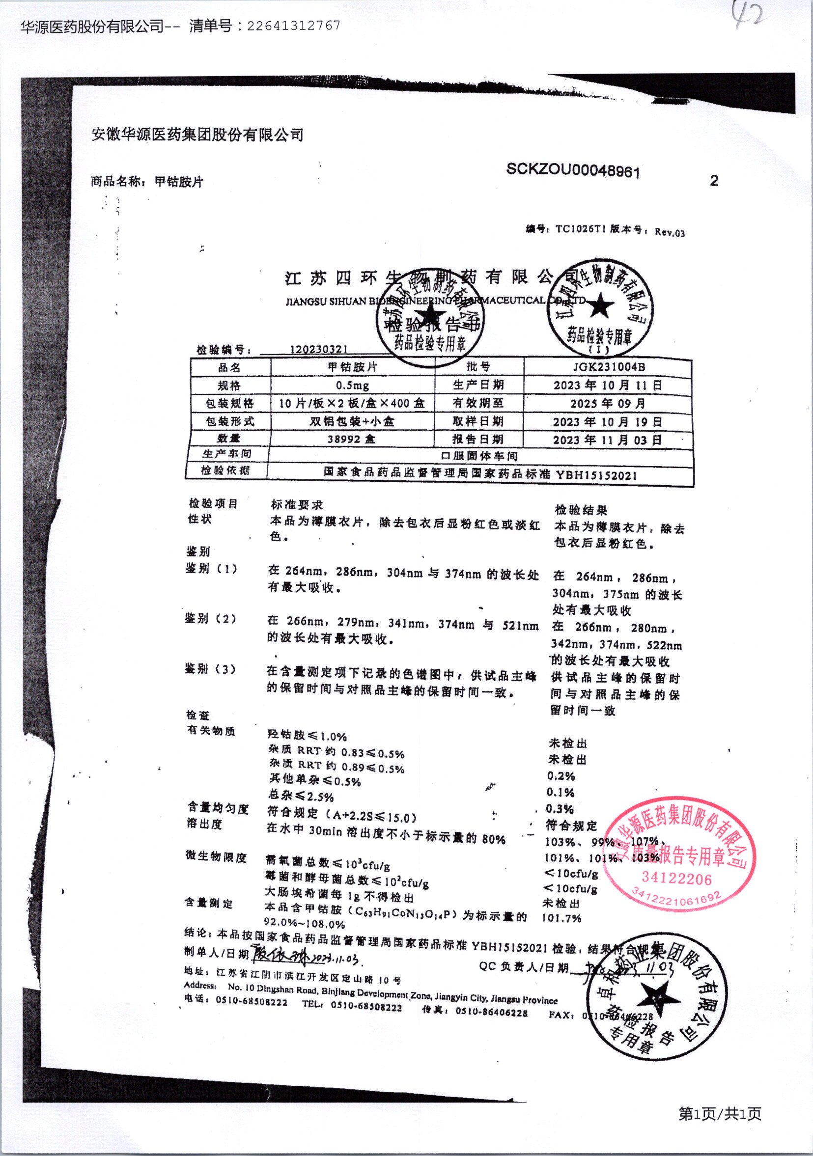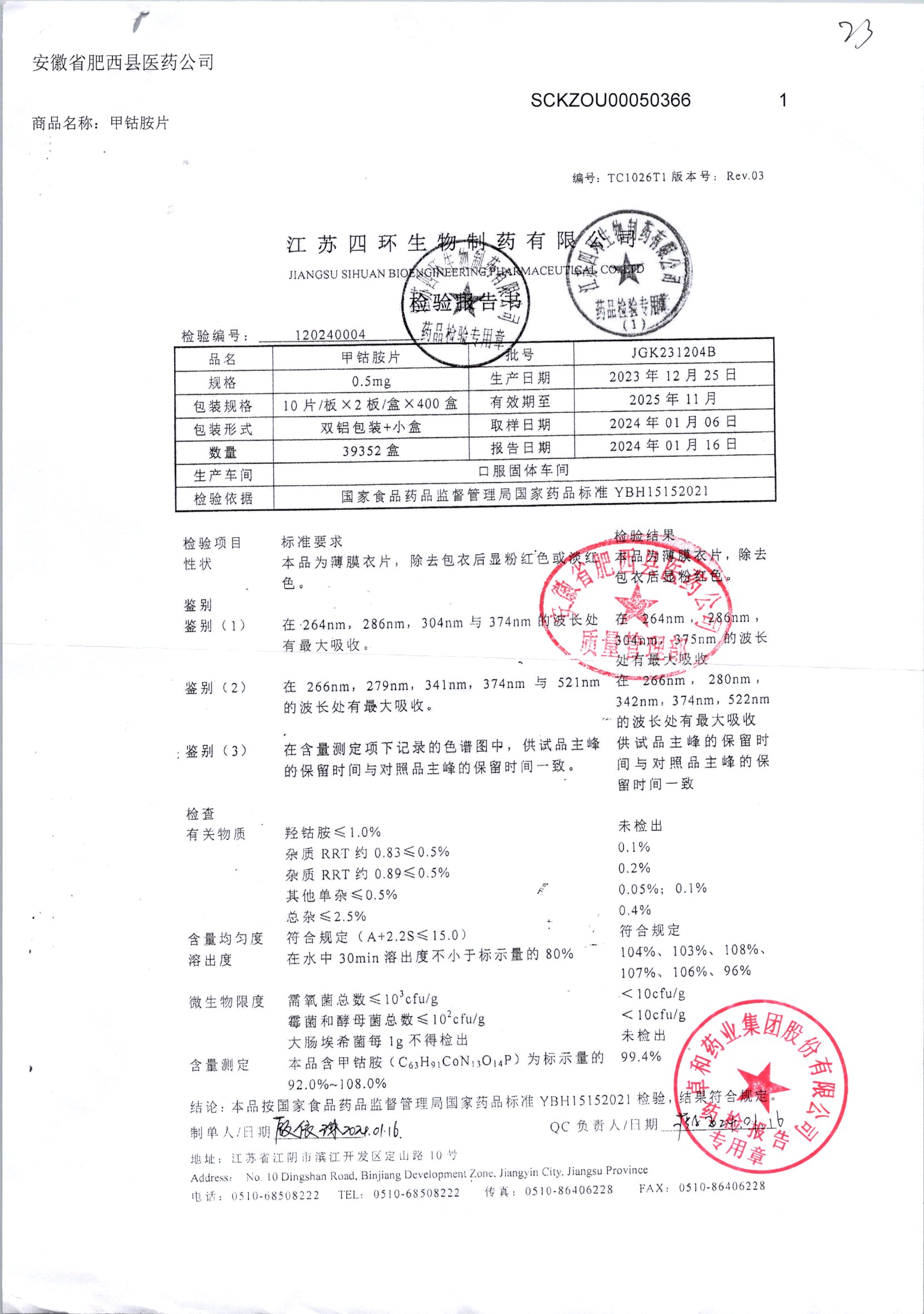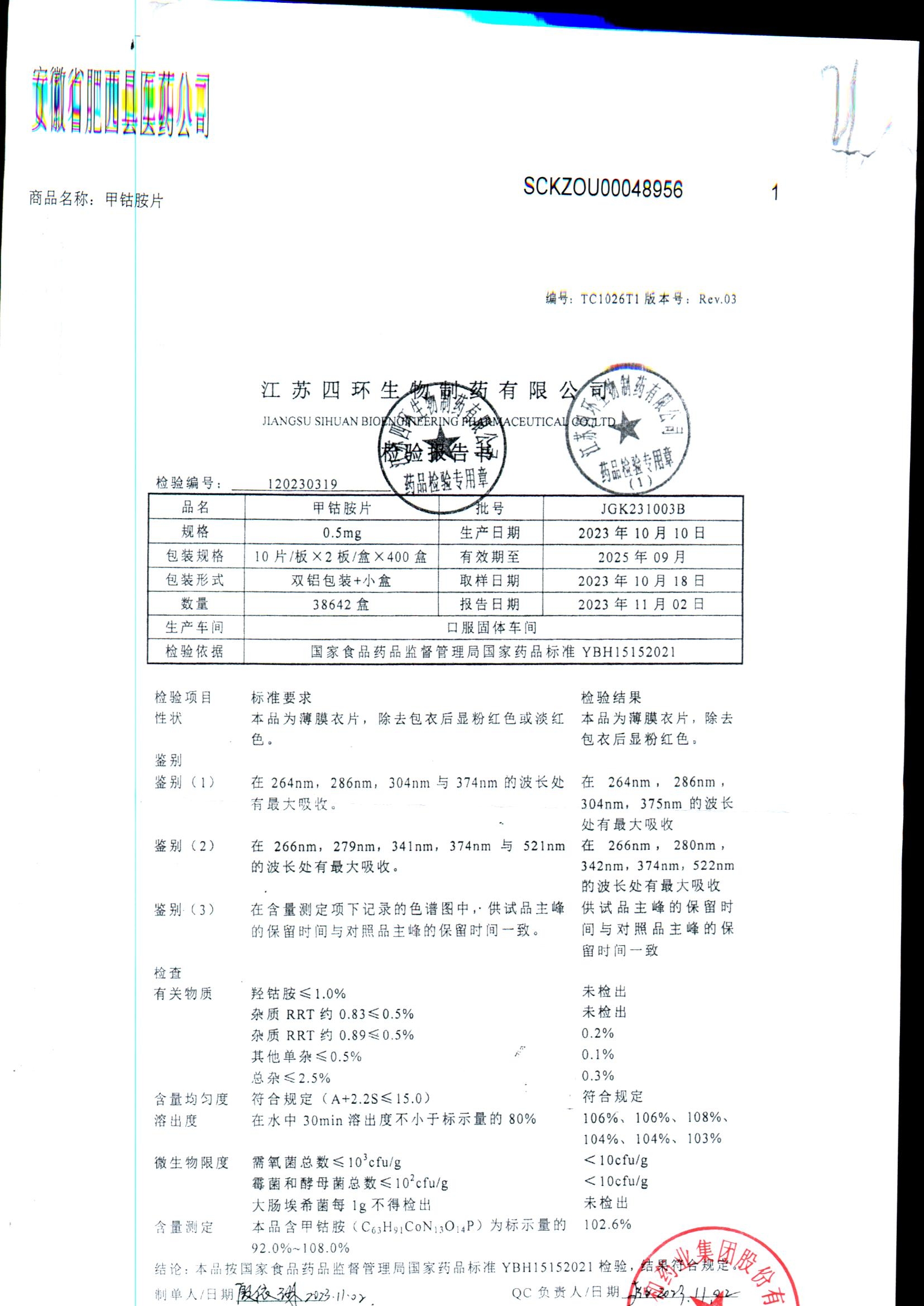 | 甲钴胺片 | 0.5mg | JGK231204B | 查看详情 |