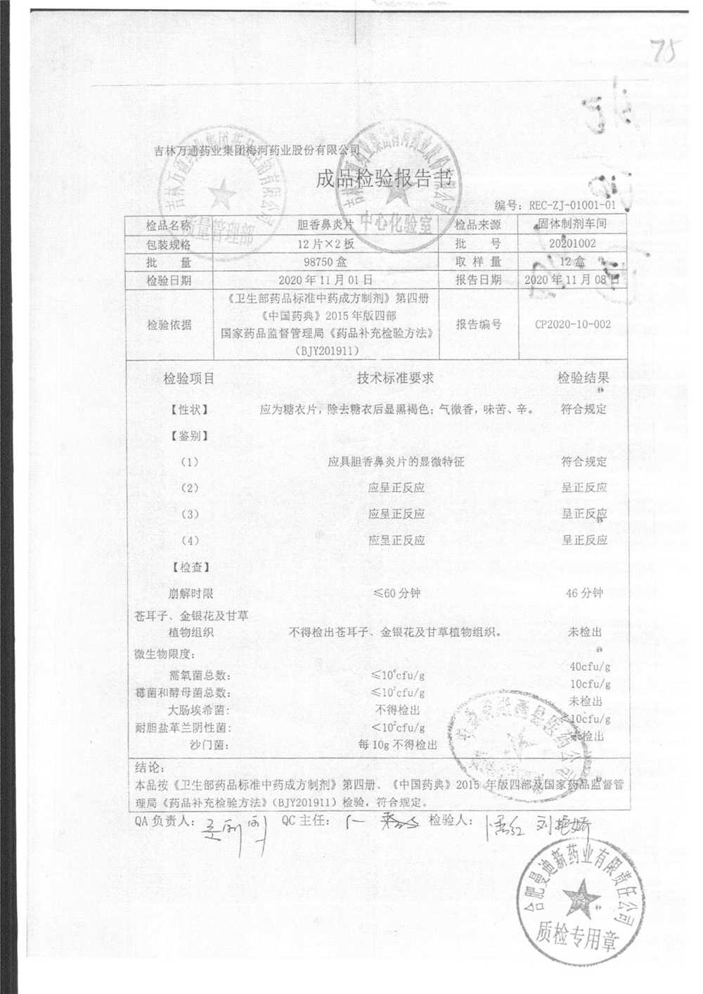 | 胆香鼻炎片 | 12*2 | 20201002 | 查看详情 |